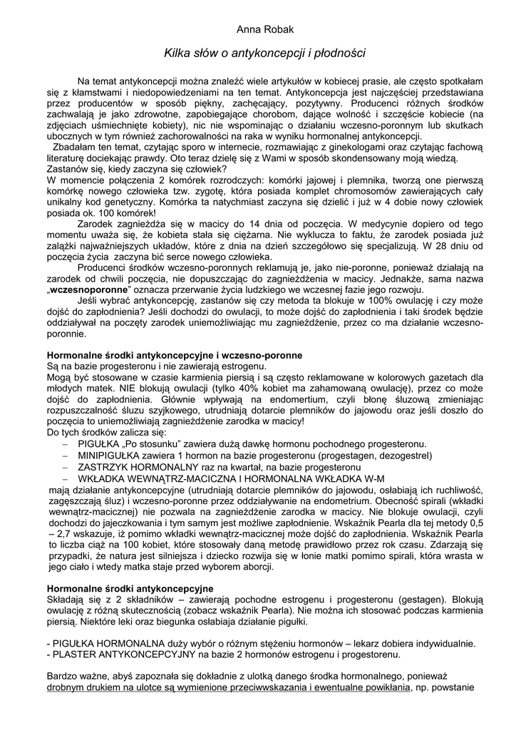 Anna Robak Kilka słów o antykoncepcji i płodności Na temat antykoncepcji można znaleźć wiele artykułów w kobiecej prasie, ale często spotkałam się z kłamstwami i niedopowiedzeniami na ten temat. Antykoncepcja jest najczęściej przedstawiana przez producentów w sposób piękny, zachęcający, pozytywny. Producenci różnych środków zachwalają je jako zdrowotne, zapobiegające chorobom, dające wolność i szczęście kobiecie (na zdjęciach uśmiechnięte kobiety), nic nie wspominając o działaniu wczesno-poronnym lub skutkach ubocznych w tym również zachorowalności na raka w wyniku hormonalnej antykoncepcji. Zbadałam ten temat, czytając sporo w internecie, rozmawiając z ginekologami oraz czytając fachową literaturę dociekając prawdy. Oto teraz dzielę się z Wami w sposób skondensowany moją wiedzą. Zastanów się, kiedy zaczyna się człowiek? W momencie połączenia 2 komórek rozrodczych: komórki jajowej i plemnika, tworzą one pierwszą komórkę nowego człowieka tzw. zygotę, która posiada komplet chromosomów zawierających cały unikalny kod genetyczny. Komórka ta natychmiast zaczyna się dzielić i już w 4 dobie nowy człowiek posiada ok. 100 komórek! Zarodek zagnieżdża się w macicy do 14 dnia od poczęcia. W medycynie dopiero od tego momentu uważa się, że kobieta stała się ciężarna. Nie wyklucza to faktu, że zarodek posiada już zalążki najważniejszych układów, które z dnia na dzień szczegółowo się specjalizują. W 28 dniu od poczęcia życia zaczyna bić serce nowego człowieka. Producenci środków wczesno-poronnych reklamują je, jako nie-poronne, ponieważ działają na zarodek od chwili poczęcia, nie dopuszczając do zagnieżdżenia w macicy. Jednakże, sama nazwa „wczesnoporonne” oznacza przerwanie życia ludzkiego we wczesnej fazie jego rozwoju. Jeśli wybrać antykoncepcję, zastanów się czy metoda ta blokuje w 100% owulację i czy może dojść do zapłodnienia? Jeśli dochodzi do owulacji, to może dojść do zapłodnienia i taki środek będzie oddziaływał na poczęty zarodek uniemożliwiając mu zagnieżdżenie, przez co ma działanie wczesnoporonnie. Hormonalne środki antykoncepcyjne i wczesno-poronne Są na bazie progesteronu i nie zawierają estrogenu. Mogą być stosowane w czasie karmienia piersią i są często reklamowane w kolorowych gazetach dla młodych matek. NIE blokują owulacji (tylko 40% kobiet ma zahamowaną owulację), przez co może dojść do zapłodnienia. Głównie wpływają na endomertium, czyli błonę śluzową zmieniając rozpuszczalność śluzu szyjkowego, utrudniają dotarcie plemników do jajowodu oraz jeśli doszło do poczęcia to uniemożliwiają zagnieżdżenie zarodka w macicy! Do tych środków zalicza się: − PIGUŁKA „Po stosunku” zawiera dużą dawkę hormonu pochodnego progesteronu. − MINIPIGUŁKA zawiera 1 hormon na bazie progesteronu (progestagen, dezogestrel) − ZASTRZYK HORMONALNY raz na kwartał, na bazie progesteronu − WKŁADKA WEWNĄTRZ-MACICZNA I HORMONALNA WKŁADKA W-M mają działanie antykoncepcyjne (utrudniają dotarcie plemników do jajowodu, osłabiają ich ruchliwość, zagęszczają śluz) i wczesno-poronne przez oddziaływanie na endometrium. Obecność spirali (wkładki wewnątrz-macicznej) nie pozwala na zagnieżdżenie zarodka w macicy. Nie blokuje owulacji, czyli dochodzi do jajeczkowania i tym samym jest możliwe zapłodnienie. Wskaźnik Pearla dla tej metody 0,5 – 2,7 wskazuje, iż pomimo wkładki wewnątrz-macicznej może dojść do zapłodnienia. Wskaźnik Pearla to liczba ciąż na 100 kobiet, które stosowały daną metodę prawidłowo przez rok czasu. Zdarzają się przypadki, że natura jest silniejsza i dziecko rozwija się w łonie matki pomimo spirali, która wrasta w jego ciało i wtedy matka staje przed wyborem aborcji. Hormonalne środki antykoncepcyjne Składają się z 2 składników – zawierają pochodne estrogenu i progesteronu (gestagen). Blokują owulację z różną skutecznością (zobacz wskaźnik Pearla). Nie można ich stosować podczas karmienia piersią. Niektóre leki oraz biegunka osłabiaja działanie pigułki. - PIGUŁKA HORMONALNA duży wybór o różnym stężeniu hormonów – lekarz dobiera indywidualnie. - PLASTER ANTYKONCEPCYJNY na bazie 2 hormonów estrogenu i progestorenu. Bardzo ważne, abyś zapoznała się dokładnie z ulotką danego środka hormonalnego, ponieważ drobnym drukiem na ulotce są wymienione przeciwwskazania i ewentualne powikłania, np. powstanie zakrzepicy żylnej. Układ hormonalny jest powiązany z innymi układami w organizmie i każda sztuczna ingerencja przynosi skutki uboczne!!! Prezerwatywa Prezerwatywa nie ingeruje w organizm kobiety tak poważnie jaki hormonalna antykoncepcja oraz nie zabija poczętego życia ludzkiego. Dla komfortu można do tego stosować środki nawilżające np. Feminum, dostępne w aptece. Prezerwatywa ma 99% skuteczności, jednak te gorszej jakości pękają. Metody naturalne Stosując metody naturalne kobieta rozpoznaje czas płodny i małżonkowie podejmują decyzję o współżyciu w tych dniach lub wstrzemięźliwości, lub zastosowaniu prezerwatywy. Jak kobieta może rozpoznać owulację? • Na kilka dni przed owulacją pojawia się płodny śluz, który ma zadanie odżywiać plemniki oraz pomóc im w transporcie do komórki jajowej. W dniu owulacji jest tak zwany szczyt śluzu. Jest on obfity, rozciągliwy, przezroczysty. Po owulacji śluz staje się gęsty, suchy. • Każda kobieta może zaobserwować u siebie przebieg cyklu oraz moment owulacji stosując codzienne mierzenie temperatury ciała. Kiedy następuje owulacja (uwolnienie komórki jajowej) zwiększa się wydzielanie progesteronu. Następuje podwyższenie temperatury ciała, aby stworzyć jak najlepsze warunki dla potencjalnego zarodka. Temperaturę należy mierzyć rano po przebudzeniu, nie wstając z łóżka, zawsze o tej samej porze, tym samym termometrem i w tym sa