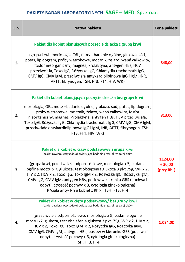 PAKIETY BADAŃ LABORATORYJNYCH SAGE – MED Sp. z o.o. L.p. Nazwa pakietu Cena pakietu Pakiet dla kobiet planujących poczęcie dziecka z grupą krwi 1. (grupa krwi, morfologia, OB., mocz - badanie ogólne, glukoza, sód, potas, lipidogram, próby wątrobowe, mocznik, żelazo, wapń całkowity, fosfor nieorganiczny, magnez, Prolaktyna, antygen HBs, HCV przeciwciała, Toxo IgG, Różyczka IgG, Chlamydia trachomatis IgG, CMV IgG, CMV IgM, przeciwciała antykardiolipinowe IgG i IgM, INR, APTT, fibrynogen, TSH, FT3, FT4, HIV, WR) 848,00 Pakiet dla kobiet planujących poczęcie dziecka bez grupy krwi 2. morfologia, OB., mocz –badanie ogólne, glukoza, sód, potas, lipidogram, próby wątrobowe, mocznik, żelazo, wapń całkowity, fosfor nieorganiczny, magnez. Prolaktyna, antygen HBs, HCV przeciwciała, Toxo IgG, Różyczka IgG, Chlamydia trachomatis IgG, CMV IgG, CMV IgM, przeciwciała antykardiolipinowe IgG i IgM, INR, APTT, fibrynogen, TSH, FT3, FT4, HIV, WR) 813,00 Pakiet dla kobiet w ciąży podstawowy z grupą krwi (pakiet zawiera wszystkie obowiązujące badania przez okres całej ciąży) 3. (grupa krwi, przeciwciała odpornościowe, morfologia x 5, badanie ogólne moczu x 7, glukoza, test obciążenia glukoza 3 pkt.75g, WR x 2, HIV x 2, HCV x 2, Toxo IgG, Toxo IgM x 2, Różyczka IgG, Różczyka IgM, CMV IgG, CMV IgM, antygen HBs, posiew w kierunku GBS (pochwa i odbyt), czystość pochwy x 3, cytologia ginekologiczna) P/ciała anty- Rh u kobiet z Rh(-), TSH, FT3, FT4 1124,00 + 30,00 (przy Rh-) Pakiet dla kobiet w ciąży podstawowy/ bez grupy krwi (pakiet zawiera wszystkie obowiązujące badania przez okres całej ciąży) 4. (przeciwciała odpornościowe, morfologia x 5, badanie ogólne moczu x7, glukoza, test obciążenia glukoza 3 pkt. 75g, WR x 2, HIV x 2, HCV x 2, Toxo IgG, Toxo IgM x 2, Różyczka IgG, Różczyka IgM, CMV IgG, CMV IgM, antygen HBs, posiew w kierunku GBS (pochwa i odbyt), czystość pochwy x 3, cytologia ginekologiczna) TSH, FT3, FT4 1,094,00 Pakiet dla kobiety w ciąży rozszerzony z grupą krwi (pakiet zawiera wszystkie obowiązujące badania przez okres całej ciąży) 5. (grupa krwi , przeciwciała odpornościowe, morfologia x 5, badanie ogólne moczu x 7, gukoza, test obciążenia glukozą 3 pkt 75g, WR x2, HIV x2, HCV x2, Toxo IgG, Toxo IgM, Różyczka IgG, Różyczka IgM, CMV IgG x1, CMV IgM x 2, antygen HBs, posiew w kierunku GBS (pochwa, odbyt), czystość pochwy x 3, cytologia ginekologiczna, sód, potas, lipidogram, próby wątrobowe, kreatynina, mocznik, żelazo, wapń całkowity, fosfor nieorganiczny, magnez, prolaktyna, TSH, FT3, FT4, INR, APTT, fibrynogen, beta HCG, Chlamydia trachomatis IgG i IgM) 1.515.00 + 30.00 (przy Rh-) Pakiet dla kobiety w ciąży rozszerzony bez grupy krwi (pakiet obowiązuje wszystkie badania przez cały okres ciąży) 6. (przeciwciała odpornościowe, morfologia x 5, badanie ogólne moczu x 7, gukoza, test obciążenia glukozą 3 pkt 75g, WR x2, HIV x2, HCV x2, Toxo IgG, Toxo IgM, Różyczka IgG, Różyczka IgM, CMV IgG x 1, CMV IgM x 2, antygen HBs, posiew w kierunku GBS (pochwa, odbyt), czystość pochwy x 3, cytologia ginekologiczna, sód, potas, lipidogram, próby wątrobowe, kreatynina, mocznik, żelazo, wapń całkowity, fosfor nieorganiczny, magnez, prolaktyna, TSH, FT3, FT4, INR, APTT, fibrynogen, beta HCG, Chlamydia trachomatis IgG i IgM) 1.480.00 7. Pakiet ginekologiczny podstawowy (czystość pochwy, cytologia ginekologiczna) 70,00 8. Pakiet ginekologiczny rozszerzony I (czystość pochwy, cytologia LBC, HPV, Chl. trach - wymaz) 410,00 9. Pakiet ginekologiczny rozszerzony II (czystość pochwy, cytologia LBC, HSV met.PCR jakościowo) 420,00 10. Pakiet młodej kobiety (podstawowy) (grupa krwi, morfologia krwi, CRP, TSH, mocz badanie ogólne, elektrolity, glukoza, prolaktyna, wapń całkowity, lipidogram) 208,00 Pakiet młodej kobiety (rozszerzony) 11. 12. (grupa krwi, morfologia krwi, CRP, TSH, FT3, FT4, mocz badanie ogólne, sód, potas, wapń całkowity, fosfor nieograniczony, glukoza, prolaktyna, lipidogram, próby wątrobowe, mocznik, kreatynina, kwas foliowy, witamina B12, INR, APTT, fibrynogen, ferrytyna, HIV, WR) 623,00 Pakiet młodej kobiety (podstawowy) + dodatkowo pakiet ginekologiczny (grupa krwi, morfologia krwi, CRP, TSH, mocz badanie ogólne, elektrolity, glukoza, prolaktyna, wapń całkowity, lipidogram, czystość pochwy, cytologia ginekologiczna) 278,00 Pakiet młodej kobiety (rozszerzony) + dodatkowo pakiet ginekologiczny 13. (grupa krwi, morfologia krwi, CRP, TSH, FT3, FT4, mocz badanie ogólne, sód, potas, wapń całkowity, fosfor nieograniczony, glukoza, prolaktyna, lipidogram, próby wątrobowe, mocznik, kreatynina, kwas foliowy, witamina B12, INR, APTT, fibrynogen, ferrytyna, HIV, WR, cytologia ginekologiczna, czystość pochwy) 693.00 Pakiet dla kobiet dojrzałych 14. ( mocz badanie ogólne, morfologia krwi, OB., glukoza, lipidogram, próby wątrobowe, sód, potas, mocznik, kreatynina, kwas moczowy, ferrytyna, wapń całkowity, fosfor nieorganiczny, magnez, hs CRP, kał na obecność krwi utajonej, TSH, prolaktyna, ostekalcyna, Ca 125, Ca 15-3, FSH, cytologia ginekologiczna) 570,00 Pakiet studencki 16. (grupa krwi, morfologia krwi, OB., mocz- badanie ogólne, TSH, sód, potas, lipidogram, Witamina B12, żelazo, bilirubina całkowita, HIV, WR, antygen HBs) 323,00 Pakiet badań podstawowych 17. (mocz badanie ogólne, OB., morfologia krwi, glukoza, cholesterol całkowity, ALT, mocznik) 90,00 Pakiet badań rozszerzony 18. (mocz badanie ogólne, OB., morfologia krwi, glukoza, sód, potas, lipid ogram, próby wątrobowe, mocznik, kreatynina, kwas moczowy, żelazo, TSH) 229,00 Pakiet przed zabiegiem chirurgicznym 19. (morfologia krwi, grupa krwi, INR, APTT, sód, potas, HBs przeciwciała, HCV przeciwciała) 189,00 Pakiet funkcji serca 20. (fibrynogen, D-dimery, sód, potas, lipidogram, CRP – ilościowo, CK, NT pro-BP, Homocysteina) 319,00 Pakiet reumatologiczny 21. (OB., morfologia krwi, kw