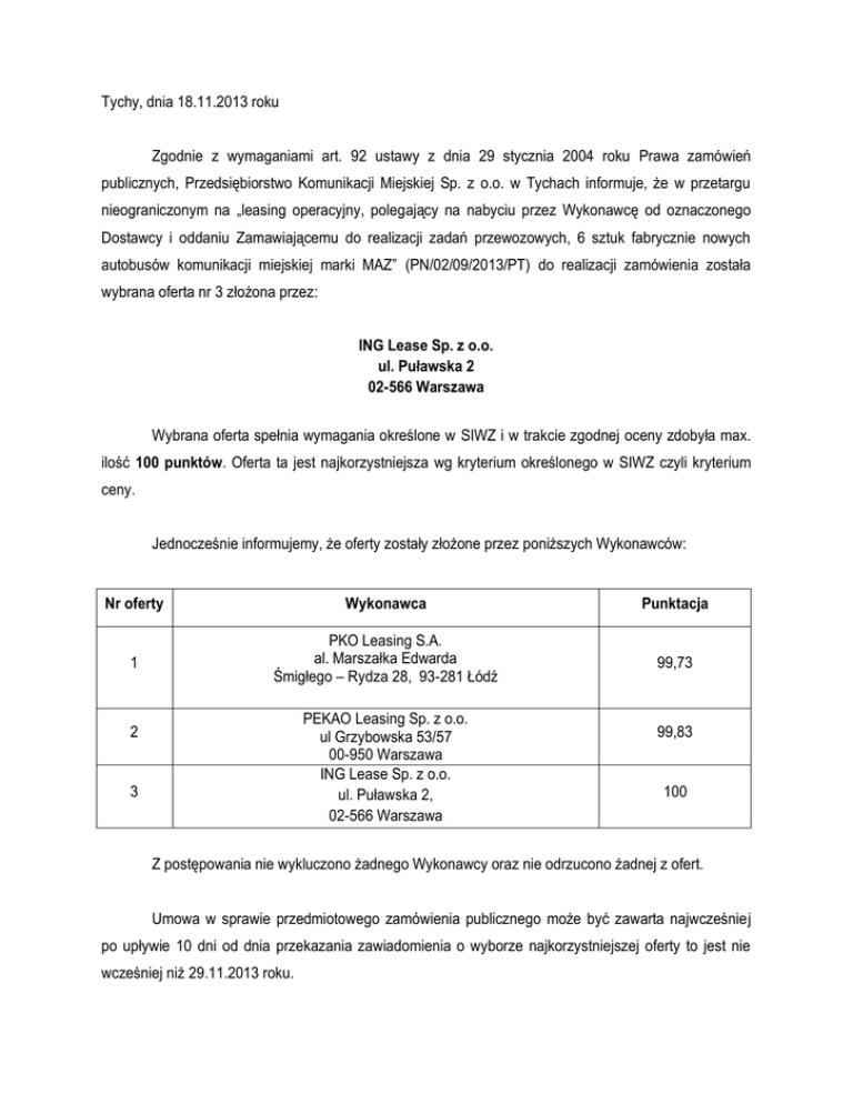 Tychy, dnia 18.11.2013 roku Zgodnie z wymaganiami art. 92 ustawy z dnia 29 stycznia 2004 roku Prawa zamówień publicznych, Przedsiębiorstwo Komunikacji Miejskiej Sp. z o.o. w Tychach informuje, że w przetargu nieograniczonym na „leasing operacyjny, polegający na nabyciu przez Wykonawcę od oznaczonego Dostawcy i oddaniu Zamawiającemu do realizacji zadań przewozowych, 6 sztuk fabrycznie nowych autobusów komunikacji miejskiej marki MAZ” (PN/02/09/2013/PT) do realizacji zamówienia została wybrana oferta nr 3 złożona przez: ING Lease Sp. z o.o. ul. Puławska 2 02-566 Warszawa Wybrana oferta spełnia wymagania określone w SIWZ i w trakcie zgodnej oceny zdobyła max. ilość 100 punktów. Oferta ta jest najkorzystniejsza wg kryterium określonego w SIWZ czyli kryterium ceny. Jednocześnie informujemy, że oferty zostały złożone przez poniższych Wykonawców: Nr oferty Wykonawca Punktacja 1 PKO Leasing S.A. al. Marszałka Edwarda Śmigłego – Rydza 28, 93-281 Łódź 99,73 PEKAO Leasing Sp. z o.o. ul Grzybowska 53/57 00-950 Warszawa ING Lease Sp. z o.o. ul. Puławska 2, 02-566 Warszawa 2 3 99,83 100 Z postępowania nie wykluczono żadnego Wykonawcy oraz nie odrzucono żadnej z ofert. Umowa w sprawie przedmiotowego zamówienia publicznego może być zawarta najwcześniej po upływie 10 dni od dnia przekazania zawiadomienia o wyborze najkorzystniejszej oferty to jest nie wcześniej niż 29.11.2013 roku.
