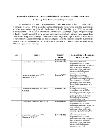Komunikat o zbędnych i zużytych składnikach rzeczowego majątku ruchomego Łódzkiego Urzędu Wojewódzkiego w Łodzi Na podstawie § 6 ust. 2 rozporządzenia Rady Ministrów z dnia 21 maja 2010 r. w sprawie sposobu i trybu gospodarowania składnikami rzeczowymi majątku ruchomego, w który wyposażone są jednostki budżetowe ( Dz.U. Nr 114, poz. 761) w związku z zarządzeniem Nr 10/2016 Dyrektora Generalnego Łódzkiego Urzędu Wojewódzkiego w Łodzi z dnia 23 marca 2016 r. w sprawie gospodarowania zbędnymi i zużytymi składnikami rzeczowymi majątku ruchomego Łódzkiego Urzędu Wojewódzkiego w Łodzi, Łódzki Urząd Wojewódzki w Łodzi informuje, że posiada zbędne i zużyte składniki majątku ruchomego, których wartość jednostkowa nie przekracza wyrażonej w złotych równowartości kwoty 300 euro wymienione poniżej: L.p. Nazwa Numer kodu kreskowego L000035532 1. Jednostka centralna DELL 2. Jednostka centralna NTT Business W572G L000026226 3. Jednostka centralna ECS Intel Celeron L000021059 4. Jednostka centralna ASUS P5 L000020796 5. Jednostka centralna NTT Business W572G L000026346 Ocena stanu technicznego i przydatności jednostka przestarzała, wyprodukowana w 2003 r., posiada uszkodzoną płytę główną oraz uszkodzone pozostałe podzespoły, brak możliwości dalszego jej użytkowania, zdemontowany dysk jednostka przestarzała, wyprodukowana w 2006 r., posiada uszkodzoną płytę główną oraz uszkodzone pozostałe podzespoły, brak możliwości dalszego jej użytkowania, brak dysku jednostka przestarzała, wyprodukowana w 2005 r., posiada uszkodzoną płytę główną oraz uszkodzone pozostałe podzespoły, brak możliwości dalszego jej użytkowania, zdemontowany dysk jednostka przestarzała, wyprodukowana w 2006 r., posiada uszkodzoną płytę główną oraz uszkodzone pozostałe podzespoły, brak możliwości dalszego jej użytkowania, brak dysku jednostka przestarzała, wyprodukowana w 2006 r., posiada uszkodzoną płytę główną oraz uszkodzone pozostałe podzespoły, brak możliwości dalszego jej użytkowania, zdemontowany dysk 6. Oprogramowanie Microsoft Windows XP Pro OEM PL L000026334 7. Oprogramowanie Microsoft Windows XP Pro OEM PL L000026352 8. Biurko L000001176 9. Biurko L000000954 10. Krzesło L000010600 11. Krzesło L000007060 12. Krzesło L000007059 13. Krzesło L000010045 14. Obraz grafika L000013887 15. Obraz akwarela L000013901 16. Obraz akwarela L000013775 oprogramowanie nie jest już używane w Urzędzie, brak wsparcia od producenta oprogramowania oprogramowanie nie jest już używane w Urzędzie, brak wsparcia od producenta oprogramowania blat biurka jest zniszczony i uszkodzony, brak szuflady pod klawiaturę, nie nadaje się do dalszej eksploatacji ani naprawy blat biurka jest zniszczony i odbarwiony, nie nadaje się do dalszej eksploatacji krzesło ma podartą tapicerkę i niestabilne nogi, nie nadaje się do dalszej eksploatacji ani naprawy krzesło ma podartą tapicerkę i niestabilne nogi, nie nadaje się do dalszej eksploatacji ani naprawy krzesło ma zniszczoną tapicerkę, nie nadaje się do dalszej eksploatacji w Urzędzie krzesło ma zniszczoną tapicerkę, zbędne dla wydziału naklejone na karton zdjęcie jest podarte, ramka obrazu jest zniszczona, obraz nie nadaje się do dalszego użytkowania obraz jest zniszczony, ramka obrazu jest niestabilna i również zniszczona, obraz nie nadaje się do dalszego użytkowania obraz ma zniszczoną ramkę, może zostać dalej użytkowany po naprawieniu ramki, zbędny dla wydziału Podmioty zainteresowane pozyskaniem wyżej wymienionych składników proszone są o złożenie wniosków o nieodpłatne przekazanie lub darowiznę do Dyrektora Generalnego Urzędu na adres: Łódzki Urząd Wojewódzki w Łodzi, ul. Piotrkowska 104, 90-926 Łódź Termin składania wniosków upływa w dniu 24 czerwca 2016 r. Szczegółowe informacje na temat wymienionych składników można uzyskać pod nr telefonów: (42) 664-15-19, (42) 664-15-20, (42) 664-16-01.