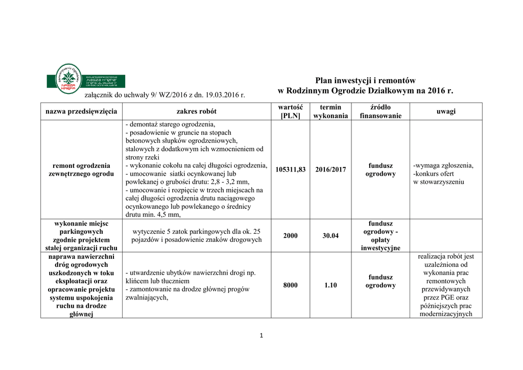 Plan inwestycji i remontów w Rodzinnym Ogrodzie Działkowym na 2016 r. załącznik do uchwały 9/ WZ/2016 z dn. 19.03.2016 r. nazwa przedsięwzięcia zakres robót wartość [PLN] termin wykonania źródło finansowanie remont ogrodzenia zewnętrznego ogrodu - demontaż starego ogrodzenia, - posadowienie w gruncie na stopach betonowych słupków ogrodzeniowych, stalowych z dodatkowym ich wzmocnieniem od strony rzeki - wykonanie cokołu na całej długości ogrodzenia, - umocowanie siatki ocynkowanej lub powlekanej o grubości drutu: 2,8 - 3,2 mm, - umocowanie i rozpięcie w trzech miejscach na całej długości ogrodzenia drutu naciągowego ocynkowanego lub powlekanego o średnicy drutu min. 4,5 mm, 105311,83 2016/2017 fundusz ogrodowy 30.04 fundusz ogrodowy opłaty inwestycyjne wykonanie miejsc parkingowych zgodnie projektem stałej organizacji ruchu naprawa nawierzchni dróg ogrodowych uszkodzonych w toku eksploatacji oraz opracowanie projektu systemu uspokojenia ruchu na drodze głównej wytyczenie 5 zatok parkingowych dla ok. 25 pojazdów i posadowienie znaków drogowych - utwardzenie ubytków nawierzchni drogi np. klińcem lub tłuczniem - zamontowanie na drodze głównej progów zwalniających, 2000 8000 1 1.10 fundusz ogrodowy uwagi -wymaga zgłoszenia, -konkurs ofert w stowarzyszeniu realizacja robót jest uzależniona od wykonania prac remontowych przewidywanych przez PGE oraz późniejszych prac modernizacyjnych nawierzchni nazwa przedsięwzięcia remont budynku administracyjnego wartość [PLN] zakres robót - ocieplenie izolacją termiczną i obłożenie ścian zewnętrznych budynku panelami PCV, - wykonanie węzła sanitarnego, - zamontowanie 3 drzwi zewnętrznych, -pomalowanie ścian wewnętrznych pomieszczenia biura stowarzyszenia Razem: 20 000 termin wykonania 2016/2017 źródło finansowanie uwagi fundusz ogrodowy opłaty inwestycyjne konkurs ofert w stowarzyszeniu remont może być wykonywany etapowo, zgodnie z możliwościami finansowymi 135.311,83 Fundusz ogrodowy przeznaczony jest w szczególności do nabywania ruchomości i wyposażenia, finansowania inwestycji i remontów oraz usług świadczonych na rzecz ogrodu w zakresie remontów, konserwacji, modernizacji, budowy lub rozbudowy budynków, budowli, urządzeń oraz infrastruktury służącej do wspólnego użytku przez członków Stowarzyszenia, działkowców i ich rodziny. Przeznaczony jest także na opłacenie kredytu na inwestycje i remonty oraz na czasowe pokrycie niedoborów z tytułu innych wydatków związanych z administrowaniem ogrodu. Opłata inwestycyjna jest wnoszona przez zainteresowanego działką, której wpłacenie na fundusz ogrodowy jest podstawą do zawarcia przez niego umowy dzierżawy działkowej. Pierwszy wiceprezes Prezes Stowarzyszenia Ogrodowego "Nasza Krępa" Stowarzyszenia Ogrodowego "Nasza Krępa" /-/ Stanisław Wieczorek /-/ Tadeusz J. Sibiga 2