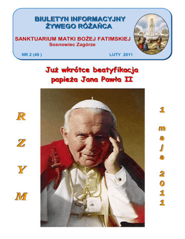 BIULETYN INFORMACYJNY ŻYWEGO RÓŻAŃCA SANKTUARIUM MATKI BOŻEJ FATIMSKIEJ Sosnowiec Zagórze NR 2 (49 ) LUTY 2011 Już wkrótce beatyfikacja papieża Jana Pawła II R Z Y M 1 m a j a 2 0 1 1 Droga Wspólnoto Żywego Różańca Tegoroczny luty przeżywać będziemy w całości jako okres zwykły roku liturgicznego. Okres zwykły to czas dziękczynnego rozważania posłannictwa Jezusa Chrystusa. To czas, kiedy liturgia Kościoła prowadzi nas po ścieżkach zbawienia, podpowiadając co mamy czynić w poszczególne dni i tygodnie, by jak najpełniej skorzystać z owoców Odkupienia. W dniu 2 lutego przeżywamy dzień duchowej radości ze wspomnienia ofiarowania Pana Jezusa w jerozolimskiej świątyni. Mimo, że jest to święto Pańskie, odnajdujemy w nim wiele maryjnych akcentów, bo przecież Maryja ma wielki wkład w dzieło odkupienia. Ona jest tutaj Tą, która działa - przynosi Dziecko, ofiarowuje Je Ojcu Niebieskiemu, słucha słów proroczych. Święto Ofiarowania Pańskiego w polskiej tradycji zwane jest świętem Matki Boskiej Gromnicznej. Święto Ofiarowania Pańskiego jest równocześnie Światowym Dniem Życia Konsekrowanego. W tym dniu szczególnie otaczamy modlitwą osoby, które odpowiedziały na Boże wezwanie i obrały drogę życia zakonnego. Z okazji Światowego Dnia Życia Konsekrowanego przeprowadzona zostanie ogólnopolska zbiórka pieniężna do puszek na potrzeby zakonów klauzurowych. 3 lutego w liturgii obchodzimy wspomnienie św. Błażeja. W wielu kościołach Polski, na zakończenie Mszy św. kapłani udzielają błogosławieństwa wiernym, dotykając gardła poświęconymi świecami, wzywając wstawiennictwa św. Błażeja, patrona od chorób gardła. 11 lutego cały Kościół obchodzi wspomnienie Objawienia Niepokalanej Dziewicy w Lourdes. W tym dniu 1858 r. Matka Boża objawiła się ubogiej, prostej, niewykształconej dziewczynce Bernadecie. W miejscu objawienia u stóp groty wypłynęła woda ze źródła, które dziewczynka odkopała swoimi rękami. Woda ta przywróciła zdrowie wielu chorym. Pierwszy cud uzdrowienia miał miejsce w roku objawień i dotyczył mieszkanki Lourdes, która umoczyła sparaliżowaną rękę w wodzie ze źródła i została uzdrowiona. Od początku objawień z tym sanktuarium związali się chorzy i cierpiący. Ta sytuacja spowodowała, że w 1890 r. papież Leon XIII ustanowił święto Maryi na pamiątkę objawień. Na cały świat rozszerzył to nabożeństwo papież Pius X w 1907 r. Lourdes - położone w Pirenejach, otoczone górami ma swój niepowtarzalny Maryjny klimat zaufania. Ogromne rzesze pielgrzymów, którzy co roku nawiedzają to miasteczko - 5 milionów rocznie - przychodzą do Maryi z nadzieją na cud. Zwykle wszyscy zabierają wodę ze źródła ze sobą, by podać ją chorym i cierpiącym. Wszak wiara w Bożą moc czyni cuda przez widzialny znak, jakim jest woda. Wielu pielgrzymów, nie tylko chorych, ale i zdrowych korzysta z kąpieli w basenach obok groty objawień, do których doprowadzana jest woda ze źródła. A cuda zdarzają się wciąż. Pamiętnym wydarzeniem dla Lourdes była ostatnia pielgrzymka Jana Pawła II w 2004 r., kilka miesięcy przed śmiercią. Siedząc na wózku inwalidzkim jako "chory wśród chorych", drżącym głosem wypowiedział przejmujące słowa: "ze wzruszeniem odczuwam, że dotarłem do kresu mej pielgrzymki". I jak to czynią wszyscy pielgrzymi zapalił świecę wotywną przed figurą Maryi Niepokalanej, napił się wody ze źródła i oddał się Matce Bożej w opiekę pełen wiary i ufności. Ojciec święty Jan Paweł II na mocy dekretu z 13 maja 1992 r. ogłosił dzień objawień Matki Bożej w Lourdes - 11 lutego - Światowym Dniem Chorego. W bieżącym roku obchodzony jest w Kościele Powszechnym po raz XIX. W tym dniu w kościołach odprawiane są Msze św. z udziałem osób chorych, ich bliskich oraz pracowników służby zdrowia i tych, którzy opiekują się chorymi i niepełnosprawnymi. Biskupi i kapłani odwiedzają chorych w domach i szpitalach. 11 lutego w Światowym Dniu Chorego, abp Zygmunt Zimowski, który przewodniczy pracom Papieskiej Rady ds. Duszpasterstwa Służby Zdrowia, odprawi Mszę św. w Szpitalu im. Św. Łukasza w Tarnowie. Pragnę przypomnieć, że ks. Andrzej Ciesielski - którego dobrze znamy – sprawuje chwalebną, ale na pewno nie łatwą, opiekę duszpasterską wśród chorych i nie tylko, bowiem jako kapelan szpitalny wspiera duchowo także personel medyczny, a niejednokrotnie również członków rodziny pacjentów. Księdzu Andrzejowi życzymy przy tej okazji dużo zdrowia, ale też Bożych mocy do dalszej duszpasterskiej posługi wśród chorych. Jak co roku w naszym Sanktuarium 11 lutego o godz. 18 odprawione będzie nabożeństwo dla chorych z błogosławieństwem Najświętszym Sakramentem. Wzorem lat ubiegłych, Ksiądz Biskup wszystkich chorych z naszej diecezji zaprasza do Bazyliki Katedralnej w dniu 12 lutego na wspólną modlitwę w czasie Mszy św., która odprawiona będzie o godz. 10. Natomiast 22 lutego obchodzimy nietypowe święto. Tym razem Kościół nie przywołuje wspomnienia o świętym, ale wskazuje na wyjątkowe miejsce – Katedrę św. Piotra w Rzymie. Słowo „katedra” kojarzy się nam z kościołem biskupa, ale pierwotnie oznaczało podwyższone miejsce w prezbiterium, na którym zasiadał biskup. Był to symbol jego biskupiej władzy i jedności lokalnego Kościoła. Święto Katedry św. Piotra nawiązuje właśnie do tego pierwotnego znaczenia słowa „katedra”. To święto przypomina, że Stolica Piotrowa jest podstawą jedności Kościoła. Kościół modli się, aby "pośród zamętu świata nasza wiara pozostała nienaruszona". Jak już wspominałam, przez cały miesiąc luty przeżywamy okres zwykły roku liturgicznego, a wg kalendarza świeckiego trwa karnawał. Jest to w zasadzie świecki sposób świętowania. Czy jednak my chrześcijanie mamy go unikać? A jeśli nie, to jak mamy go prze
