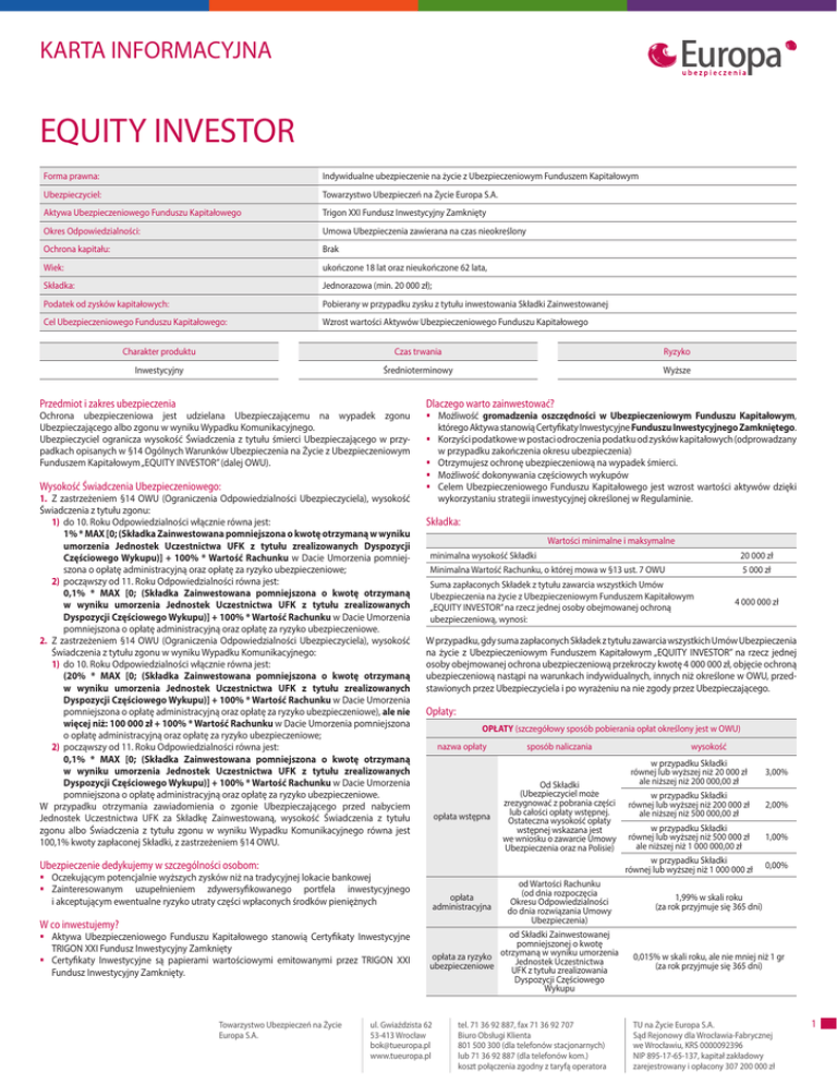 KARTA INFORMACYJNA EQUITY INVESTOR Forma prawna: Indywidualne ubezpieczenie na życie z Ubezpieczeniowym Funduszem Kapitałowym Ubezpieczyciel: Towarzystwo Ubezpieczeń na Życie Europa S.A. Aktywa Ubezpieczeniowego Funduszu Kapitałowego Trigon XXI Fundusz Inwestycyjny Zamknięty Okres Odpowiedzialności: Umowa Ubezpieczenia zawierana na czas nieokreślony Ochrona kapitału: Brak Wiek: ukończone 18 lat oraz nieukończone 62 lata, Składka: Jednorazowa (min. 20 000 zł); Podatek od zysków kapitałowych: Pobierany w przypadku zysku z tytułu inwestowania Składki Zainwestowanej Cel Ubezpieczeniowego Funduszu Kapitałowego: Wzrost wartości Aktywów Ubezpieczeniowego Funduszu Kapitałowego Charakter produktu Czas trwania Ryzyko Inwestycyjny Średnioterminowy Wyższe Przedmiot i zakres ubezpieczenia Ochrona ubezpieczeniowa jest udzielana Ubezpieczającemu na wypadek zgonu Ubezpieczającego albo zgonu w wyniku Wypadku Komunikacyjnego. Ubezpieczyciel ogranicza wysokość Świadczenia z tytułu śmierci Ubezpieczającego w przypadkach opisanych w §14 Ogólnych Warunków Ubezpieczenia na Życie z Ubezpieczeniowym Funduszem Kapitałowym „EQUITY INVESTOR” (dalej OWU). Wysokość Świadczenia Ubezpieczeniowego: 1. Z zastrzeżeniem §14 OWU (Ograniczenia Odpowiedzialności Ubezpieczyciela), wysokość Świadczenia z tytułu zgonu: 1) do 10. Roku Odpowiedzialności włącznie równa jest: 1% * MAX [0; (Składka Zainwestowana pomniejszona o kwotę otrzymaną w wyniku umorzenia Jednostek Uczestnictwa UFK z tytułu zrealizowanych Dyspozycji Częściowego Wykupu)] + 100% * Wartość Rachunku w Dacie Umorzenia pomniejszona o opłatę administracyjną oraz opłatę za ryzyko ubezpieczeniowe; 2)począwszy od 11. Roku Odpowiedzialności równa jest: 0,1% * MAX [0; (Składka Zainwestowana pomniejszona o kwotę otrzymaną w wyniku umorzenia Jednostek Uczestnictwa UFK z tytułu zrealizowanych Dyspozycji Częściowego Wykupu)] + 100% * Wartość Rachunku w Dacie Umorzenia pomniejszona o opłatę administracyjną oraz opłatę za ryzyko ubezpieczeniowe. 2.Z zastrzeżeniem §14 OWU (Ograniczenia Odpowiedzialności Ubezpieczyciela), wysokość Świadczenia z tytułu zgonu w wyniku Wypadku Komunikacyjnego: 1)do 10. Roku Odpowiedzialności włącznie równa jest: (20% * MAX [0; (Składka Zainwestowana pomniejszona o kwotę otrzymaną w wyniku umorzenia Jednostek Uczestnictwa UFK z tytułu zrealizowanych Dyspozycji Częściowego Wykupu)] + 100% * Wartość Rachunku w Dacie Umorzenia pomniejszona o opłatę administracyjną oraz opłatę za ryzyko ubezpieczeniowe), ale nie więcej niż: 100 000 zł + 100% * Wartość Rachunku w Dacie Umorzenia pomniejszona o opłatę administracyjną oraz opłatę za ryzyko ubezpieczeniowe; 2)począwszy od 11. Roku Odpowiedzialności równa jest: 0,1% * MAX [0; (Składka Zainwestowana pomniejszona o kwotę otrzymaną w wyniku umorzenia Jednostek Uczestnictwa UFK z tytułu zrealizowanych Dyspozycji Częściowego Wykupu)] + 100% * Wartość Rachunku w Dacie Umorzenia pomniejszona o opłatę administracyjną oraz opłatę za ryzyko ubezpieczeniowe. W przypadku otrzymania zawiadomienia o zgonie Ubezpieczającego przed nabyciem Jednostek Uczestnictwa UFK za Składkę Zainwestowaną, wysokość Świadczenia z tytułu zgonu albo Świadczenia z tytułu zgonu w wyniku Wypadku Komunikacyjnego równa jest 100,1% kwoty zapłaconej Składki, z zastrzeżeniem §14 OWU. Dlaczego warto zainwestować? Możliwość gromadzenia oszczędności w Ubezpieczeniowym Funduszu Kapitałowym, którego Aktywa stanowią Certyfikaty Inwestycyjne Funduszu Inwestycyjnego Zamkniętego. Korzyści podatkowe w postaci odroczenia podatku od zysków kapitałowych (odprowadzany w przypadku zakończenia okresu ubezpieczenia) Otrzymujesz ochronę ubezpieczeniową na wypadek śmierci. Możliwość dokonywania częściowych wykupów Celem Ubezpieczeniowego Funduszu Kapitałowego jest wzrost wartości aktywów dzięki wykorzystaniu strategii inwestycyjnej określonej w Regulaminie. Składka: Wartości minimalne i maksymalne minimalna wysokość Składki 20 000 zł Minimalna Wartość Rachunku, o której mowa w §13 ust. 7 OWU 5 000 zł Suma zapłaconych Składek z tytułu zawarcia wszystkich Umów Ubezpieczenia na życie z Ubezpieczeniowym Funduszem Kapitałowym „EQUITY INVESTOR” na rzecz jednej osoby obejmowanej ochroną ubezpieczeniową, wynosi: W przypadku, gdy suma zapłaconych Składek z tytułu zawarcia wszystkich Umów Ubezpieczenia na życie z Ubezpieczeniowym Funduszem Kapitałowym „EQUITY INVESTOR” na rzecz jednej osoby obejmowanej ochrona ubezpieczeniową przekroczy kwotę 4 000 000 zł, objęcie ochroną ubezpieczeniową nastąpi na warunkach indywidualnych, innych niż określone w OWU, przedstawionych przez Ubezpieczyciela i po wyrażeniu na nie zgody przez Ubezpieczającego. Opłaty: OPŁATY (szczegółowy sposób pobierania opłat określony jest w OWU) nazwa opłaty opłata wstępna sposób naliczania Od Składki (Ubezpieczyciel może zrezygnować z pobrania części lub całości opłaty wstępnej. Ostateczna wysokość opłaty wstępnej wskazana jest we wniosku o zawarcie Umowy Ubezpieczenia oraz na Polisie) Ubezpieczenie dedykujemy w szczególności osobom: Oczekującym potencjalnie wyższych zysków niż na tradycyjnej lokacie bankowej Zainteresowanym uzupełnieniem zdywersyfikowanego portfela inwestycyjnego i akceptującym ewentualne ryzyko utraty części wpłaconych środków pieniężnych W co inwestujemy? Aktywa Ubezpieczeniowego Funduszu Kapitałowego stanowią Certyfikaty Inwestycyjne TRIGON XXI Fundusz Inwestycyjny Zamknięty Certyfikaty Inwestycyjne są papierami wartościowymi emitowanymi przez TRIGON XXI Fundusz Inwestycyjny Zamknięty. Towarzystwo Ubezpieczeń na Życie Europa S.A. 4 000 000 zł opłata administracyjna od Wartości Rachunku (od dnia rozpoczęcia Okresu Odpowiedzialności do dnia rozwiązania Umowy Ubezpieczenia) od Składki Zainwestowanej pomniejszonej o kwotę otr