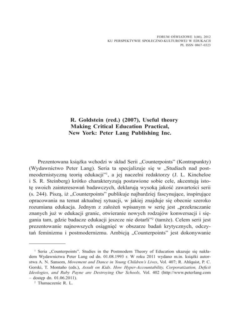 FORUM OŚWIATOWE 1(46), 2012 KU PERSPEKTYWIE SPOŁECZNO-KULTUROWEJ W EDUKACJI PL ISSN 0867–0323 R. Goldstein (red.) (2007), Useful theory Making Critical Education Practical, New York: Peter Lang Publishing Inc. Prezentowana książka wchodzi w skład Serii „Counterpoints” (Kontrapunkty) (Wydawnictwo Peter Lang). Seria ta specjalizuje się w „Studiach nad postmeodernistyczną teorią edukacji”1, a jej naczelni redaktorzy (J. L. Kincheloe i S. R. Steinberg) krótko charakteryzują postawione sobie cele, akcentują istotę swoich zainteresowań badawczych, deklarują wysoką jakość zawartości serii (s. 244). Piszą, iż „Counterpoints” publikuje najbardziej fascynujące, inspirujące opracowania na temat aktualnej sytuacji, w jakiej znajduje się obecnie szeroko rozumiana edukacja. Jednym z założeń wpisanym w serię jest „przekraczanie znanych już w edukacji granic, otwieranie nowych rodzajów konwersacji i sięgania tam, gdzie badacze edukacji jeszcze nie dotarli”2 (tamże). Celem serii jest prezentowanie najnowszych osiągnięć w obszarze badań krytycznych, odczytań feminizmu i postmodernizmu. Ambicją „Counterpoints” jest dokonywanie 1Seria „Counterpoints”. Studies in the Postmodern Theory of Education ukazuje się nakładem Wydawnictwa Peter Lang od dn. 01.08.1993 r. W roku 2011 wydano m.in. książki autorstwa A. N. Sansom, Movement and Dance in Young Children’s Lives, Vol. 407; R. Ahlquist, P. C. Gorski, T. Montaño (eds.), Assult on Kids. How Hyper-Accountability, Corporatization, Deficit Ideologies, and Ruby Payne are Destroying Our Schools, Vol. 402 (http://www.peterlang.com – dostęp dn. 01.06.2011). 2Tłumaczenie R. L. 330 Recenzje analizy znaczeń tychże innowacyjnych nurtów obecnych w edukacyjnej praktyce od dawna w różnorodnych postaciach, ale obecnie modyfikowanych przez konteksty lokalne i globalne (tamże). Uwagę czytelnika zwraca również fakt, iż obok odpowiedniego doboru treści, autorom serii przyświeca jeszcze jeden ważny cel, który wyrażają następująco: „Wychodząc naprzeciw idei, iż literatura teoretyczna powinna być dostępna szerokiemu gronu odbiorców, seria ta ze szczególną pieczołowitością dba o to, aby autorzy unikali żargonu naukowego i języka ezoterycznego, które zmieniają naukę o edukacji w elitarny dyskurs niedostępny dla nowicjuszy”3 (tamże). Dodają również, iż „naukowe opracowania na rzecz edukacji mają sens na tyle, na ile oddziałują zarówno na świadomość jak i praktykę edukacyjną na wielu poziomach jednocześnie”4 (tamże). Głos w sprawie uczynienia tekstu naukowego mniej elitarnym może być potwierdzeniem z jednej strony doświadczanej dziś heterogeniczności świata akademickiego (Guri-Rosenblit, 2008; Nussbaum, 2008), z drugiej, wydaje się być przywołaniem idei K. Lewina sprzed sześćdziesięciu lat, który już wówczas apelował, iż dla dobra społecznego postępu i budowania więzi społecznych, „…nie wystarcza, aby uniwersytety tworzyły nowe, naukowe koncepcje. Niezbędne jest, aby procedury badawcze, społeczne oczy i uszy”5 uczynić częścią tych zbiorowości, które angażują się osobiście w działania na rzecz rozwoju społecznego (Lewin, 1946). To angażowanie wielu podmiotów społecznych, wiązanie teorii z praktyką, ale i tworzenie „wspólnoty uczącej się” (Bruner, 2006) teoretyków i praktyków (często studentów przygotowujących się dopiero do wykonywania profesji), nie wydaje się odbiegać od potrzeb rodzimych. Co więcej, wydaje się być znakiem czasu i potrzebą silnie dziś artykułowaną nie tylko na kontynencie amerykańskim. Świadome poszerzanie grup badawczych o studentów i praktyków, zachęcanie ich do ponownego odczytania tych tekstów z przeszłości, które nadal „inspirują, dostarczają teoretycznego ugruntowania, ułatwiają zrozumienie własnych poszukiwań w zaangażowanych nurtach dyscyplin społecznych” (Gołębniak, Červinkova, 2010, s. VIII) wpisują się w bieżące potrzeby „pedagogiki i antropologii zaangażowanej” (tamże), na co dowody znajdujemy m.in. w jednej z niedawnych publikacji zatytułowanej „Badania w działaniu. Pedagogika i antropologia zaangażowane” (2010). Podobnie rzecz się ma w przypadku prezentowanej książki Useful Theory. Making Critical Education Practical, w której autorzy wyraźnie wskazują na Tłumaczenie R. L. Tłumaczenie R. L. 5 Tłumaczenie R. L. 3 4 Recenzje 331 wspólne teoretyczne ugruntowanie. Na trzynaście różnych artykułów umieszczonych w zbiorze, dziesięć z nich sięga do tekstów źródłowych P. Freire (1970, 1973, 1978, 1981, 1993, 1998), dopełnionych lekturą A. Gramsciego (1971), H. Giroux (1988), M. Foucault (1977, 1980), P. Bourdieu, J. C. Passeron (1977), b. hooks* (1994), N. Postmana (1969, 1996). Do swych projektów badawczych włączają również założenia społeczno-kulturowego podejścia do edukacji, czego dają dowód m.in. przez odwoływanie się do myśli J. Deweya (1916, 1924, 1938), L. Wygotskiego (1978), J. Brunera (1986, 1996), R. J. Schaffera (1967). To tylko wskazanie wspólnego zakorzenienia autorów zbioru, którzy czynią swym celem umiejętność posługiwanie się pedagogicznymi teoriami krytycznymi w praktyce zarówno przez nauczycieli nowicjuszy jak i kandydatów na nauczycieli. Ten rdzeń teoretyczny obudowywany jest literaturą znacznie młodszą z zakresu nauk społecznych. Nie brakuje w nich myśli A. Giddensa (2000), M. Castelsa (1996, 1997, 1998) i wielu, wielu innych. Oprócz zasobów literaturowych istotna jest aktualność problematyki poruszanej w tekstach, które nie odbiegają w swej treści od debat prowadzonych zarówno w krajach europejskich, jak i na kontynencie amerykańskim. Redaktorką prezentowanego tomu (i autorką obszernego wprowadzenia jak i współautorką pierwszego artykułu w zbiorze) jest Rebecca A. Goldstein, profesor w dziedzinie nauczania i konstruowania programów or