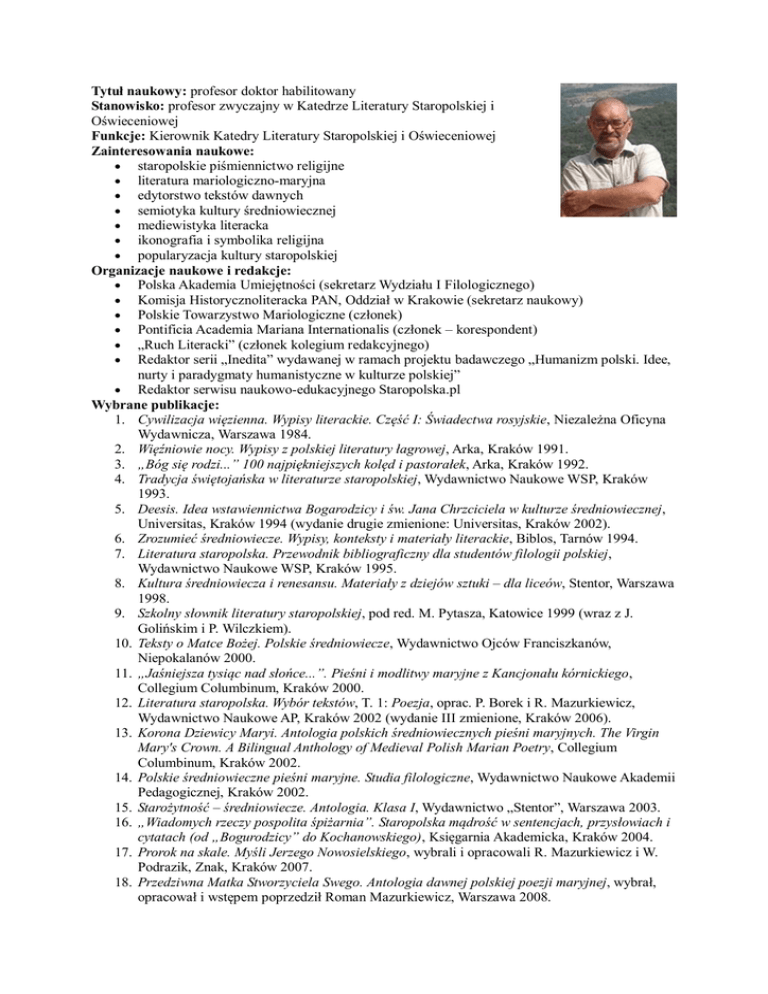 Tytuł naukowy: profesor doktor habilitowany Stanowisko: profesor zwyczajny w Katedrze Literatury Staropolskiej i Oświeceniowej Funkcje: Kierownik Katedry Literatury Staropolskiej i Oświeceniowej Zainteresowania naukowe: staropolskie piśmiennictwo religijne literatura mariologiczno-maryjna edytorstwo tekstów dawnych semiotyka kultury średniowiecznej mediewistyka literacka ikonografia i symbolika religijna popularyzacja kultury staropolskiej Organizacje naukowe i redakcje: Polska Akademia Umiejętności (sekretarz Wydziału I Filologicznego) Komisja Historycznoliteracka PAN, Oddział w Krakowie (sekretarz naukowy) Polskie Towarzystwo Mariologiczne (członek) Pontificia Academia Mariana Internationalis (członek – korespondent) „Ruch Literacki” (członek kolegium redakcyjnego) Redaktor serii „Inedita” wydawanej w ramach projektu badawczego „Humanizm polski. Idee, nurty i paradygmaty humanistyczne w kulturze polskiej” Redaktor serwisu naukowo-edukacyjnego Staropolska.pl Wybrane publikacje: 1. Cywilizacja więzienna. Wypisy literackie. Część I: Świadectwa rosyjskie, Niezależna Oficyna Wydawnicza, Warszawa 1984. 2. Więźniowie nocy. Wypisy z polskiej literatury łagrowej, Arka, Kraków 1991. 3. „Bóg się rodzi...” 100 najpiękniejszych kolęd i pastorałek, Arka, Kraków 1992. 4. Tradycja świętojańska w literaturze staropolskiej, Wydawnictwo Naukowe WSP, Kraków 1993. 5. Deesis. Idea wstawiennictwa Bogarodzicy i św. Jana Chrzciciela w kulturze średniowiecznej, Universitas, Kraków 1994 (wydanie drugie zmienione: Universitas, Kraków 2002). 6. Zrozumieć średniowiecze. Wypisy, konteksty i materiały literackie, Biblos, Tarnów 1994. 7. Literatura staropolska. Przewodnik bibliograficzny dla studentów filologii polskiej, Wydawnictwo Naukowe WSP, Kraków 1995. 8. Kultura średniowiecza i renesansu. Materiały z dziejów sztuki – dla liceów, Stentor, Warszawa 1998. 9. Szkolny słownik literatury staropolskiej, pod red. M. Pytasza, Katowice 1999 (wraz z J. Golińskim i P. Wilczkiem). 10. Teksty o Matce Bożej. Polskie średniowiecze, Wydawnictwo Ojców Franciszkanów, Niepokalanów 2000. 11. „Jaśniejsza tysiąc nad słońce...”. Pieśni i modlitwy maryjne z Kancjonału kórnickiego, Collegium Columbinum, Kraków 2000. 12. Literatura staropolska. Wybór tekstów, T. 1: Poezja, oprac. P. Borek i R. Mazurkiewicz, Wydawnictwo Naukowe AP, Kraków 2002 (wydanie III zmienione, Kraków 2006). 13. Korona Dziewicy Maryi. Antologia polskich średniowiecznych pieśni maryjnych. The Virgin Mary's Crown. A Bilingual Anthology of Medieval Polish Marian Poetry, Collegium Columbinum, Kraków 2002. 14. Polskie średniowieczne pieśni maryjne. Studia filologiczne, Wydawnictwo Naukowe Akademii Pedagogicznej, Kraków 2002. 15. Starożytność – średniowiecze. Antologia. Klasa I, Wydawnictwo „Stentor”, Warszawa 2003. 16. „Wiadomych rzeczy pospolita śpiżarnia”. Staropolska mądrość w sentencjach, przysłowiach i cytatach (od „Bogurodzicy” do Kochanowskiego), Księgarnia Akademicka, Kraków 2004. 17. Prorok na skale. Myśli Jerzego Nowosielskiego, wybrali i opracowali R. Mazurkiewicz i W. Podrazik, Znak, Kraków 2007. 18. Przedziwna Matka Stworzyciela Swego. Antologia dawnej polskiej poezji maryjnej, wybrał, opracował i wstępem poprzedził Roman Mazurkiewicz, Warszawa 2008. 19. Jacek Mijakowski, Kokosz panom krakowianom w kazaniu za kolędę dana, opracował R. Mazurkiewicz, Warszawa 2008. 20. Grzegorz Czaradzki, Rytmy o porodzeniu przenaczystszym Bogarodzice Panny Maryjej, wydali i opracowali R. Mazurkiewicz i E. Buszewicz, redakcja naukowa A. Nowicka-Jeżowa, Warszawa 2009. 21. Andrzej Wolan, De libertate politica sive civili, wydali i opracowali M. Eder i R. Mazurkiewicz, redakcja naukowa W. Uruszczak, Warszawa 2010. 22. Z dawnej literatury maryjnej. Zarysy i zbliżenia, Kraków 2011. 23. Stanisław Dobiński, Świt wierszów na święta Najświętszej Maryi Panny światu wydany, opracował R. Mazurkiewicz, Warszawa 2011. 24. Kazania maryjne, wydali i opracowali R. Mazurkiewicz i K. Panuś, Kraków 2014 („Kazania w kulturze polskiej. Edycje kolekcji tematycznych”, t. 1). Wybrane konferencje naukowe: 1. Mediewistyka literacka w Polsce A.D. 2005, Komisja Historycznoliteracka PAN w Krakowie. 2. O skarbie Piotra Wydżgi ukrytym w staropolskiej legendzie, Spotkania Mediewistyczne XII, IBL, Warszawa. 3. Organizacja konferencji Spotkania Mediewistyczne XII: „Deo cantando cum cytarista”. W pięćsetlecie śmierci bł. Władysława z Gielniowa, IBL, Warszawa. 4. Mediewistyka literacka A.D. 2005, II Kongres Mediewistów Polskich, Lublin. 5. „Kokosz naukami zbawiennymi utuczona”. Jacek Mijakowski OP na ambonach Krakowa, Polskie Towarzystwo Teologiczne, sesja pt. Wielcy kaznodzieje Krakowa, 12 października 2006. 6. Międzynarodowa konferencja: Humanizm polski. Długie trwanie – tradycje – rewizje. Wstęp do badań, Warszawa, wrzesień 2007. 7. „Eva, Ave – para słów, lecz nad tysiąc ważą…”. Zwiastowanie w dawnej polskiej poezji, konferencja: Via pulchritudinis. Wątki biblijne w literaturze i kulturze polskiej, Kraków 2010. 8. Mediewistyka literacka A.D. 2011, IV Kongres Mediewistów Polskich, Poznań 2011. 9. Łaciński pierwowzór kazań maryjnych Jana z Szamotuł, Wydział I Filologiczny PAU, 2013. Działalność społeczna i edukacyjna: Stworzenie i redagowanie internetowych serwisów naukowo-edukacyjnych: Staropolska: Tradycja - Kultura - Literatura zob. 2011 Sarmatian Review Literary Award Meliton. Mediewistyka Literacka Online Mikołaj Rej 2005 Humanizm polski - projekt badawczy Studia doktoranckie: Przewodnik netograficzny: INTERNETOWY WARSZTAT BADAWCZY FILOLOGA Tematy prac magisterskich (wybór): Staropolskie wizerunki świętych (hagiografia, kaznodziejstwo, poezja) Rola fizjonomiki w charakterystyce postaci w literaturze staropolskiej Apologie kobiet w literaturze parenetycznej XVI wieku Biblijne źródła "Ogrodu panieński