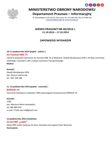 MINISTERSTWO OBRONY NARODOWEJ Departament Prasowo – Informacyjny Al. Niepodległości 218, 00-911 Warszawa, tel. 22 6 840 230, faks 22 6 840 224 [email protected], www.mon.gov.pl SERWIS PRASOWY NR 40/2014 r. 11.10.2014 – 17.10.2014 ZAPOWIEDZI WYDARZEŃ 10-11 października 2014 (piątek - sobota ) Air Festival AIRE 75 Udział w pokazach lotniczych Air Festival AIRE 75 w Madrycie. Zespół Akrobacyjny Orlik z 42 Bazy Lotnictwa Szkolnego i samolot C-295 z 8 Bazy Lotnictwa Transportowego. Madryt Kontakt: Zespół Akrobacyjny Orlik kpt. Dariusz Stachurski tel. 607 158 188 11 -16 października 2014 (piątek - czwartek ) BORSUK-14 Ćwiczenie dowódczo-sztabowe 17BZ wspomagane komputerowo BORSUK-14. Kontakt: 17BZ por. Martyna Fedro-Samojedny tel. 685 885 032 e-mail: [email protected] 12 października 2014 (niedziela) 25 lat ORP „Lublin” Okręt ORP Lublin świętuje 25-lecie. Dowodzi nim kapitan Piotr Mazurek. Świnoujście Kontakt: Rzecznik prasowy 8 FOW kmdr ppor. Jacek Kwiatkowski nr tel. kom.: 661 417 739 e-mail: [email protected] 13 – 16 października 2014 (poniedziałek – czwartek) RYBOŁÓW 2014 Ćwiczenie taktyczne dowódcy Brygady Lotnictwa Marynarki Wojennej RYBOŁÓW 2014. Obejmować będzie prowadzenie działań SAR (poszukiwawczo-ratowniczych) i ZOP (zwalczania okrętów podwodnych) we współpracy z pozamilitarnymi strukturami państwa podczas połączonej operacji obronnej. Siły BLMW: 2 śmigłowce ZOP Mi-14PŁ, 2 samoloty patrolowo-rozpoznawcze Bryza, śmigłowce ratownicze W-3RM i Mi-14PŁ/R, śmigłowiec pokładowy SH-2G, śmigłowiec transportowy Mi-17/Mi-2. Inne: okręt podwodny typu Kobben, okręt ratowniczy (3 Flotylla Okrętów), jednostka pościgowointerwencyjna (Morski Oddział Straży Granicznej). Gdynia, Siemirowice, Darłowo, poligony morskie na Bałtyku Kontakt: BLMW kmdr ppor. Czesław Cichy tel. 665 991 292 e-mail:[email protected] 13 – 16 października 2014 (poniedziałek – czwartek) „EpiMilitaris 2014” III Międzynarodowa Konferencja Naukowa „EpiMilitaris 2014”, której organizatorami są: Centrum Reagowania Epidemiologicznego SZ RP (CRESZ), Wojskowe Centrum Kształcenia Medycznego (WCKMed), amerykańska agencja Departamentu Obrony Defense Threat Reduction Agency (DTRA) oraz Stowarzyszenie „Ruch Wspólnot Obronnych”. Zapraszamy przedstawicieli mediów w dniu pokazu praktycznego – 15 października (środa), na godz. 9.00 do sali konferencyjnej hotelu „Zamek Ryn” w Rynie (parter). Pokaz zewnętrzny zacznie się o godz. 11.00. Więcej… Kontakt: Oficer prasowy CRESZ – por. dr Izabela Tomaszewska tel. 606 108 274 e-mail: [email protected] 13 – 24 października 2014 (poniedziałek – piątek) TRIDENT JOUST 14 Ćwiczenie zgrywające NATO pod kryptonimem „Trident Joust 14”, które JFC Brunssum przeprowadzi w Centrum Szkolenia Sił Połączonych w Bydgoszczy. Więcej… Bydgoszcz Kontakt: Public Affairs Officer phone: +48 52 378 1445 mobile: +48 695 427 425 e-mail: [email protected], [email protected] 14 – 16 października 2014 (wtorek - czwartek) Szef Sztabu Generalnego WP w Chorwacji Szef Sztabu Generalnego WP generał Mieczysław Gocuł złoży wizytę w Chorwacji. Zagrzeb Kontakt: Rzecznik prasowy SGWP płk Tomasz Szulejko tel. 22 6 870 807, kom.602 431 294 e-mail: [email protected] 14 – 22 października 2014 (wtorek - środa) Ground Pepper-14 Pluton zmotoryzowany z 17 Wielkopolskiej Brygady Zmechanizowanej (4 Rosomaki, 40 żołnierzy) weźmie udział w ćwiczeniu Ground Pepper-14. Lest (Słowacja) Kontakt: 17BZ por. Martyna Fedro-Samojedny tel. 685 885 032 e-mail: [email protected] 16 października 2014 (czwartek), godz. 12.00 Obchody rocznicowe Obchody 79. rocznicy utworzenia garnizonu Sieradz oraz święto 15 Brygady Wsparcia Dowodzenia. Sieradz, ul. Wojska Polskiego 78 , plac apelowy 15 SBWD Kontakt: Rzecznik prasowy 15SBWD Beata Michalska tel. 43 8261533 e-mail: [email protected]@wp.pl 17 października 2014 (piątek), godz. 11.30 Otwarcie strzelnicy Uroczyste otwarcie pierwszej w Polsce krytej strzelnicy karabinowej w 10 Wrocławskim Pułku Dowodzenia. Wrocław, ul. Trzmielowicka 28 Kontakt: Oficer prasowy mjr Mieczysław Błażejewski tel. (71) 7655400, kom. 727 016 205 e-mail: [email protected] KRONIKA 3 października 2014 (piątek) Polsko-albańskie rozmowy w MON Współpraca w ramach Sojuszu Północnoatlantyckiego oraz współpraca bilateralna wojsk specjalnych – to główne tematy spotkania wicepremiera, ministra obrony narodowej Tomasza Siemoniaka z minister obrony Albanii Mimi Kodheli. Więcej… 6 października 2014 (poniedziałek) Inauguracja roku akademickiego na wydziale cybernetyki WAT W poniedziałek podsekretarz stanu w MON Beata Oczkowicz w imieniu wicepremiera, ministra obrony narodowej Tomasza Siemoniaka wzięła udział w inauguracji roku akademickiego na Wydziale Cybernetyki Wojskowej Akademii Technicznej. Więcej… 6 października 2014 (poniedziałek) Mistrzostwa Wojska Polskiego – znamy zwycięzców W Centrum Szkolenia Łączności i Informatyki (CSŁiI) w Zegrzu 3 września zakończyły się Mistrzostwa Wojska Polskiego Spartakiada Jesienna. Więcej… 6 października 2014 (poniedziałek) Rozmowy z sekretarzem generalnym NATO Wypełnianie postanowień szczytu w Newport, rola NATO wobec kryzysu na Ukrainie oraz sytuacja w Iraku i Syrii były tematami rozmów sekretarza generalnego NATO Jensa Stoltenberga z wicepremierem, ministrem obrony narodowej Tomaszem Siemoniakiem i szefem MSZ Grzegorzem Schetyną. Więcej… 7 października 2014 (wtorek) Inauguracja roku w Szkole Orląt 2000 studentów, w tym 300 podchorążych rozpoczęło rok akademicki 2014/2015 w Wyższej Szkole Oficerskiej Sił Powietrznych (WSO SP) w Dęblinie. W uroczystości immatrykulacji żaków w „Szkole Orląt”, która odbyła się 6 października br. wziął udział sekretarz stanu w MON Czesław Mroczek. Więcej… 7 października 2014 (wtorek) Centralny Zlot Klas Mundurowych Od pobudki i zaprawy porannej rozpoczą