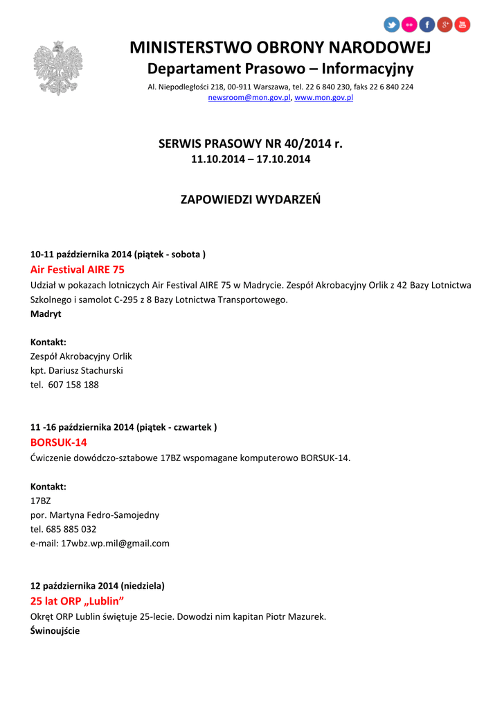 zapowiedzi wydarzeń - Ministerstwo Obrony Narodowej