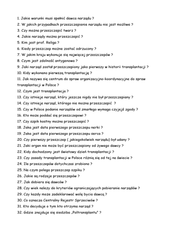 1. Jakie warunki musi spełnić dawca narządu ? 2. W jakich przypadkach przeszczepienie narządu nie jest możliwe ? 3. Czy można przeszczepić twarz ? 4. Jakie narządy można przeszczepić ? 5. Kim jest prof. Religa ? 6. Kiedy przeszczep możne zostać odrzucony ? 7. W jakim kraju wykonuje się najwięcej przeszczepów ? 8. Czym jest zdolność antygenowa ? 9. Jaki narząd został przeszczepiony jako pierwszy w historii transplantacji ? 10. Kidy wykonano pierwszą transplantację ? 11. Jak nazywa się centrum do spraw organizacyjno-koordynacyjne do spraw transplantacji w Polsce ? 12. Czym jest transplantacja ? 13. Czy istnieje narząd, który jeszcze nigdy nie był przeszczepiany ? 14. Czy istnieje narząd, którego nie można przeszczepić ? 15. Czy w Polsce podanie narządów od zmarłego wymaga czyjejś zgody ? 16. Kto może poddać się przeszczepowi ? 17. Czy szpik kostny można przeszczepić ? 18. Jaka jest data pierwszego przeszczepu nerki ? 19. Jaka jest data pierwszego przeszczepu serca ? 20. Czy pierwszy przeszczep ( jakiegokolwiek narządu) był udany ? 21. Jaki organ nie może być przeszczepiony od żywego dawcy ? 22. Kidy dochodzony jest światowy dzień transplantacji ? 23. Czy zasady transplantacji w Polsce różnią się od tej na świecie ? 24. Ile przeszczepów dotychczas zrobiono ? 25. Na czym polega przeszczep szpiku ? 26. Jakie są rodzaje przeszczepów ? 27. Jak dobiera się dawców ? 28. Czy wiek należy do kryteriów ograniczających pobieranie narządów ? 29. Czy każdy może zadeklarować wolę bycia dawcą ? 30. Co oznacza Centralny Rejestr Sprzeciwów ? 31. Kto decyduje o tym kto otrzyma narząd ? 32. Gdzie znajduje się siedziba „Poltransplantu" ?