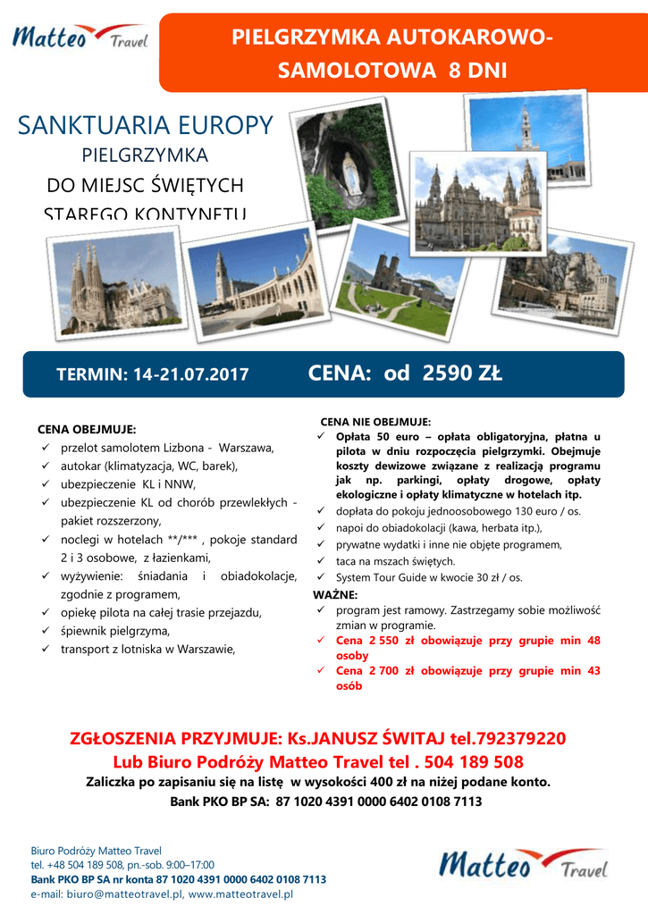 PIELGRZYMKA AUTOKAROWOSAMOLOTOWA 8 DNI SANKTUARIA EUROPY PIELGRZYMKA DO MIEJSC ŚWIĘTYCH STAREGO KONTYNETU TERMIN: 14-21.07.2017 CENA OBEJMUJE: przelot samolotem Lizbona - Warszawa, autokar (klimatyzacja, WC, barek), ubezpieczenie KL i NNW, ubezpieczenie KL od chorób przewlekłych pakiet rozszerzony, noclegi w hotelach **/*** , pokoje standard 2 i 3 osobowe, z łazienkami, wyżywienie: śniadania i obiadokolacje, zgodnie z programem, opiekę pilota na całej trasie przejazdu, śpiewnik pielgrzyma, transport z lotniska w Warszawie, CENA: od 2590 ZŁ CENA NIE OBEJMUJE: Opłata 50 euro – opłata obligatoryjna, płatna u pilota w dniu rozpoczęcia pielgrzymki. Obejmuje koszty dewizowe związane z realizacją programu jak np. parkingi, opłaty drogowe, opłaty ekologiczne i opłaty klimatyczne w hotelach itp. dopłata do pokoju jednoosobowego 130 euro / os. napoi do obiadokolacji (kawa, herbata itp.), prywatne wydatki i inne nie objęte programem, taca na mszach świętych. System Tour Guide w kwocie 30 zł / os. WAŻNE: program jest ramowy. Zastrzegamy sobie możliwość zmian w programie. Cena 2 550 zł obowiązuje przy grupie min 48 osoby Cena 2 700 zł obowiązuje przy grupie min 43 osób ZGŁOSZENIA PRZYJMUJE: Ks.JANUSZ ŚWITAJ tel.792379220 Lub Biuro Podróży Matteo Travel tel . 504 189 508 Zaliczka po zapisaniu się na listę w wysokości 400 zł na niżej podane konto. Bank PKO BP SA: 87 1020 4391 0000 6402 0108 7113 Biuro Podróży Matteo Travel tel. +48 504 189 508, pn.-sob. 9:00–17:00 Bank PKO BP SA nr konta 87 1020 4391 0000 6402 0108 7113 e-mail: [email protected], www.matteotravel.pl więcej na 1. DZIEŃ (pt) 14.07.2017 www.matteotravel.pl PODRÓŻ Zbiórka uczestników w godzinach porannych. Wyjazd autokarem, w czasie podróży po południu obiadokolacja. Następnie przejazd nocny w kierunku Francji. 2. DZIEŃ (sb) 15.07.2017 LA SALETTE Przyjazd w godzinach południowych do La Salette, gdzie znajduje się sanktuarium związane z objawieniami Matki Boskiej z 1846 r. Zwiedzanie sanktuarium, czas na osobistą modlitwę. Zakwaterowanie w domu pielgrzymka, obiadokolacja. Możliwosć uczestniczenia w wieczornej procesji. Nocleg. 3. DZIEŃ (ndz)16.07.2017 CARCASONE - LOURDES Śniadanie. Następnie wyjazd w kierunku Carcasonne. Zwiedzanie miasta - kompleks obronny, średniowieczna Cite – górne miasto, warowna forteca, kościół St. Nazaire. Przejazd do Lourdes, jednego z największych na świecie ośrodków kultu Maryjnego i miejsca objawień Matki Boskiej. Zakwaterowanie w hotelu, obiadokolacja. Następnie ok. godziny 21.00 udział w procesji Maryjnej. Nocleg. 4. DZIEŃ (pn) 17.07.2017 LOURDES Śniadanie, następnie zwiedzanie Sanktuarium, krypty, kaplica Adoracji, Grota Objawień, muzeum uzdrowień i miasta - Moulin Boly, gdzie znajduje się dom rodzinny św. Bernadetty, Le Cachot kościół parafialny, hospicjum, muzeum objawień, cmentarz. Czas wolny, następnie Procesja Eucharystyczna z błogosławieństwem chorych. Powrót do hotelu na obiadokolacje. Ok. 21.00 wieczorny udział w Nabożeństwach. Nocleg. 5. DZIEŃ (wt) 18.07.2017 OVIEDO, SANTIAGO DE COMPOSTELA Śniadanie. Przejazd do Oviedo. Zwiedzanie Oviedo – Katedra San Salvador gdzie według tradycji przechowywana jest chusta z Oviedo czyli sudarium, w które zawinięto w grobie głowę Jezusa Chrystusa. Nastepnie przejazd do Santiago de Compostela zakwaterowanie w hotelu. Obiadokolacja i nocleg. 6. DZIEŃ (śr) 19.07.2017 SANTIAGO DE COMPOSTELA, FATIMA Śniadanie. Zwiedzanie sanktuarium - miejsca spoczynku św. Jakuba Apostoła. Czas na osobistą modlitwę. Przyjazd do Fatimy, – gdzie znajduje się Sanktuarium kultu Maryjnego, jednego z najczęściej uczęszczanych miejsc przez pielgrzymów z całego świata. Zakwaterowanie w hotelu w Fatimie. Obiadokolacja. O godz. 21.30 udział w procesji. Powrót do hotelu, nocleg. 7. DZIEŃ (czw) 20.07.2017 FATIMA, NAZARE Śniadanie. Aljustrel – wioska narodzin św. Franciszka i Łucji, gdzie znajdują się ich rodzinne domy, czas na prywatną modlitwę. Przejazd do Nazare - Kościół Nossa Senhora da Nazaré, plażowanie. Powrót do Fatimy. Udział w procesji wieczornej. Obiadokolacja i nocleg. 8. DZIEŃ (pt) 21. 07. 2017 POWRÓT Śniadanie. Wykwaterowanie z hotelu i przejazd na lotnisko do Lizbony. Wylot do Polski o godzinie 11:20. Przylot do Warszawy o godzinie 16:15 czasu miejscowego. Przejazd autokarem do Przemyśla i zakończenie pielgrzymki. Biuro Podróży Matteo Travel tel. +48 504 189 508, pn.-sob. 9:00–17:00 Bank PKO BP SA nr konta 87 1020 4391 0000 6402 0108 7113 e-mail: [email protected], www.matteotravel.pl