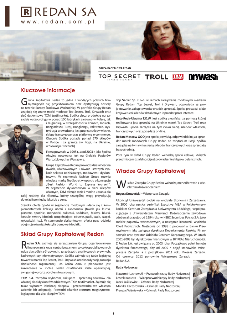 GRUPA KAPITAŁOWA REDAN Kluczowe informacje G Top Secret Sp. z o.o. w ramach zarządzania modowymi markami Grupy Redan: Top Secret, Troll i Drywash, odpowiada za projektowanie, zakup towarów oraz ich sprzedaż. Spółka prowadzi także krajowe sieci sklepów detalicznych i sprzedaż przez Internet. rupa Kapitałowa Redan to jedna z wiodących polskich firm zajmujących się projektowaniem oraz dystrybucją odzieży na terenie Europy Środkowo-Wschodniej. W portfolio Grupy Redan znajdują się znane marki modowe Top Secret, Troll, Drywash oraz sieć dyskontowa TXM textilmarket. Spółka zleca produkcję na zasadzie outsourcingu w ponad 100 fabrykach zarówno w Polsce, jak i za granicą, w szczególności w Chinach, Indiach, Bangladeszu, Turcji, Hongkongu, Pakistanie. Dystrybucja prowadzona jest poprzez sklepy własne, sklepy franczyzowe oraz platformę e-commerce. Obecnie Spółka posiada ponad 670 sklepów w Polsce i za granicą (w Rosji, na Ukrainie, w Słowacji i Czechach). Beta-Reda-Ukraina T.O.W. jest spółką ukraińską, za pomocą której realizowana jest sprzedaż na Ukrainie marek Top Secret, Troll oraz Drywash. Spółka zarządza na tym rynku siecią sklepów własnych, franczyzowych oraz sprzedażą on-line. Redan Moscow OOO jest spółką rosyjską, odpowiedzialną za sprzedaż marek modowych Grupy Redan na terytorium Rosji. Spółka zarządza na tym rynku siecią sklepów franczyzowych oraz sprzedażą bezpośrednią. Firma powstała w 1995 r., a od 2003 r. jako Spółka Akcyjna notowana jest na Giełdzie Papierów Wartościowych w Warszawie. Poza tym w skład Grupy Redan wchodzą spółki celowe, których przedmiotem działalności jest prowadzenie sklepów detalicznych. Grupa Kapitałowa Redan prowadzi działalność na dwóch, równoważnych i równie istotnych rynkach sektora odzieżowego, modowym i dyskontowym. W segmencie fashion Grupa rozwija wiodącą markę Top Secret w oparciu o koncepcję „Best Fashion World to Express Yourself”. W segmencie dyskontowym w sieci sklepów własnych, TXM oferuje tanie i modne ubrania dla całej rodziny, dla klientów, którzy szczególną wagę przywiązują do relacji pomiędzy jakością a ceną. Władze Grupy Kapitałowej W skład Zarządu Grupy Redan wchodzą menedżerowie z wieloletnim doświadczeniem: Bogusz Kruszyński – Wiceprezes Zarządu Ukończył Uniwersytet Łódzki na wydziale Ekonomii i Zarządzania. W 2000 roku uzyskał certyfikat Executive MBA w Polsko-Amerykańskim Centrum Zarządzania Uniwersytetu Łódzkiego, współpracującego z Uniwersytetem Maryland. Doświadczenie zawodowe zdobywał pracując od 1994 roku w HSBC Securities Polska S.A. jako makler papierów wartościowych, a następnie kierownik Wydziału Ofert Publicznych. Następnie od 1998 r. pracował w Banku Przemysłowym jako zastępca dyrektora Departamentu Rynków Finansowych oraz dyrektor Oddziału Centrum Korporacyjnego. W latach 2001-2003 był dyrektorem finansowym w BP REAL Nieruchomości. Z Redan S.A. jest związany od 2003 roku. Początkowo pełnił funkcję dyrektora finansowego, aby od 2005 r. objąć stanowisko Wiceprezesa Zarządu, a z początkiem 2011 roku Prezesa Zarządu. Od czerwca 2012 ponownie Wiceprezes Zarządu Redan S.A. Szeroka oferta Spółki w segmencie modowym składa się z komplementarnych kolekcji ubrań i akcesoriów (takich jak kurtki, płaszcze, spodnie, marynarki, sukienki, spódnice, żakiety, bluzki, koszule, swetry i dodatki uzupełniające: obuwie, paski, szale, czapki, rękawiczki, itp.). W segmencie dyskontowym oferta poza odzieżą obejmuje również tekstylia domowe i dodatki. Skład Grupy Kapitałowej Redan R edan S.A. zajmuje się zarządzaniem Grupą, organizowaniem finansowania oraz centralizowaniem wysokospecjalizowanych usług dla spółek z Grupy m.in. zarządczych, analitycznych, prawnych, kadrowych czy informatycznych. Spółka zajmuje się także logistyką towarów marek Top Secret, Troll i Drywash oraz koordynacją rozwoju działalności zagranicznej. Do końca 2016 r. planowane jest zakończenie w spółce Redan działalności ściśle operacyjnej, związanej wprost z obrotem towarowym. Rada Nadzorcza Sławomir Lachowski – Przewodniczący Rady Nadzorczej Leszek Kapusta – Wiceprzewodniczący Rady Nadzorczej Jacek Jaśkiewicz – Członek Rady Nadzorczej Monika Kaczorowska – Członek Rady Nadzorczej Piengjaj Wiśniewska – Członek Rady Nadzorczej TXM S.A. zarządza wyborem, zakupem i sprzedażą towarów dla własnej sieci dyskontów odzieżowych TXM textilmarket. Zajmuje się także wyborem lokalizacji sklepów i przeprowadza we własnym zakresie ich adaptację. Prowadzi również centrum magazynowologistyczne dla sieci sklepów TXM. 1 utworzona spółka O.O.O. Redan-Moskwa koordynująca sprzedaż na terenie Rosji. Struktura akcjonariatu W 2014 r. sieć TXM textilmarket rozpoczęła działalność na rynkach zagranicznych, poprzez pierwsze otwarcia placówek na Słowacji i w Czechach. W celu koordynowania tych działań zostały założone spółki: Adesso TXM s.r.o, Adesso Slovakia s.r.o. Dalszy rozwój ekspansji zagranicznej sieci planowany jest na tych rynkach oraz w Rumunii, w której w 2015 r. została założona spółka Adesso TXM Romania SRL. Wg liczby akcji Radosław Wiśniewski 40% Piengjaj Wiśniewska 21% free float 39% W listopadzie 2014 r. Redan S.A. pozyskał fundusz private equity 21 Concordia wchodzący w skład grupy 21 Partners. Inwestor nabył mniejszościowy pakiet 25% akcji TXM S.A. za kwotę 35 mln zł. W kwietniu 2015 r. – wykonując posiadaną opcję – inwestor zwiększył zaangażowanie w TXM S.A. do 36%. Wg liczby głosów na WZA Radosław Wiśniewski 47% Piengjaj Wiśniewska 18% free float 35% Wraz z początkiem 2015 r. Grupa Redan dokonała zmiany nazwy spółki zależnej Adesso S.A. na nową, TXM S.A. celem ułatwienia kojarzenia nazwy firmy z zarządzaną przez nią siecią dyskontową TXM textilmarket. W 2015 r. Redan planuje także wprowadzenie TXM na 