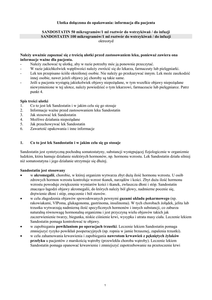 Ulotka dołączona do opakowania: informacja dla pacjenta SANDOSTATIN 50 mikrogramów/1 ml roztwór do wstrzykiwań / do infuzji SANDOSTATIN 100 mikrogramów/1 ml roztwór do wstrzykiwań / do infuzji oktreotyd Należy uważnie zapoznać się z treścią ulotki przed zastosowaniem leku, ponieważ zawiera ona informacje ważne dla pacjenta. Należy zachować tę ulotkę, aby w razie potrzeby móc ją ponownie przeczytać. W razie jakichkolwiek wątpliwości należy zwrócić się do lekarza, farmaceuty lub pielęgniarki. Lek ten przepisano ściśle określonej osobie. Nie należy go przekazywać innym. Lek może zaszkodzić innej osobie, nawet jeżeli objawy jej choroby są takie same. Jeśli u pacjenta wystąpią jakiekolwiek objawy niepożądane, w tym wszelkie objawy niepożądane niewymienione w tej ulotce, należy powiedzieć o tym lekarzowi, farmaceucie lub pielęgniarce. Patrz punkt 4. Spis treści ulotki 1. Co to jest lek Sandostatin i w jakim celu się go stosuje 2. Informacje ważne przed zastosowaniem leku Sandostatin 3. Jak stosować lek Sandostatin 4. Możliwe działania niepożądane 5. Jak przechowywać lek Sandostatin 6. Zawartość opakowania i inne informacje 1. Co to jest lek Sandostatin i w jakim celu się go stosuje Sandostatin jest syntetyczną pochodną somatostatyny, substancji występującej fizjologicznie w organizmie ludzkim, która hamuje działanie niektórych hormonów, np. hormonu wzrostu. Lek Sandostatin działa silniej niż somatostatyna i jego działanie utrzymuje się dłużej. Sandostatin jest stosowany w akromegalii, chorobie, w której organizm wytwarza zbyt dużą ilość hormonu wzrostu. U osób zdrowych hormon wzrostu kontroluje wzrost tkanek, narządów i kości. Zbyt duża ilość hormonu wzrostu powoduje zwiększenie wymiarów kości i tkanek, zwłaszcza dłoni i stóp. Sandostatin znacząco łagodzi objawy akromegalii, do których należy ból głowy, nadmierne pocenie się, drętwienie dłoni i stóp, zmęczenie i ból stawów. w celu złagodzenia objawów spowodowanych pewnymi guzami układu pokarmowego (np. rakowiakami, VIPoma, glukagonoma, gastrinoma, insulinoma). W tych chorobach żołądek, jelita lub trzustka wytwarzają nadmierną ilość specyficznych hormonów i innych substancji, co zaburza naturalną równowagę hormonalną organizmu i jest przyczyną wielu objawów takich jak zaczerwienienie twarzy, biegunka, niskie ciśnienie krwi, wysypka i utrata masy ciała. Leczenie lekiem Sandostatin pomaga kontrolować te objawy. w zapobieganiu powikłaniom po operacjach trzustki. Leczenie lekiem Sandostatin pomaga zmniejszyć ryzyko powikłań pooperacyjnych (np. ropnia w jamie brzusznej, zapalenia trzustki). w celu zahamowania krwawienia i zapobiegania nawrotom krwawień z pękniętych żylaków przełyku u pacjentów z marskością wątroby (przewlekła choroba wątroby). Leczenie lekiem Sandostatin pomaga opanować krwawienie i zmniejszyć zapotrzebowanie na przetoczenie krwi 1 w leczeniu guzów przysadki wydzielających zbyt dużą ilość hormonu tyreotropowego (TSH). Zbyt duża ilość hormonu tyreotropowego (TSH) prowadzi do nadczynności tarczycy. Lek Sandostatin jest stosowany u osób z guzami przysadki wydzielającymi zbyt dużą ilość hormonu tyreotropowego (TSH): gdy inne rodzaje leczenia (leczenie chirurgiczne lub radioterapia) są nieodpowiednie lub nieskuteczne; po radioterapii w okresie przejściowym, zanim radioterapia osiągnie pełną skuteczność. 2. Informacje ważne przed zastosowaniem leku Sandostatin Kiedy nie stosować leku Sandostatin: jeśli pacjent ma uczulenie na oktreotyd lub którykolwiek z pozostałych składników tego leku (wymienionych w punkcie 6). Ostrzeżenia i środki ostrożności Przed rozpoczęciem stosowania leku Sandostatin należy omówić to z lekarzem: - jeśli pacjent wie, że ma lub miał w przeszłości kamienie żółciowe; należy powiedzieć o tym lekarzowi, ponieważ długotrwałe stosowanie leku Sandostatin może powodować powstawanie kamieni żółciowych. Lekarz może zlecić okresową kontrolę pęcherzyka żółciowego. - jeśli u pacjenta występują problemy ze stężeniem cukru we krwi i jest ono zbyt duże (cukrzyca) lub zbyt małe (hipoglikemia). Jeśli lek Sandostatin jest stosowany w leczeniu krwawień z żylaków przełyku; kontrolowanie stężenia cukru we krwi jest konieczne. - jeśli pacjent miał w przeszłości zmniejszone stężenie witaminy B12, lekarz może zalecić okresową kontrolę stężenia witaminy B12. Badania i wizyty kontrolne Jeśli pacjent jest długotrwale leczony lekiem Sandostatin, lekarz może zlecić okresową kontrolę czynności tarczycy. Lekarz będzie kontrolował czynność wątroby pacjenta. Dzieci Doświadczenie dotyczące stosowania leku Sandostatin u dzieci jest niewielkie. Sandostatin a inne leki Należy powiedzieć lekarzowi lub farmaceucie o wszystkich lekach przyjmowanych przez pacjenta obecnie lub ostatnio, a także o lekach, które pacjent planuje przyjmować. Podczas leczenia lekiem Sandostatin można na ogół kontynuować przyjmowanie innych leków. Zgłaszano jednak, że Sandostatin wpływa na działanie pewnych leków, takich jak cymetydyna, cyklosporyna, bromokryptyna, chinidyna i terfenadyna. Jeśli pacjent przyjmuje lek kontrolujący ciśnienie krwi (np. antagonistę receptorów beta-adrenergicznych lub antagonistę kanałów wapniowych) bądź lek utrzymujący równowagę wodno-elektrolitową, lekarz może dostosować dawkowanie. U pacjentów z cukrzycą może zajść konieczność dostosowania dawki insuliny przez lekarza. 2 Ciąża i karmienie piersią Jeśli pacjentka jest w ciąży lub karmi piersią, przypuszcza, że może być w ciąży lub gdy planuje mieć dziecko, powinna poradzić się lekarza przed zastosowaniem tego leku. Lek Sandostatin może być stosowany podczas ciąży tylko w razie wyraźnej konieczności. Pacjentki w wieku rozrodczym powinny podczas leczenia stosować skuteczne metody zapobiegania ciąż