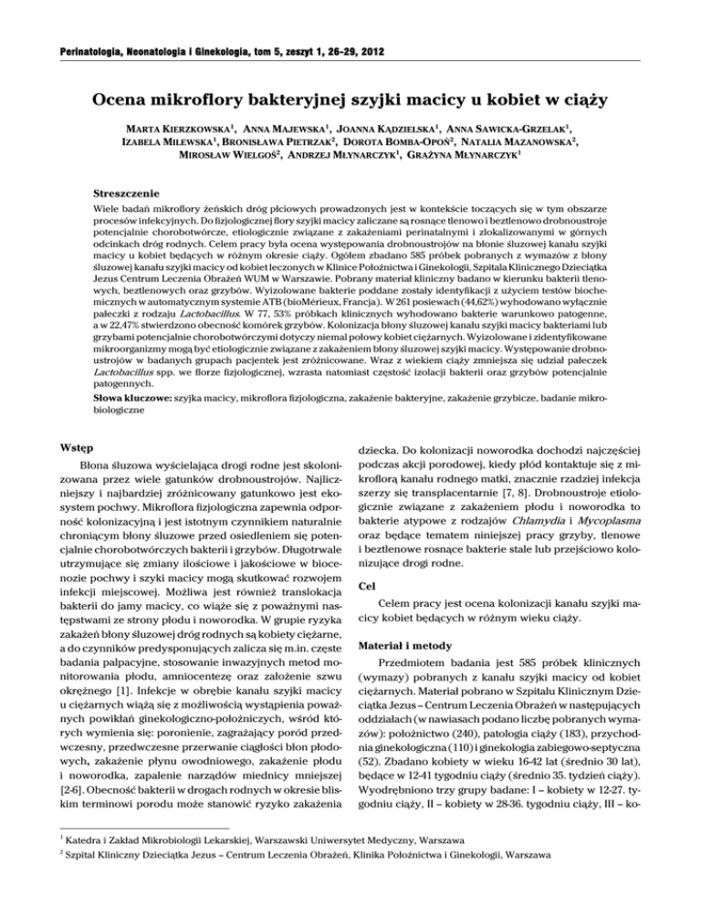 Perinatologia, Neonatologia i Ginekologia, tom 5, zeszyt 1, 26-29, 2012 Ocena mikroflory bakteryjnej szyjki macicy u kobiet w ciąży MARTA KIERZKOWSKA1, ANNA MAJEWSKA1, JOANNA KĄDZIELSKA1, ANNA SAWICKA-GRZELAK1, IZABELA MILEWSKA1, BRONISŁAWA PIETRZAK2, DOROTA BOMBA-OPOŃ2, NATALIA MAZANOWSKA2, MIROSŁAW WIELGOŚ2, ANDRZEJ MŁYNARCZYK1, GRAŻYNA MŁYNARCZYK1 Streszczenie Wiele badań mikroflory żeńskich dróg płciowych prowadzonych jest w kontekście toczących się w tym obszarze procesów infekcyjnych. Do fizjologicznej flory szyjki macicy zaliczane są rosnące tlenowo i beztlenowo drobnoustroje potencjalnie chorobotwórcze, etiologicznie związane z zakażeniami perinatalnymi i zlokalizowanymi w górnych odcinkach dróg rodnych. Celem pracy była ocena występowania drobnoustrojów na błonie śluzowej kanału szyjki macicy u kobiet będących w różnym okresie ciąży. Ogółem zbadano 585 próbek pobranych z wymazów z błony śluzowej kanału szyjki macicy od kobiet leczonych w Klinice Położnictwa i Ginekologii, Szpitala Klinicznego Dzieciątka Jezus Centrum Leczenia Obrażeń WUM w Warszawie. Pobrany materiał kliniczny badano w kierunku bakterii tlenowych, beztlenowych oraz grzybów. Wyizolowane bakterie poddane zostały identyfikacji z użyciem testów biochemicznych w automatycznym systemie ATB (bioMérieux, Francja). W 261 posiewach (44,62%) wyhodowano wyłącznie pałeczki z rodzaju Lactobacillus. W 77, 53% próbkach klinicznych wyhodowano bakterie warunkowo patogenne, a w 22,47% stwierdzono obecność komórek grzybów. Kolonizacja błony śluzowej kanału szyjki macicy bakteriami lub grzybami potencjalnie chorobotwórczymi dotyczy niemal połowy kobiet ciężarnych. Wyizolowane i zidentyfikowane mikroorganizmy mogą być etiologicznie związane z zakażeniem błony śluzowej szyjki macicy. Występowanie drobnoustrojów w badanych grupach pacjentek jest zróżnicowane. Wraz z wiekiem ciąży zmniejsza się udział pałeczek Lactobacillus spp. we florze fizjologicznej, wzrasta natomiast częstość izolacji bakterii oraz grzybów potencjalnie patogennych. Słowa kluczowe: szyjka macicy, mikroflora fizjologiczna, zakażenie bakteryjne, zakażenie grzybicze, badanie mikrobiologiczne Wstęp Błona śluzowa wyścielająca drogi rodne jest skolonizowana przez wiele gatunków drobnoustrojów. Najliczniejszy i najbardziej zróżnicowany gatunkowo jest ekosystem pochwy. Mikroflora fizjologiczna zapewnia odporność kolonizacyjną i jest istotnym czynnikiem naturalnie chroniącym błony śluzowe przed osiedleniem się potencjalnie chorobotwórczych bakterii i grzybów. Długotrwale utrzymujące się zmiany ilościowe i jakościowe w biocenozie pochwy i szyki macicy mogą skutkować rozwojem infekcji miejscowej. Możliwa jest również translokacja bakterii do jamy macicy, co wiąże się z poważnymi następstwami ze strony płodu i noworodka. W grupie ryzyka zakażeń błony śluzowej dróg rodnych są kobiety ciężarne, a do czynników predysponujących zalicza się m.in. częste badania palpacyjne, stosowanie inwazyjnych metod monitorowania płodu, amniocentezę oraz założenie szwu okrężnego [1]. Infekcje w obrębie kanału szyjki macicy u ciężarnych wiążą się z możliwością wystąpienia poważnych powikłań ginekologiczno-położniczych, wśród których wymienia się: poronienie, zagrażający poród przedwczesny, przedwczesne przerwanie ciągłości błon płodowych, zakażenie płynu owodniowego, zakażenie płodu i noworodka, zapalenie narządów miednicy mniejszej [2-6]. Obecność bakterii w drogach rodnych w okresie bliskim terminowi porodu może stanowić ryzyko zakażenia dziecka. Do kolonizacji noworodka dochodzi najczęściej podczas akcji porodowej, kiedy płód kontaktuje się z mikroflorą kanału rodnego matki, znacznie rzadziej infekcja szerzy się transplacentarnie [7, 8]. Drobnoustroje etiologicznie związane z zakażeniem płodu i noworodka to bakterie atypowe z rodzajów Chlamydia i Mycoplasma oraz będące tematem niniejszej pracy grzyby, tlenowe i beztlenowe rosnące bakterie stale lub przejściowo kolonizujące drogi rodne. Cel Celem pracy jest ocena kolonizacji kanału szyjki macicy kobiet będących w różnym wieku ciąży. Materiał i metody Przedmiotem badania jest 585 próbek klinicznych (wymazy) pobranych z kanału szyjki macicy od kobiet ciężarnych. Materiał pobrano w Szpitalu Klinicznym Dzieciątka Jezus – Centrum Leczenia Obrażeń w następujących oddziałach (w nawiasach podano liczbę pobranych wymazów): położnictwo (240), patologia ciąży (183), przychodnia ginekologiczna (110) i ginekologia zabiegowo-septyczna (52). Zbadano kobiety w wieku 16-42 lat (średnio 30 lat), będące w 12-41 tygodniu ciąży (średnio 35. tydzień ciąży). Wyodrębniono trzy grupy badane: I – kobiety w 12-27. tygodniu ciąży, II – kobiety w 28-36. tygodniu ciąży, III – ko- 1 Katedra i Zakład Mikrobiologii Lekarskiej, Warszawski Uniwersytet Medyczny, Warszawa 2 Szpital Kliniczny Dzieciątka Jezus – Centrum Leczenia Obrażeń, Klinika Położnictwa i Ginekologii, Warszawa 27 Ocena mikroflory bakteryjnej szyjki macicy u kobiet w ciąży biety w 37-41. tygodniu ciąży. U pacjentek w grupie I i II stwierdzono ryzyko zagrażającego porodu przedwczesnego z powodu np. niewydolności ciśnieniowo-szyjkowej, odpływania płynu owodniowego, krwawienia, skurczów lub zaobserwowano wady płodu takie jak: małowodzie, wielowodzie, hipotrofia. Grupę III stanowiły kobiety, przyjęte na oddział celem odbycia porodu. Materiał posiewano w kierunku bakterii tlenowych, beztlenowych i grzybów na odpowiednie podłoża mikrobiologiczne. Wstępnej identyfikacji dokonano na podstawie morfologii kolonii, barwienia metodą Grama, testu aerotolerancji. Identyfikację i ocenę lekowrażliwości przeprowadzono za pomocą testów w automatycznym systemie ATB Expression. Tabela 1. Bakterie rosnące tlenowo i beztlenowo oraz grzyby izolowane z kana