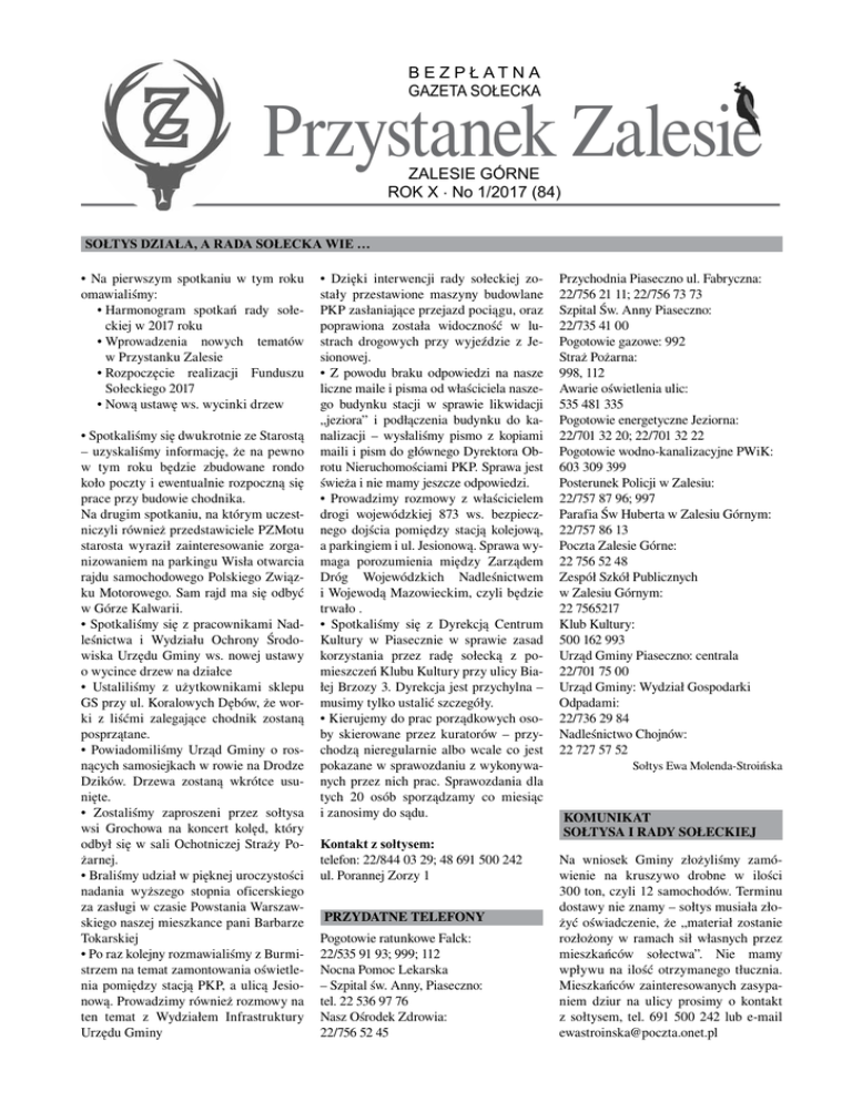 B E Z P Ł AT N A GAZETA SOŁECKA Przystanek Zalesie ZALESIE GÓRNE ROK X . No 1/2017 (84) Sołtys działa, a rada sołecka wie … • Na pierwszym spotkaniu w tym roku omawialiśmy: • Harmonogram spotkań rady sołeckiej w 2017 roku • Wprowadzenia nowych tematów w Przystanku Zalesie • Rozpoczęcie realizacji Funduszu Sołeckiego 2017 • Nową ustawę ws. wycinki drzew • Spotkaliśmy się dwukrotnie ze Starostą – uzyskaliśmy informację, że na pewno w tym roku będzie zbudowane rondo koło poczty i ewentualnie rozpoczną się prace przy budowie chodnika. Na drugim spotkaniu, na którym uczestniczyli również przedstawiciele PZMotu starosta wyraził zainteresowanie zorganizowaniem na parkingu Wisła otwarcia rajdu samochodowego Polskiego Związku Motorowego. Sam rajd ma się odbyć w Górze Kalwarii. • Spotkaliśmy się z pracownikami Nadleśnictwa i Wydziału Ochrony Środowiska Urzędu Gminy ws. nowej ustawy o wycince drzew na działce • Ustaliliśmy z użytkownikami sklepu GS przy ul. Koralowych Dębów, że worki z liśćmi zalegające chodnik zostaną posprzątane. • Powiadomiliśmy Urząd Gminy o rosnących samosiejkach w rowie na Drodze Dzików. Drzewa zostaną wkrótce usunięte. • Zostaliśmy zaproszeni przez sołtysa wsi Grochowa na koncert kolęd, który odbył się w sali Ochotniczej Straży Pożarnej. • Braliśmy udział w pięknej uroczystości nadania wyższego stopnia oficerskiego za zasługi w czasie Powstania Warszawskiego naszej mieszkance pani Barbarze Tokarskiej • Po raz kolejny rozmawialiśmy z Burmistrzem na temat zamontowania oświetlenia pomiędzy stacją PKP, a ulicą Jesionową. Prowadzimy również rozmowy na ten temat z Wydziałem Infrastruktury Urzędu Gminy • Dzięki interwencji rady sołeckiej zostały przestawione maszyny budowlane PKP zasłaniające przejazd pociągu, oraz poprawiona została widoczność w lustrach drogowych przy wyjeździe z Jesionowej. • Z powodu braku odpowiedzi na nasze liczne maile i pisma od właściciela naszego budynku stacji w sprawie likwidacji „jeziora” i podłączenia budynku do kanalizacji – wysłaliśmy pismo z kopiami maili i pism do głównego Dyrektora Obrotu Nieruchomościami PKP. Sprawa jest świeża i nie mamy jeszcze odpowiedzi. • Prowadzimy rozmowy z właścicielem drogi wojewódzkiej 873 ws. bezpiecznego dojścia pomiędzy stacją kolejową, a parkingiem i ul. Jesionową. Sprawa wymaga porozumienia między Zarządem Dróg Wojewódzkich Nadleśnictwem i Wojewodą Mazowieckim, czyli będzie trwało . • Spotkaliśmy się z Dyrekcją Centrum Kultury w Piasecznie w sprawie zasad korzystania przez radę sołecką z pomieszczeń Klubu Kultury przy ulicy Białej Brzozy 3. Dyrekcja jest przychylna – musimy tylko ustalić szczegóły. • Kierujemy do prac porządkowych osoby skierowane przez kuratorów – przychodzą nieregularnie albo wcale co jest pokazane w sprawozdaniu z wykonywanych przez nich prac. Sprawozdania dla tych 20 osób sporządzamy co miesiąc i zanosimy do sądu. Kontakt z sołtysem: telefon: 22/844 03 29; 48 691 500 242 ul. Porannej Zorzy 1 Przydatne telefony Pogotowie ratunkowe Falck: 22/535 91 93; 999; 112 Nocna Pomoc Lekarska – Szpital św. Anny, Piaseczno: tel. 22 536 97 76 Nasz Ośrodek Zdrowia: 22/756 52 45 Przychodnia Piaseczno ul. Fabryczna: 22/756 21 11; 22/756 73 73 Szpital Św. Anny Piaseczno: 22/735 41 00 Pogotowie gazowe: 992 Straż Pożarna: 998, 112 Awarie oświetlenia ulic: 535 481 335 Pogotowie energetyczne Jeziorna: 22/701 32 20; 22/701 32 22 Pogotowie wodno-kanalizacyjne PWiK: 603 309 399 Posterunek Policji w Zalesiu: 22/757 87 96; 997 Parafia Św Huberta w Zalesiu Górnym: 22/757 86 13 Poczta Zalesie Górne: 22 756 52 48 Zespół Szkół Publicznych w Zalesiu Górnym: 22 7565217 Klub Kultury: 500 162 993 Urząd Gminy Piaseczno: centrala 22/701 75 00 Urząd Gminy: Wydział Gospodarki Odpadami: 22/736 29 84 Nadleśnictwo Chojnów: 22 727 57 52 Sołtys Ewa Molenda-Stroińska KOMUNIKAT SOŁTYSA I RADY SOŁECKIEJ Na wniosek Gminy złożyliśmy zamówienie na kruszywo drobne w ilości 300 ton, czyli 12 samochodów. Terminu dostawy nie znamy – sołtys musiała złożyć oświadczenie, że „materiał zostanie rozłożony w ramach sił własnych przez mieszkańców sołectwa”. Nie mamy wpływu na ilość otrzymanego tłucznia. Mieszkańców zainteresowanych zasypaniem dziur na ulicy prosimy o kontakt z sołtysem, tel. 691 500 242 lub e-mail [email protected] POŻEGNANIE „Śmierć – to ciągłego postępu chorąży, który na nowe tory świat prowadzi i z rzeszą istot w nieskończoność dąży.” Asnyk W taką nieskończoność, nam jeszcze nieznaną, podążył śp. Jerzy, nasz pierwszy, długoletni Prezes Klubu Seniora „Złota Jesień” w Zalesiu Górnym. Był przybyszem, który zobaczywszy Zalesie w nim pozostał, zapuścił korzenie i tak jak miał w zwyczaju, bardzo szybko włączył się w działalność społeczną na rzecz naszej miejscowości. Jako, że był dziennikarzem, to wiedział jak należy działać. Spotykaliśmy Jerzego na wszelkiego rodzaju akcjach, festynach i różnych przedsięwzięciach społecznych. Pisał do naszego pisemka „Przystanek Zalesie” na aktualne tematy, którymi właśnie żyli mieszkańcy Zalesia. Współpracował z Radą Sołecką, ze Stowarzyszeniem Przyjaciół Zalesia Górnego, z Klubem Kultury, ze Stowarzyszeniem „Razem Lepiej”, przedstawicielami władz samorządowych i kulturalnych. Widać stąd, że był bardzo czynnym i bardzo pożytecznym Zalesianinem. Przez taką szeroką działalność pozostawił swój ślad w różnych dziedzinach życia Zalesia. H. Sienkiewicz kiedyś powiedział: „Zmarli nas opuszczają, ale i my też ich opuszczamy.” Ale to nie zawsze jest prawdą. Bo my zalesianie – seniorzy będziemy Ciebie Jurku, szefie wspominać, a przede wszystkim pamiętać w modlitwach, aby wieczny spoczynek w Bożych ramionach przyniósł Ci szczęście i Zmartwychwstanie. D