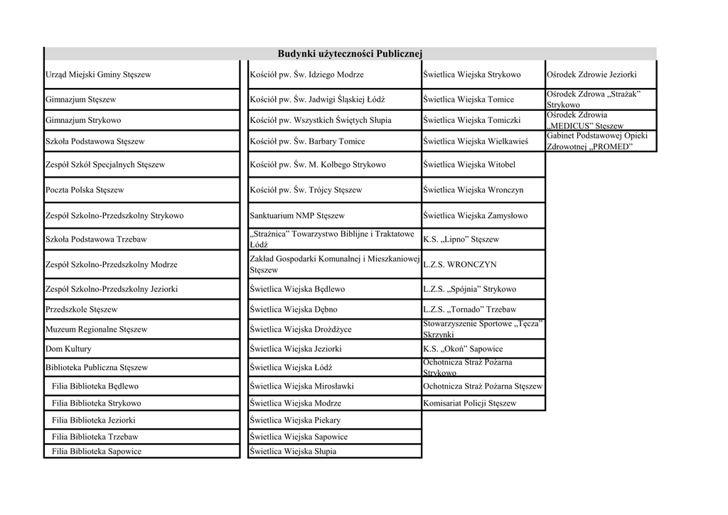 Budynki użyteczności Publicznej Urząd Miejski Gminy Stęszew Kościół pw. Św. Idziego Modrze Świetlica Wiejska Strykowo Gimnazjum Stęszew Kościół pw. Św. Jadwigi Śląskiej Łódź Świetlica Wiejska Tomice Gimnazjum Strykowo Kościół pw. Wszystkich Świętych Słupia Świetlica Wiejska Tomiczki Szkoła Podstawowa Stęszew Kościół pw. Św. Barbary Tomice Świetlica Wiejska Wielkawieś Zespół Szkół Specjalnych Stęszew Kościół pw. Św. M. Kolbego Strykowo Świetlica Wiejska Witobel Poczta Polska Stęszew Kościół pw. Św. Trójcy Stęszew Świetlica Wiejska Wronczyn Zespół Szkolno-Przedszkolny Strykowo Sanktuarium NMP Stęszew Świetlica Wiejska Zamysłowo Szkoła Podstawowa Trzebaw „Strażnica” Towarzystwo Biblijne i Traktatowe Łódź K.S. „Lipno” Stęszew Zespół Szkolno-Przedszkolny Modrze Zakład Gospodarki Komunalnej i Mieszkaniowej L.Z.S. WRONCZYN Stęszew Zespół Szkolno-Przedszkolny Jeziorki Świetlica Wiejska Będlewo L.Z.S. „Spójnia” Strykowo Przedszkole Stęszew Świetlica Wiejska Dębno L.Z.S. „Tornado” Trzebaw Muzeum Regionalne Stęszew Świetlica Wiejska Drożdżyce Stowarzyszenie Sportowe „Tęcza” Skrzynki Dom Kultury Świetlica Wiejska Jeziorki K.S. „Okoń” Sapowice Biblioteka Publiczna Stęszew Świetlica Wiejska Łódź Ochotnicza Straż Pożarna Strykowo Filia Biblioteka Będlewo Świetlica Wiejska Mirosławki Ochotnicza Straż Pożarna Stęszew Filia Biblioteka Strykowo Świetlica Wiejska Modrze Komisariat Policji Stęszew Filia Biblioteka Jeziorki Świetlica Wiejska Piekary Filia Biblioteka Trzebaw Świetlica Wiejska Sapowice Filia Biblioteka Sapowice Świetlica Wiejska Słupia Ośrodek Zdrowie Jeziorki Ośrodek Zdrowa „Strażak” Strykowo Ośrodek Zdrowia „MEDICUS” Stęszew Gabinet Podstawowej Opieki Zdrowotnej „PROMED” GASTRONOMIA Zagroda Chłopska, Będlewo, ul. Wrocławska 95 Ośrodek Konferencyjny Instytutu Matematycznego PAN, Będlewo, ul. Parkowa 1 Bar w Dębienku Ośrodek Szkoleniowo-Wypoczynkowy „Drogowiec”, Skrzynki, ul. Plac Parkowy 1 Motel 2000, Stęszew, ul. Kościańska 89 Motel AB, Stęszew, ul. Narutowicza 2 Camping „Nad Lipnem” s.c., Stęszew, ul. Chrobrego 81 Lake Hotel, Dymaczewo, ul. Mosińska 2 „Bistro Kupczyn”, Stęszew, ul. Kosickiego 14 „Bistro Park”, Stęszew, ul. Poznańska 14 C „Lokanta”, Stęszew, ul. Dworcowa 1C Pizzeria Marino, Stęszew, ul. Poznańska Bar u Picia, Stęszew, ul. Bukowska 10 La Pyra, Stęszew, ul. Narutowicza 1 P.W. ARTURO, Stęszew, ul. Narutowicza 1 Mobilkowe Pogotowie Posiłkowe Pyra z Gzikiem, Stęszew, ul. Narutowicza 1 Zamek Von Trescov, Strykowo, ul. Park 3 Ośrodek Feniks, Strykowo, ul. Bukowska Bar „Pod Lipami”, Rybojedzko, ul. Stęszewska 1 Hotel Restauracja Delicjusz, Trzebaw, ul. Poznańska 1 Bar Pod Dębami, Trzebaw, ul. Poznańska 2 INNE OBIEKTY NIEZAMIESZKAŁE Cmentarze Cmentarz Stęszew Cmentarz Strykowo Cmentarz Modrze Cmentarz Łódź Cmentarz Słupia Cmentarz Tomice Odpady komunalne 04.07.2013 Odpady selektywne 07.11.2013 Trzebaw, Będlewo, Łódź, Dębno, Debienko Strykowo, Modrze, Drożdżyce, Wroczyn, Jeziorki, Sapowice, Słupia, Tomice, Mirosławki, Piekary, Tomiczki, Wielka Wieś, Skrzynki PET i makulatura PET i makulatura 11.07.2013 14.11.2013 18.07.2013 21.11.2013 25.07.2013 28.11.2013 01.08.2013 05.12.2013 08.08.2013 12.12.2013 04.07.2013 11.07.2013 09.07.2013 10.07.2013 17.08.2013 19.12.2013 01.08.2013 08.08.2013 06.08.2013 07.08.2013 22.08.2013 27.12.2013 29.08.2013 05.09.2013 03.09.2013 04.09.2013 29.08.2013 26.09.2013 03.10.2013 01.10.2013 02.10.2013 05.09.2013 24.10.2013 31.10.2013 29.10.2013 30.10.2013 12.09.2013 21.11.2013 28.11.2013 26.11.2013 27.11.2013 19.09.2013 19.12.2013 28.12.2013 24.12.2013 27.12.2013 26.09.2013 Szkło Szkło Szkło Szkło 03.10.2013 17.07.2013 24.07.2013 24.07.2013 24.07.2013 10.10.2013 14.08.2013 21.08.2013 21.08.2013 21.08.2013 17.10.2013 21.09.2013 18.09.2013 18.09.2013 18.09.2013 24.10.2013 09.10.2013 16.10.2013 16.10.2013 16.10.2013 31.10.2013 05.11.2013 13.11.2013 13.11.2013 13.11.2013 04.12.2013 11.12.2012 11.12.2012 11.12.2013 STĘSZEW PET i makulatura PET i makulatura