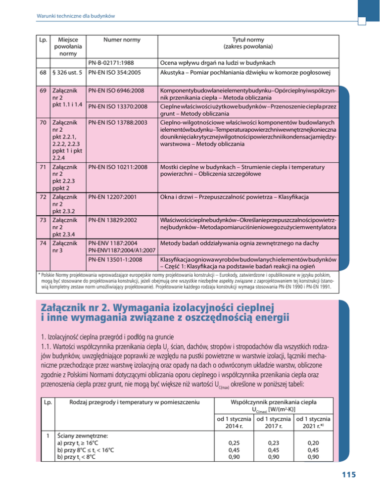 Warunki techniczne dla budynków Lp. Miejsce powołania normy Numer normy PN-B-02171:1988 Tytuł normy (zakres powołania) Ocena wpływu drgań na ludzi w budynkach 68 § 326 ust. 5 PN-EN ISO 354:2005 Akustyka – Pomiar pochłaniania dźwięku w komorze pogłosowej 69 Załącznik PN-EN ISO 6946:2008 nr 2 pkt 1.1 i 1.4 PN-EN ISO 13370:2008 Komponentybudowlanei elementybudynku–Opórcieplnyi współczynnik przenikania ciepła – Metoda obliczania Cieplne właściwości użytkowe budynków – Przenoszenie ciepła przez grunt – Metody obliczania Cieplno-wilgotnościowe właściwości komponentów budowlanych i elementówbudynku–Temperaturapowierzchniwewnętrznejkonieczna do uniknięciakrytycznejwilgotnościpowierzchnii kondensacjamiędzywarstwowa – Metody obliczania 70 Załącznik nr 2 pkt 2.2.1, 2.2.2, 2.2.3 ppkt 1 i pkt 2.2.4 71 Załącznik nr 2 pkt 2.2.3 ppkt 2 72 Załącznik nr 2 pkt 2.3.2 73 Załącznik nr 2 pkt 2.3.4 74 Załącznik nr 3 PN-EN ISO 13788:2003 PN-EN ISO 10211:2008 Mostki cieplne w budynkach – Strumienie ciepła i temperatury powierzchni – Obliczenia szczegółowe PN-EN 12207:2001 Okna i drzwi – Przepuszczalność powietrza – Klasyfikacja PN-EN 13829:2002 Właściwościcieplnebudynków–Określanieprzepuszczalnościpowietrznejbudynków–Metodapomiaruciśnieniowegoz użyciemwentylatora PN-ENV 1187:2004 Metody badań oddziaływania ognia zewnętrznego na dachy PN-ENV1187:2004/A1:2007 PN-EN 13501-1:2008 Klasyfikacja ogniowa wyrobów budowlanych i elementów budynków – Część 1: Klasyfikacja na podstawie badań reakcji na ogień * Polskie Normy projektowania wprowadzające europejskie normy projektowania konstrukcji – Eurokody, zatwierdzone i opublikowane w języku polskim, mogą być stosowane do projektowania konstrukcji, jeżeli obejmują one wszystkie niezbędne aspekty związane z zaprojektowaniem tej konstrukcji (stanowią kompletny zestaw norm umożliwiający projektowanie). Projektowanie każdego rodzaju konstrukcji wymaga stosowania PN-EN 1990 i PN-EN 1991. Załącznik nr 2. Wymagania izolacyjności cieplnej i inne wymagania związane z oszczędnością energii 1. Izolacyjność cieplna przegród i podłóg na gruncie 1.1. Wartości współczynnika przenikania ciepła UC ścian, dachów, stropów i stropodachów dla wszystkich rodzajów budynków, uwzględniające poprawki ze względu na pustki powietrzne w warstwie izolacji, łączniki mechaniczne przechodzące przez warstwę izolacyjną oraz opady na dach o odwróconym układzie warstw, obliczone zgodnie z Polskimi Normami dotyczącymi obliczania oporu cieplnego i współczynnika przenikania ciepła oraz przenoszenia ciepła przez grunt, nie mogą być większe niż wartości UC(max) określone w poniższej tabeli: Lp. Rodzaj przegrody i temperatury w pomieszczeniu Współczynnik przenikania ciepła UC(max) [W/(m2·K)] od 1 stycznia od 1 stycznia od 1 stycznia 2014 r. 2017 r. 2021 r.*) 1 Ściany zewnętrzne: a) przy ti ≥ 16°C b) przy 8°C ≤ ti < 16°C b) przy ti < 8°C 0,25 0,45 0,90 0,23 0,45 0,90 0,20 0,45 0,90 115 Warunki techniczne dla budynków 2 Ściany wewnętrzne: a) przy Dti ≥ 8°C oraz oddzielające pomieszczenia ogrzewane 1,00 1,00 1,00 od klatek schodowych i korytarzy bezwymagań bezwymagań bezwymagań b) przy Dti < 8°C 0,30 0,30 0,30 c)oddzielającepomieszczenieogrzewaneod nieogrzewanego 3 Ściany przyległe do szczelin dylatacyjnych o szerokości: a) do 5 cm, trwale zamkniętych i wypełnionych izolacją cieplną na głębokości co najmniej 20 cm b)powyżej5 cm,niezależnieod przyjętegosposobuzamknięcia i zaizolowania szczeliny 1,00 1,00 1,00 0,70 0,70 0,70 4 Ściany nieogrzewanych kondygnacji podziemnych 5 Dachy,stropodachyi stropypodnieogrzewanymipoddaszami lub nad przejazdami: a) przy ti ≥ 16°C b) przy 8°C ≤ ti < 16°C b) przy ti < 8°C 0,20 0,30 0,70 0,18 0,30 0,70 0,15 0,30 0,70 6 Podłogi na gruncie: a) przy ti ≥ 16°C b) przy 8°C ≤ ti < 16°C b) przy ti < 8°C 0,30 1,20 1,50 0,30 1,20 1,50 0,30 1,20 1,50 7 Stropy nad pomieszczeniami nieogrzewanymi i zamkniętymi przestrzeniami podpodłogowymi: a) przy ti ≥ 16°C b) przy 8°C ≤ ti < 16°C b) przy ti < 8°C 0,25 0,30 1,00 0,25 0,30 1,00 0,25 0,30 1,00 8 bezwymagań bezwymagań bezwymagań Stropy nad ogrzewanymi pomieszczeniami podziemnymi i stropy międzykondygnacyjne: a) przy Dti ≥ 8°C 1,00 1,00 1,00 b) przy Dti < 8°C bezwymagań bezwymagań bezwymagań c)oddzielającepomieszczenieogrzewaneod nieogrzewanego 0,25 0,25 0,25 Pomieszczenie ogrzewane – pomieszczenie, w którym na skutek działania systemu ogrzewania lub w wyniku bilansu strat i zysków ciepła utrzymywana jest temperatura, której wartość została określona w § 134 ust. 2 rozporządzenia. ti – Temperatura pomieszczenia ogrzewanego zgodnie z § 134 ust. 2 rozporządzenia. *) Od 1 stycznia 2019 r. – w przypadku budynków zajmowanych przez władze publiczne oraz będących ich własnością. 1.2. Wartości współczynnika przenikania ciepła U okien, drzwi balkonowych i drzwi zewnętrznych nie mogą być większe niż wartości U(max) określone w poniższej tabeli: Lp. Współczynnik przenikania ciepła U(max) [W/(m2·K)] od 1 stycznia 2014 r. od 1 stycznia 2017 r. od 1 stycznia 2021 r.*) Okna (z wyjątkiem okien połaciowych), drzwi balkonowe i powierzchnie przezroczyste nieotwieralne: a) przy ti ≥ 16°C b) przy ti < 16°C 1,3 1,8 1,1 1,6 0,9 1,4 2 Okna połaciowe: a) przy ti ≥ 16°C b) przy ti < 16°C 1,5 1,8 1,3 1,6 1,1 1,4 3 Okna w ścianach wewnętrznych: 1,5 1,3 1,1 a) przy Dti ≥ 8°C bezwymagań bezwymagań bezwymagań b) przy Dti < 8°C 1,5 1,3 1,1 c)oddzielającepomieszczenieogrzewaneod nieogrzewanego 1 116 Okna, drzwi balkonowe i drzwi zewnętrzne Warunki techniczne dla budynków 4 Drzwiw przegrodachzewnętrznychlubw przegrodachmiędzy pomieszczeniami ogrzewanymi i nieogrzewanymi 1,7 1,5 1,3 5 Oknai drzwizewnętrznew przegrodachzewnętrznychpomieszczeń nieogrzewanych bez wymagań bez wymagań bez wymaga