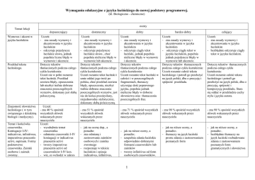 Wymagania edukacyjne z języka łacińskiego do nowej podstawy programowej. (kl. Biologiczno - chemiczne) oceny Temat lekcji Wymowa i akcent w języku łacińskim Przekład tekstu łacińskiego. Znajomość słownictwa łacińskiego ( w tym związanego z dziedziną biologii i medycyny). Temat i końcówka czasownika. Koniugacje I-IV: indicativus, infinitiwus, imperatiwus praesentis activi, supinum. Formy podstawowe czasownika. Zaimki osobowe i zaimek zwrotny. dopuszczający Uczeń: zna zasady wymowy i akcentowania w języku łacińskim - odczytuje pojedyncze łacińskie słowa, jednak popełnia liczne błędy w wymowie i akcencie. Dotyczy tekstów tłumaczonych podczas całego cyklu kształcenia: Uczeń nie w pełni rozumie tekst łaciński. Przekład zawiera błędy, opuszczenia lub niezbyt trafnie dobrane znaczenia poszczególnych wyrazów, dokonany jest słabą polszczyzną. - Uczeń: - zna 40 % spośród wszystkich słówek wskazanych przez nauczyciela Uczeń: - wyodrębnia temat czasownika - odmienia czasowniki I-IV koniugacji w indicativus praesentis activi - tworzy imperativus praesentis activi od czasowników I-IV kon. - wie, co wchodzi w zakres celujący dostateczny dobry bardzo dobry Uczeń: zna zasady wymowy i akcentowania w języku łacińskim - odczytuje pojedyncze łacińskie słowa , choć popełnia nieliczne błędy w wymowie lub akcencie. Dotyczy tekstów tłumaczonych podczas całego cyklu kształcenia: Uczeń rozumie tekst łaciński i umie oddać jego treść po polsku, choć przekład zawiera błędy, opuszczenia, niezbyt trafnie dobrane znaczenia poszczególnych wyrazów, jest nie do końca przemyślany, niejednorodny stylistycznie, dokonany słabą polszczyzną. Uczeń: - zna zasady wymowy i akcentowania w języku łacińskim - odczytuje ciągły tekst łaciński, jednak popełnia nieliczne błędy w wymowie i akcencie. Dotyczy tekstów tłumaczonych podczas całego cyklu kształcenia: Uczeń rozumie tekst łaciński w całości i w poszczególnych fragmentach, tłumaczy używając dość poprawnego języka, popełnia jednak nieliczne błędy w doborze słownictwa oraz tłumaczeniu poszczególnych fraz. Uczeń: - zna zasady wymowy i akcentowania w języku łacińskim - odczytuje ciągły tekst w języku łacińskim, popełnia jednak pojedyncze błędy w wymowie lub akcencie. Dotyczy tekstów tłumaczonych podczas całego cyklu kształcenia: Uczeń rozumie całość tekstu łacińskiego i potrafi go przełożyć na język polski, dba o precyzję i spójność przekładu. Uczeń: - zna zasady wymowy i akcentowania w języku łacińskim - bezbłędnie odczytuje ciągły tekst w języku łacińskim. - zna 51 % spośród wszystkich słówek wskazanych przez nauczyciela - zna 71 % spośród wszystkich słówek wskazanych przez nauczyciela - zna 90 % spośród wszystkich słówek wskazanych przez nauczyciela - zna 98 % spośród wszystkich słówek wskazanych przez nauczyciela - jak na niższe oceny, a ponadto:. - tłumaczy na język łaciński proste zdania z zastosowaniem poznanych form - jak na niższe oceny, a ponadto:. - bezbłędnie tłumaczy na język łaciński rozbudowane zdania z zastosowaniem poznanych form gramatycznych i słownictwa - - jak na ocenę dop., a ponadto: - zna odmianę i zastosowanie zaimków osobowych i zaimka zwrotnego - rozpoznaje w tekście łacińskim i opisuje indicativus, infinitivus, - jak na niższe oceny, a ponadto:. - uzupełnia zdania łacińskie odpowiednio dobranymi formami czasowników lub zaimków - tworzy infinitivus od form osobowych czasowników. 1 Dotyczy tekstów tłumaczonych podczas całego cyklu kształcenia: Uczeń rozumie całość tekstu łacińskiego i potrafi go przełożyć na język polski, dba o precyzję, spójność i kompozycję przekładu. Stara się oddać w przekładzie cechy stylu i języka autora. form podstawowych czasownika - potrafi wymienić zaimki osobowe Deklinacja I. Wyjątki rodzaju męskiego I deklinacji. Słowo posiłkowe esse. Orzeczenie imienne. Przyimki łączące się z accusatiwem i ablatiwem. Uczeń: - zna łacińskie przypadki i ich funkcje w zdaniu - wie, jakie rzeczowniki należą do I dekl. oraz ma wiedzę o wyjątkach rodzaju męskiego tej deklinacji. - potrafi odmieniać rzeczowniki I dekl. w sing. i plur. - zna odmianę w czasie praesens czasownika esse - wie, z jakimi przypadkami łączą się przyimki „in” i „de” Rzeczowniki i przymiotniki II dekl. Uczeń: - wie, jakie rzeczowniki i przymiotniki należą do II dekl., potrafi je odmieniać w sing. i plur. - potrafi wymienić zaimki dzierżawcze Indicativus imperfecti i futuri I activi I-IV kon. oraz czasownika esse. Uczeń: - wie, jak funkcjonuje czas imperfectum i potrafi odmieniać w tym czasie czasowniki I-IV kon. oraz czasownik esse - odmienia w czasie futurum I czasowniki I-IV kon. oraz czasownik esse imperativus praesentis act., supinum oraz formy zaimków osobowych i zaimka zwrotnego. - jak na ocenę dop., a ponadto: - zna zasady dot. orzeczenia imiennego i potrafi je stosować - rozpoznaje w tekście łacińskim formy rzeczowników I dekl. - rozpoznaje w tekście i prawidłowo tłumaczy orzeczenie imienne. - jak na niższe oceny, a ponadto:. - przekształca zdania łac. w sing. na plur. i na odwrót - potrafi uzupełniać zdania łac., także zawierające orzeczenie imienne, prawidłowo dobranymi formami rzeczowników i przymiotników I dekl. - jak na niższe oceny, a ponadto:. - tłumaczy na język łac. proste wyrażenia i zdania zawierające formy rzeczowników i przymiotników I dekl. i czasownika esse, w tym orzeczenie imienne - potrafi układać pytania do zdań łac. - jak na niższe oceny, a ponadto:. - tłumaczy na język łaciński rozbudowane zdania zawierające formy rzeczowników i przymiotników I dekl. - tłumaczy na język łaciński zdania z orzeczeniem imiennym - jak na ocenę dop., a ponadto: - zna zasady dot. odmiany w deklinacjach - zna i potrafi odmieniać zaimki dzierżawcze - rozpoznaje w tekś
