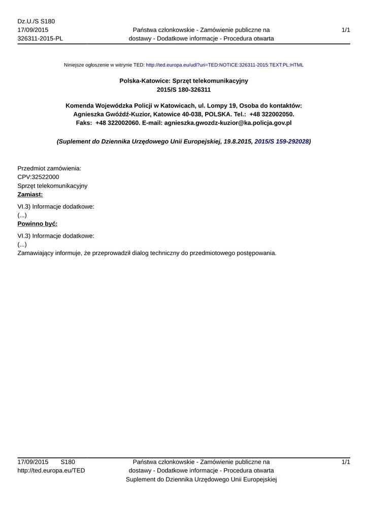 Dz.U./S S180 17/09/2015 326311-2015-PL Państwa członkowskie - Zamówienie publiczne na dostawy - Dodatkowe informacje - Procedura otwarta 1/1 Niniejsze ogłoszenie w witrynie TED: http://ted.europa.eu/udl?uri=TED:NOTICE:326311-2015:TEXT:PL:HTML Polska-Katowice: Sprzęt telekomunikacyjny 2015/S 180-326311 Komenda Wojewódzka Policji w Katowicach, ul. Lompy 19, Osoba do kontaktów: Agnieszka Gwóźdź-Kuzior, Katowice 40-038, POLSKA. Tel.: +48 322002050. Faks: +48 322002060. E-mail: [email protected] (Suplement do Dziennika Urzędowego Unii Europejskiej, 19.8.2015, 2015/S 159-292028) Przedmiot zamówienia: CPV:32522000 Sprzęt telekomunikacyjny Zamiast: VI.3) Informacje dodatkowe: (...) Powinno być: VI.3) Informacje dodatkowe: (...) Zamawiający informuje, że przeprowadził dialog techniczny do przedmiotowego postępowania. 17/09/2015 S180 http://ted.europa.eu/TED Państwa członkowskie - Zamówienie publiczne na dostawy - Dodatkowe informacje - Procedura otwarta Suplement do Dziennika Urzędowego Unii Europejskiej 1/1