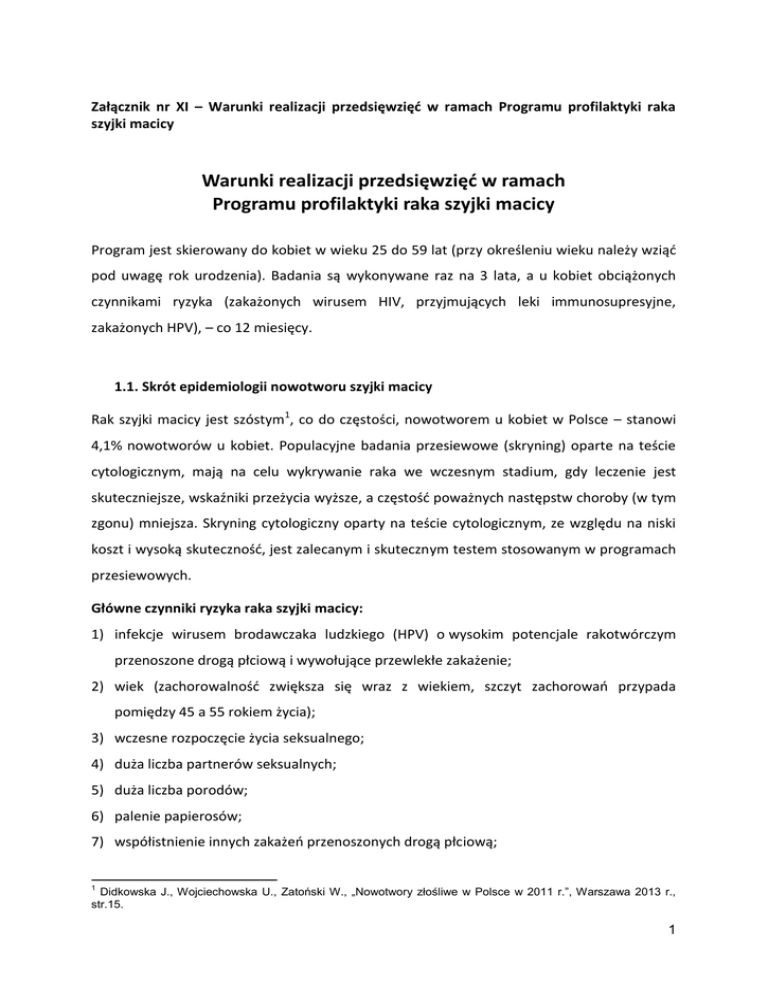 Załącznik nr XI – Warunki realizacji przedsięwzięć w ramach Programu profilaktyki raka szyjki macicy Warunki realizacji przedsięwzięć w ramach Programu profilaktyki raka szyjki macicy Program jest skierowany do kobiet w wieku 25 do 59 lat (przy określeniu wieku należy wziąć pod uwagę rok urodzenia). Badania są wykonywane raz na 3 lata, a u kobiet obciążonych czynnikami ryzyka (zakażonych wirusem HIV, przyjmujących leki immunosupresyjne, zakażonych HPV), – co 12 miesięcy. 1.1. Skrót epidemiologii nowotworu szyjki macicy Rak szyjki macicy jest szóstym1, co do częstości, nowotworem u kobiet w Polsce – stanowi 4,1% nowotworów u kobiet. Populacyjne badania przesiewowe (skryning) oparte na teście cytologicznym, mają na celu wykrywanie raka we wczesnym stadium, gdy leczenie jest skuteczniejsze, wskaźniki przeżycia wyższe, a częstość poważnych następstw choroby (w tym zgonu) mniejsza. Skryning cytologiczny oparty na teście cytologicznym, ze względu na niski koszt i wysoką skuteczność, jest zalecanym i skutecznym testem stosowanym w programach przesiewowych. Główne czynniki ryzyka raka szyjki macicy: 1) infekcje wirusem brodawczaka ludzkiego (HPV) o wysokim potencjale rakotwórczym przenoszone drogą płciową i wywołujące przewlekłe zakażenie; 2) wiek (zachorowalność zwiększa się wraz z wiekiem, szczyt zachorowań przypada pomiędzy 45 a 55 rokiem życia); 3) wczesne rozpoczęcie życia seksualnego; 4) duża liczba partnerów seksualnych; 5) duża liczba porodów; 6) palenie papierosów; 7) współistnienie innych zakażeń przenoszonych drogą płciową; 1 Didkowska J., Wojciechowska U., Zatoński W., „Nowotwory złośliwe w Polsce w 2011 r.”, Warszawa 2013 r., str.15. 1 8) osłabienie odporności (np. infekcja HIV czy leki zmniejszające odporność); 9) niski status społeczny i ekonomiczny; 10) obecność nowotworu szyjki macicy w rodzinie. 1.2. Dotychczasowe działania krajowe podejmowane w ramach Populacyjnego programu wczesnego wykrywania raka szyjki macicy Program jest realizowany w oparciu o ustawę z dnia 1 lipca 2005 r. o ustanowieniu programu wieloletniego „Narodowy program zwalczania chorób nowotworowych". Realizacja Populacyjnego programu wczesnego wykrywania raka szyjki macicy przebiega w oparciu o wzajemną współpracę pomiędzy NFZ zapewniającym dostęp do świadczeń cytologicznych i finansującym je, świadczeniodawcami realizującymi program oraz Ministerstwem Zdrowia finansującym część administracyjno-logistyczną. Ministerstwo Zdrowia refunduje koszty osobowe i zadaniowe stworzonej dla potrzeb programu sieci 16 Wojewódzkich Ośrodków Koordynujących i Centralnego Ośrodka Koordynującego, które monitorują i nadzorują realizację programu, a także realizację wysyłki imiennych zaproszeń do kobiet, prowadzenie akcji medialnych oraz informacyjno-edukacyjnych na rzecz popularyzacji profilaktyki ww. nowotworu oraz kontrole jakości wykonywanych badań cytologicznych. Funkcję Centralnego Ośrodka Koordynującego pełni Centrum Onkologii – Instytut M. Curie - Skłodowskiej w Warszawie. Podobnie jak w przypadku badania mammograficznego, badanie cytologiczne nie jest limitowane przez NFZ. Celem programu jest zmniejszenie wskaźnika umieralności kobiet na raka szyjki macicy do poziomu krajów przodujących, w tym zakresie w Unii Europejskiej, w szczególności poprzez wykrywanie stanów przedrakowych oraz poprzez unikanie czynników ryzyka lub zwiększenie indywidualnej odporności na te czynniki, tj. edukację i kształtowanie zachowań prozdrowotnych. Dotychczasowe doświadczenia z realizacji Populacyjnego programu profilaktyki wczesnego wykrywania raka szyjki macicy wskazały, że niska wykrywalność raka szyjki macicy spowodowana jest małą liczbą kobiet zgłaszających się na badania cytologiczne. 2 Rysunek 2. Objęcie populacji badaniami cytologicznymi w Polsce w 2013 r. Źródło: Centralny Ośrodek Koordynujący 1.3. Warunki przystąpienia świadczeniodawcy do programu 1) posiadanie dostępu do internetu umożliwiającego prowadzenie elektronicznej dokumentacji realizacji projektu w ramach programu; 2) zarejestrowanie świadczeniobiorcy w SIMP nie później niż w dniu badania. 1.3.1. Przebieg procesu diagnostycznego Program profilaktyki raka szyjki macicy składa się z 3 etapów: podstawowego, diagnostycznego oraz pogłębionej diagnostyki. Tryb realizacji świadczenia w trzech etapach jest ambulatoryjny. 1.3.1.1. Etap podstawowy Polega na pobraniu przez lekarza lub położną rozmazu cytologicznego z szyjki macicy. Etap podstawowy obejmuje: 1) zarejestrowanie kobiety w programie SIMP; 3 2) wypełnienie ankiety, 3) pobranie materiału cytologicznego do badania przy użyciu jednorazowego wziernika i szczoteczki umożliwiającej pobranie rozmazu jednocześnie z tarczy części pochwowej oraz z kanału szyjki macicy; 4) edukację w zakresie prewencji nowotworu szyjki macicy; 5) wysłanie pobranego materiału wraz z wypełnioną ankietą do pracowni diagnostycznej; 6) wręczenie przez lekarza pacjentce wyniku badania i decyzji, co do dalszego postępowania; 7) zalecenie ponownego zgłoszenia się na badanie po trzech latach w przypadku prawidłowego wyniku i braku czynników ryzyka; 8) zalecenie wcześniejszego badania cytologicznego (po 12 miesiącach) w ramach programu w uzasadnionych przypadkach, tj. kobietom zakażonym wirusem HIV, przyjmującym leki immunosupresyjne, zakażonym HPV - typem wysokiego ryzyka (16, 18); 9) zalecenie wykonania kontrolnego badania cytologicznego w terminie do kilku miesięcy, gdy u pacjentki nie stwierdzono obecności komórek ze strefy przekształceń czy z endocervix lub gdy wymaz jest nie do oceny z powodu nadmiaru leukocytów (stan zapalny – kontrola po leczeniu), czy też erytrocytów, bądź komórek atroficznych (kontrola po tzw. hormonalnym teście Meigsa). Badanie kontrolne należy wykonać poza programem u świadczeniodawców posiadających umowy z 