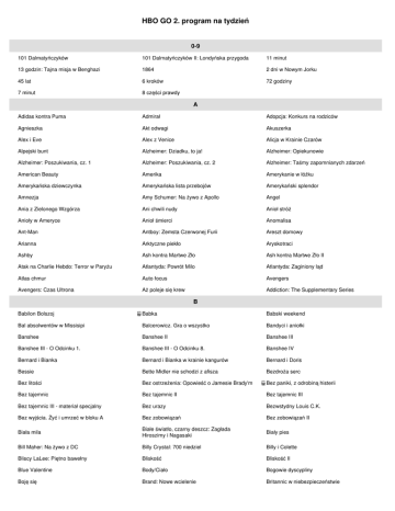 HBO GO 2. program na tydzień 0-9 101 Dalmatyńczyków 101 Dalmatyńczyków II: Londyńska przygoda 11 minut 13 godzin: Tajna misja w Benghazi 1864 2 dni w Nowym Jorku 45 lat 6 kroków 72 godziny 7 minut 8 części prawdy A Adidas kontra Puma Admirał Adopcja: Konkurs na rodziców Agnieszka Akt odwagi Akuszerka Alex i Eve Alex z Venice Alicja w Krainie Czarów Alpejski bunt Alzheimer: Dziadku, to ja! Alzheimer: Opiekunowie Alzheimer: Poszukiwania, cz. 1 Alzheimer: Poszukiwania, cz. 2 Alzheimer: Taśmy zapomnianych zdarzeń American Beauty Amerika Amerykanie w łóżku Amerykańska dziewczynka Amerykańska lista przebojów Amerykański splendor Amnezja Amy Schumer: Na żywo z Apollo Angel Ania z Zielonego Wzgórza Ani chwili nudy Anioł stróż Anioły w Ameryce Anioł śmierci Anomalisa Ant-Man Antboy: Zemsta Czerwonej Furii Areszt domowy Arianna Arktyczne piekło Aryskotraci Ashby Ash kontra Martwe Zło Ash kontra Martwe Zło II Atak na Charlie Hebdo: Terror w Paryżu Atlantyda: Powrót Milo Atlantyda: Zaginiony ląd Atlas chmur Auto focus Avengers Avengers: Czas Ultrona Aż poleje się krew Addiction: The Supplementary Series B Babilon Bolszoj Babka Babski weekend Bal absolwentów w Missisipi Balcerowicz. Gra o wszystko Bandyci i aniołki Banshee Banshee II Banshee III Banshee III - O Odcinku 1. Banshee III - O Odcinku 8. Banshee IV Bernard i Bianka Bernard i Bianka w krainie kangurów Bernard i Doris Bessie Bette Midler nie schodzi z afisza Bezdroża serc Bez litości Bez ostrzeżenia: Opowieść o Jamesie Brady'm Bez paniki, z odrobiną histerii Bez tajemnic Bez tajemnic II Bez tajemnic III Bez tajemnic III - materiał specjalny Bez urazy Bezwstydny Louis C.K. Bez wyjścia. Żyć i umrzeć w bloku A Bez zobowiązań Bez zobowiązań II Biała mila Białe światło, czarny deszcz: Zagłada Hiroszimy i Nagasaki Biały pies Bill Maher: Na żywo z DC Billy Crystal: 700 niedziel Billy i Colette Bliscy LaLee: Piętno bawełny Bliskość Bliskość II Blue Valentine Body/Ciało Bogowie dyscypliny Boję się Brand: Nowe wcielenie Britannic w niebezpieczeństwie Brooklyn Boogie Brudna wojna Bukareszt: Rok smoka Bumerang Bunkier Burza w oddali Byzantium Była sobie dziewczyna Była sobie dziewczynka Było, minęło Bóg to większy Elvis Bóg zemsty Będę w domu na Święta C Cape Cod: Heroinowy przylądek Carandiru Carnivale Carnivale II Carrie Carrie Fisher i Debbie Reynolds prywatnie Carrington Cena honoru Cena pragnień Cena sukcesu Chce się żyć Chemia Cherokee Kid Chicago Chuck Norris kontra komunizm Chwasty Chór Chętni na kasę Chłopaki Chłopiec w pasiastej piżamie Chłopiec ze skazą Cienki Bolek Cień mgły Cinema, mon amour Cinema Verite Ciężkie czasy na Long Island Cloverfield Lane 10 Cmentarz Narodowy w Arlington: Kwatera sześćdziesiąta Co było, a nie jest Control Controra: Dom pełen cieni Cop Land Coś jest nie tak z ciocią Diane Creed: Narodziny legendy Cuda z nieba Cudowny dzień Cudowny świat Cyberszantaż Czarni bracia Czarny tygrys Czasem w kwietniu Czas przemian Czas próby Czekając na sobotę Czekolada Czekoladowe miasto Cześć, Carter Cześć, pajacu Czterdziesty pierwszy Czterej bracia Cztery małe dziewczynki Cztery noce z Anną Czy ktoś widział Andy'ego? Czysta krew Czysta krew II Czysta krew III Czysta krew IV Czysta krew V Czysta krew VI Czysta krew VII Czysta krew VII: blog Jessiki Czysta krew VII: blog Jessiki Czysta krew VII: blog Jessiki Czyste ręce Czytadło Częstotliwość Człowiek ptak Człowiek z bieguna Cathouse Cathouse II. Crashbox D Daisy Miller Daleko za słońcem Dama w vanie Darling I Lowe Ju Darwin i wrogowie ewolucji David McCullough maluje słowami Dawno temu w trawie Debiutanci Decydujący głos Deep Love Demony z Abu Ghraib Denat Detektyw Detektyw II Diabelskie polowanie Diagnoza Dla Nedy Dla waszego dobra Dobra robota: Nowojorscy strażacy Dobry dinozaur Dochodzenie Do końca Dolina Krzemowa Dolina Krzemowa II Dolina Krzemowa III Dom Saddama Dom na końcu ulicy Dom snów Do nieba Dowód Droga ku wojnie Duch salsy Duchy z Enfield, cz. 1 Duchy z Enfield, cz. 2 Dumbo Dumni alfonsi i ich pokorne prostytutki Dwa światy: Historia miłosna Dym Dyrektor naczelny Dziadek i ja Dzieci Boga: zagubione i odnalezione Dzieciaki mojej siostry na tropie złota Dzieci niebios Dziecięcy ogród poezji Dzieciństwo Dziecko diabła Dziecko miłości Dziedzictwo Ferramontich Dziedzictwo grzechu: Historia Williama Coita Dziedziczka egzekucji Dziennik panny służącej Dziewczyna do towarzystwa Dziewczyna w rzece: Cena wybaczenia Dziewczyna z ekstraklasy Dziewczyna z książek Dziewczyna z pistoletem Dziewczyna z plakatu Dziewczyna z szafy Dziewczyny Dziewczyny II Dziewczyny III Dziewczyny IV Dziewczyny V Dziewczyny V - Wizyta Na Planie Dziewczyny V: Elijah Dziewczyny V: Marine Dziewczyny V: Ray Dziewczyny V: Shoshanna Dzień, w którym narodziliśmy się na nowo Dzień kobiet Dzień po Dzień sądu Dzika jak natura Dzikie historie Dziękuję, panie prezydencie: Helen Thomas w Białym Domu Dzwoneczek Dzwoneczek i Zaginiony Skarb Dzwoneczek i sekret magicznych skrzydeł Dzwoneczek i uczynne wróżki Długa noc E Ebola Eden Edukacja Dee Dee Ricks Edukacja Mohammada Husseina Edukacja dla opornych Einstein i Eddington Ekipa Ekipa Ekipa II Ekipa III Ekipa IV Ekipa V Ekipa VI Ekipa VII Ekipa VIII El Diablo Ella zaklęta Emma Emmy 2016: Ceremonia rozdania nagród Empire Falls, cz. 1 Empire Falls, cz. 2 Endorfiny Epitafia Equilibrium Europejskie Nagrody Filmowe 2016 Eurotrip Eva Eva Nová F Fabryka Triangle: Pamięć o pożarze Fabryki śmierci Faceci do wynajęcia Falcone Fanka Fałszywy trop Felix, Net i Nika oraz teoretycznie możliwa katastrofa Ferrell na boisku Figurantka Figurantka Figurantka III Figurantka IV Figurantka V Filmy i gwiazdy Filmy i gwiazdy VIII Flight of the Conchords Flight of the Conchords II Flubber Fort Apache, Bronx Fortuna Frajer Francuska krew Frankenweenie Freddie Roach Freistatt Frida Funny or Die prezentuje Funny or Die pre