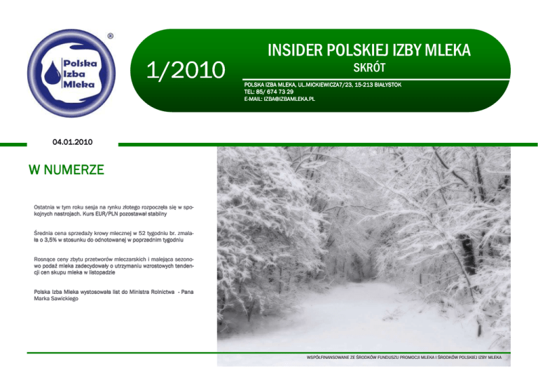 INSIDER POLSKIEJ IZBY MLEKA 1/2010 SKRÓT POLSKA IZBA MLEKA, UL.MICKIEWICZA7/23, 1515-213 BIAŁYSTOK TEL: 85/ 674 73 29 E-MAIL: [email protected] [email protected] 04.01.2010 W NUMERZE Ostatnia w tym roku sesja na rynku złotego rozpoczęła się w spokojnych nastrojach. Kurs EUR/PLN pozostawał stabilny Średnia cena sprzedaży krowy mlecznej w 52 tygodniu br. zmalała o 3,5% w stosunku do odnotowanej w poprzednim tygodniu Rosnące ceny zbytu przetworów mleczarskich i malejąca sezonowo podaż mleka zadecydowały o utrzymaniu wzrostowych tendencji cen skupu mleka w listopadzie Polska Izba Mleka wystosowała list do Ministra Rolnictwa - Pana Marka Sawickiego WSPÓŁFINANSOWANE ZE ŚRODKÓW FUNDUSZU PROMOCJI MLEKA I ŚRODKÓW POLSKIEJ IZBY MLEKA 2 SPIS TREŚCI INFORMACJE MAKROEKONOMICZNE SPIS TREŚCI INFORMACJE MAKROEKONOMICZNE Zmiana kursu walut (NBP) INFORMACJE MAKROEKONOMICZNE 2 str NOTOWANIA CENOWE — RYNEK KRAJOWY 3 str 4,2 NOTOWANIA CENOWE — RYNEK ZAGRANICZNY 4 str 4,1 4,3 4,24 4,24 4,18 4,11 4,0 INFORMACJE Z POLSKI, UE I ZE ŚWIATA 5 str RYNEK KONSUMENCKI 7 str 3,8 AKTUALNOŚCI POLSKIEJ IZBY MLEKA 8 str 3,7 PRAWO 9 str TYDZIEŃ W MEDIACH 10 str 4,18 4,15 4,09 4,14 4,18 4,17 4,11 3,9 3,6 3,5 3,4 EUR USD 3,3 3,2 3,1 3,0 2,9 2,8 2,7 2,86 2,78 2,85 2,76 2,79 2,90 2,81 2,72 2,90 2,81 2,85 Na koniec tygodnia 53-tego (tj. na dzień 31.12.2009) za jedno euro trzeba było zapłacić 4,1082 zł; za jednego US dolara płacono 2,8503 zł. Komentarz do notowań walutowych (waluty.com) Stabilizacja na rynku walutowym pod koniec roku Ostatnia w tym roku sesja na rynku złotego rozpoczęła się w spokojnych nastrojach. Kurs EUR/PLN pozostawał stabilny w okolicach poziomu 4,1250. Nieco więcej zmienności wykazywały natomiast notowania USD/PLN, co było wynikiem dzisiejszych zmian pary EUR/USD. Na przestrzeni tygodnia notowania złotego były bardzo stabilnie, a kurs EUR/PLN nie wychodził www.izbamleka.pl 3 INFORMACJE MAKROEKONOMICZNE NOTOWANIA CENOWE — RYNEK KRAJOWY 3-3,5% rdr (poradnikhandlowca.com za PAP) poza przedział 4,1200 – 4,1600. Niewielka zmienność panowała na praktycznie wszystkich Ceny żywności wzrosną w XII o 3Ceny żywności w grudniu 2009 r. wzrosną o 3-3,5% w porównaniu z analogicznym okresem rynkach walut naszego regionu. roku ubiegłego - wynika z analiz Instytutu Ekonomiki Rolnictwa i Gospodarki Żywnościowej Informacje z rynku zbóż i żywca (Rzeczpospolita) Teraz w hurtowym handlu produktami rolnymi transakcji będzie już niewiele. Ożywienie po No- podaje PAP. Wzrost ich średniego poziomu w 2009 r., w stosunku do 2008 r., może wynieść wym Roku (…). W ostatnich tygodniach szły w górę notowania kukurydzy, jęczmienia, pszenicy ok. 4 proc., tj. nieco powyżej średniorocznej stopy inflacji, szacowanej (w ustawie budżetowej) paszowej. Natomiast stawki za konsumpcyjną się nie zmieniały. na poziomie 3,6 proc. Roczny wskaźnik inflacji (.pl) Według resortu finansów wskaźnik cen towarów i usług konsumpcyjnych w grudniu wzrósł NOTOWANIA CENOWE — RYNEK KRAJOWY o 0,1 proc. wobec poprzedniego miesiąca, zaś roczny wskaźnik inflacji wyniósł 3,6 proc. wobec Cena skupu mleka netto w listopadzie 2009 r. (MRiRW) 3,3 procent w listopadzie. Cena skupu mleka netto wg MRiRW w listopadzie 2009 r. wyniosła 105,25 zł/100 kg W grudniu 2009 ceny poszły lekko w górę (wyborcza.biz) (102,33 zł/100 litrów). Na koniec 2009 roku inflacja wymknęła się z przedziału akceptowanego przez Radę Polityki Średnie ceny na targowiskach w zł/sztukę (ISRIR MRiRW ceny netto u producenta) Pieniężnej - szacuje Ministerstwo Finansów. Według obliczeń resortu wyniosła w grudniu Średnia cena sprzedaży krowy mlecznej w 52 tygodniu br. wyniosła 2.295 zł/szt. Cena jałówki 3,6 proc. Cel inflacyjny RPP to 2,5 proc., ale dopuszcza odchylenie o 1 pkt proc. w górę i w dół. jednorocznej wyniosła 2.350 zł/szt. 2010 rok, czyli powolne ożywienie koniunktury (Rzeczpospolita) Ceny tygodniowe wybranych produktów mleczarskich w zł za 100 kg (ISRIR MRiRW ceny netto Polska gospodarka w tym roku będzie się rozwijać w tempie 2,4 proc. W drugiej połowie roku u producenta) mogą spotkać nas nieprzyjemne niespodzianki. W gospodarce na ubiegłego roku dominowały kiepskie nastroje. W drugiej połowie, a szczególnie pod koniec 2009 r., nastąpiła jednak zdecydowana poprawa. 29 proc. Polaków uważa, że przyjęcie euro będzie korzystne (gazetaprawna.pl za PAP) Przeciwnego zdania jest 37 proc. badanych - wynika z opublikowanego we wtorek sondażu TNS OBOP. Według badania, 27 proc. respondentów ocenia, iż wejście Polski do strefy euro nie będzie ani dobre, ani złe. 7 proc. Polaków nie ma zdania na ten temat. 1440 1408,07 1400 1360 1370,19 1320 1280 1240 1200 1178,97 1160 1160,30 1120 1080 1040 1000 960 920 915,77 880 840 800 760 775,18 720 1421,90 1446,55 1431,90 1397,43 1444,80 1397,66 1444,37 1397,07 1420,46 1431,78 1422,80 1383,67 1352,70 1200,84 1201,33 1198,73 1171,67 1210,80 1189,51 960,47 926,64 785,64 791,83 46 47 48 Masło w blokach 1196,56 957,42 1224,24 1216,16 1205,50 1187,09 972,73 1002,13 1314,82 1233,85 1179,56 1019,47 922,71 791,72 45 1211,38 OMP PMP Ser Edamski 795,12 49 Ser Gouda 805,89 50 Masło konfekcjonowane 788,17 801,49 51 52 2009 tygodnie www.izbamleka.pl 4 NOTOWANIA CENOWE — RYNEK KRAJOWY I ZAGRANICZNY Ceny tygodniowe wybranych produktów mleczarskich w euro za 100 kg (ISRIR MRiRW ceny Krajowe ceny artykułów mleczarskich 1414-20.12.2009 (ARR) netto u producenta) W trzecim tygodniu grudnia br. odnotowano dalszy spadek krajowych cen masła. Według da353 345 337 329 321 313 305 297 289 281 273 265 257 249 344,3 330,5 177 351,4 350,2 339,5 338,7 339,9 293,5 294,7 nych Zintegrowanego Systemu Rolniczej Informacji Rynkowej MRiRW, za masło konfekcjono- 347,4 340,0 340,5 wane średnio w kraju uzyskiwano 14,23 zł/kg. W tym czasie ceny masła w blokach obniżyły się 335,7 321,6 323,2 291,7 288,8 291,2 276,7 297,0 315,2 295,7 292,5