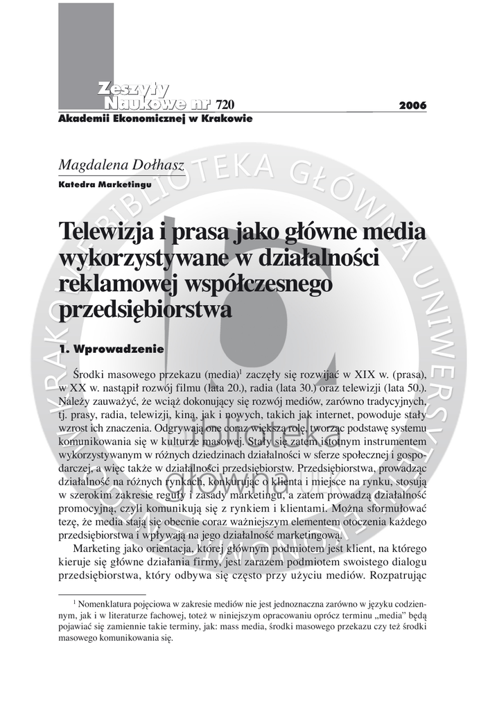 Zeszyty Naukowe nr 720 Akademii Ekonomicznej w Krakowie 2006 Magdalena Dołhasz Katedra Marketingu Telewizja i prasa jako główne media wykorzystywane w działalności reklamowej współczesnego przedsiębiorstwa 1. Wprowadzenie Środki masowego przekazu (media) zaczęły się rozwijać w XIX w. (prasa), w XX w. nastąpił rozwój filmu (lata 20.), radia (lata 30.) oraz telewizji (lata 50.). Należy zauważyć, że wciąż dokonujący się rozwój mediów, zarówno tradycyjnych, tj. prasy, radia, telewizji, kina, jak i nowych, takich jak internet, powoduje stały wzrost ich znaczenia. Odgrywają one coraz większą rolę, tworząc podstawę systemu komunikowania się w kulturze masowej. Stały się zatem istotnym instrumentem wykorzystywanym w różnych dziedzinach działalności w sferze społecznej i gospodarczej, a więc także w działalności przedsiębiorstw. Przedsiębiorstwa, prowadząc działalność na różnych rynkach, konkurując o klienta i miejsce na rynku, stosują w szerokim zakresie reguły i zasady marketingu, a zatem prowadzą działalność promocyjną, czyli komunikują się z rynkiem i klientami. Można sformułować tezę, że media stają się obecnie coraz ważniejszym elementem otoczenia każdego przedsiębiorstwa i wpływają na jego działalność marketingową. Marketing jako orientacja, której głównym podmiotem jest klient, na którego kieruje się główne działania firmy, jest zarazem podmiotem swoistego dialogu przedsiębiorstwa, który odbywa się często przy użyciu mediów. Rozpatrując Nomenklatura pojęciowa w zakresie mediów nie jest jednoznaczna zarówno w języku codziennym, jak i w literaturze fachowej, toteż w niniejszym opracowaniu oprócz terminu „media” będą pojawiać się zamiennie takie terminy, jak: mass media, środki masowego przekazu czy też środki masowego komunikowania się. Magdalena Dołhasz 42 kwestie tworzenia strategii marketingowej firmy, specyfika danego medium będzie wpływać przede wszystkim na wybór konkretnych środków promocji, realizując cele w zakresie komunikacji firmy z rynkiem. Cele te, które są bardzo zróżnicowane, zależą od wielu czynników, zatem i sam dobór mediów nie jest łatwą dziedziną, w obrębie bowiem tego samego medium jest wiele instrumentów oraz cała rzesza zleceniobiorców. Wymaga to od przedsiębiorstwa znajomości specyfiki (zalet i wad) poszczególnych środków przekazu. Należy również podkreślić, że wśród rozmaitych instrumentów promocji, stosowanych przez współczesne firmy, największe znaczenie mają media dla reklamy, która jest obecnie najbardziej popularnym instrumentem wchodzącym w skład promocji-mix. Stanowią one swoisty pomost, przez który przekaz komunikacyjny (reklamowy) jest „przenoszony” do docelowego segmentu rynku, kształtując świadomość istnienia marki, produktu, wywołując potrzeby i chęć ich zaspokojenia, a tym samym realizując cele promocji i cele marketingowe firmy. Omawiając znaczenie mediów w działalności przedsiębiorstw, należy zwrócić również uwagę na związki mediów ze stylem życia odbiorcy i ich wpływem na adresata działań marketingowych, czyli klienta. Każdy klient inaczej reaguje, inne jest jego nastawienie wobec konkretnych mediów. Media przez to wpływają na różne zachowania i postawy odbiorców, każdemu bowiem modelowi społeczno-kulturowemu odpowiadają media, które przekazują mu swoje własne wartości. Cel niniejszego artykułu można zawrzeć w pytaniu, dlaczego współczesne przedsiębiorstwa najczęściej wybierają telewizję i prasę dla celów komunikacji z klientem. Przeprowadzone rozważania mają zatem ukazać specyfikę dwóch głównych, najczęściej wykorzystywanych w reklamie mediów. Wskazanie ich zalet i wad, a także szczegółowa wiedza na temat zmian w ich rozwoju i odbiorze przez adresatów oraz możliwości wykorzystania dla celów reklamy pozwolą przedsiębiorstwom lepiej i efektywniej je wykorzystywać. Wybór telewizji i prasy jako podstawowych mediów wykorzystywanych w reklamie został oparty na analizie rozwoju rynku reklamy w Polsce, a w szczególności na podstawie wydatków na reklamę w poszczególnych mediach. Można postawić tezę, że od początku transformacji polskiej gospodarki obserwuje się również powstanie i szybki rozwój rynku reklamy w Polsce. O ile lata 90. charakteryzowały się dynamicznym wzrostem wydatków na reklamę, gdzie prym wiodła telewizja, o tyle w ostatnich latach wydatki na reklamę w mediach wzrosły tylko nieznacznie. Mówi się wręcz o pewnej stagnacji na rynku reklamy. I tak w 2001 r. wydatki na reklamę wyniosły ok. 9,8 mld zł. W 2002 r. była to kwota niewiele większa, gdyż wynosiła 10,16 mld zł, zatem 2002 r. nie przyniósł znaczących zmian na rynku reklamy. Szacuje się wzrost nakładów na reklamy o ok. 11,3% rocznie. Por. P. Słaby, Polski rynek reklamy, „Impact” 2003, nr 3, s. 7 i nast. Telewizja i prasa jako główne media… 43 W 2003 r. niewiele zmieniło się na rynku reklamy. Największy udział miała nadal telewizja – 63%, na drugim miejscu dzienniki – 15%, dalej magazyny – 13,7%, a radio – 7,3% . Najnowsze dane o rynku reklamy pochodzące z pierwszej połowy 2005 r. wykazują zmniejszenie wydatków na poszczególne media. I tak struktura wydatków reklamowych poszczególnych mediów kształtuje się następująco: telewizja 49,6%, magazyny i dzienniki łącznie 31,4%, outdoor 9,2%, radio 6,4%, internet 2,5% i na końcu kino 0,9%. Jak widać, największy udział w wydatkach na reklamę ma wciąż telewizja i prasa, toteż wiedza na ich temat może przyczynić się do lepszego ich wykorzystania przez przedsiębiorstwa. 2. Telewizja – najpopularniejsze medium reklamowe Spośród mass mediów największą siłę społecznego oddziaływaniana odbiorców ma obecnie telewizja. „To połączenie ruchu, dźwięku i barwy stwarza bardzo duże możliwości wiernego oddania cech produktu