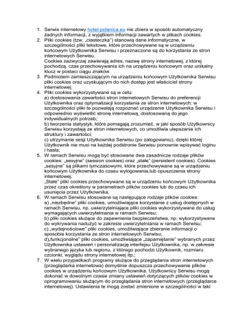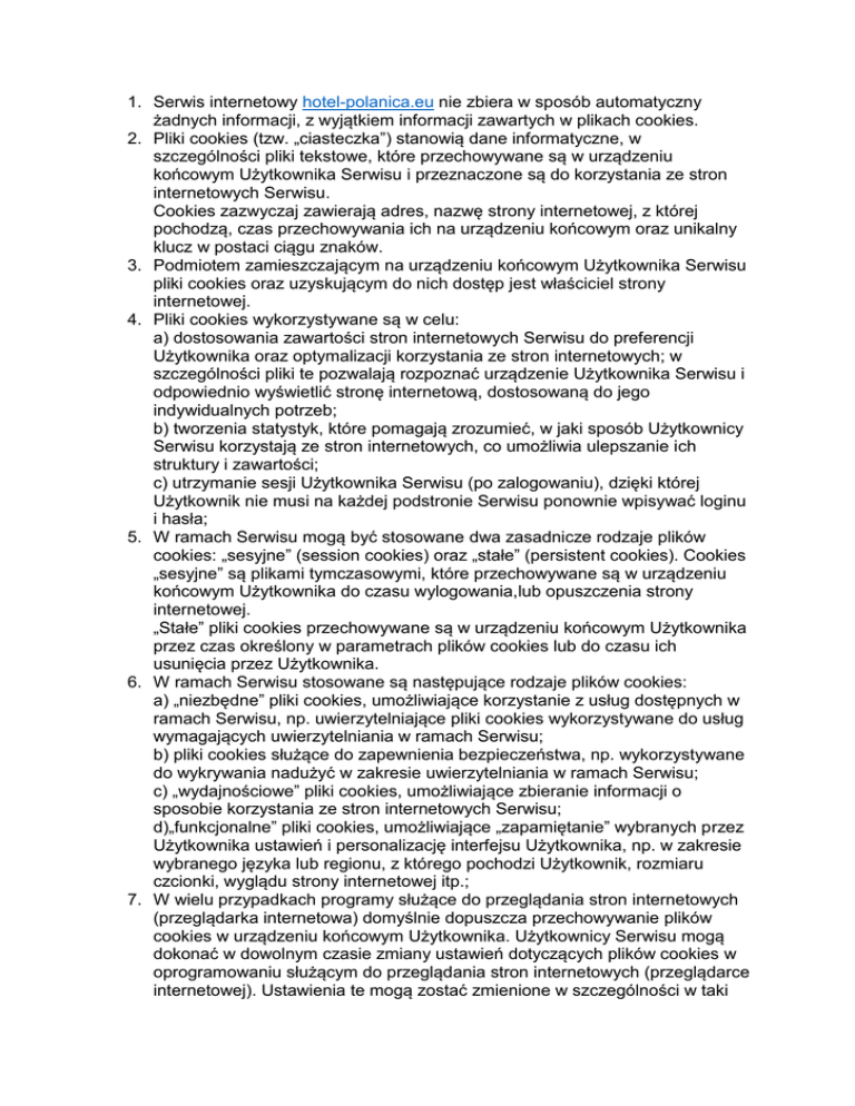 1. Serwis internetowy hotel-polanica.eu nie zbiera w sposób automatyczny żadnych informacji, z wyjątkiem informacji zawartych w plikach cookies. 2. Pliki cookies (tzw. „ciasteczka”) stanowią dane informatyczne, w szczególności pliki tekstowe, które przechowywane są w urządzeniu końcowym Użytkownika Serwisu i przeznaczone są do korzystania ze stron internetowych Serwisu. Cookies zazwyczaj zawierają adres, nazwę strony internetowej, z której pochodzą, czas przechowywania ich na urządzeniu końcowym oraz unikalny klucz w postaci ciągu znaków. 3. Podmiotem zamieszczającym na urządzeniu końcowym Użytkownika Serwisu pliki cookies oraz uzyskującym do nich dostęp jest właściciel strony internetowej. 4. Pliki cookies wykorzystywane są w celu: a) dostosowania zawartości stron internetowych Serwisu do preferencji Użytkownika oraz optymalizacji korzystania ze stron internetowych; w szczególności pliki te pozwalają rozpoznać urządzenie Użytkownika Serwisu i odpowiednio wyświetlić stronę internetową, dostosowaną do jego indywidualnych potrzeb; b) tworzenia statystyk, które pomagają zrozumieć, w jaki sposób Użytkownicy Serwisu korzystają ze stron internetowych, co umożliwia ulepszanie ich struktury i zawartości; c) utrzymanie sesji Użytkownika Serwisu (po zalogowaniu), dzięki której Użytkownik nie musi na każdej podstronie Serwisu ponownie wpisywać loginu i hasła; 5. W ramach Serwisu mogą być stosowane dwa zasadnicze rodzaje plików cookies: „sesyjne” (session cookies) oraz „stałe” (persistent cookies). Cookies „sesyjne” są plikami tymczasowymi, które przechowywane są w urządzeniu końcowym Użytkownika do czasu wylogowania,lub opuszczenia strony internetowej. „Stałe” pliki cookies przechowywane są w urządzeniu końcowym Użytkownika przez czas określony w parametrach plików cookies lub do czasu ich usunięcia przez Użytkownika. 6. W ramach Serwisu stosowane są następujące rodzaje plików cookies: a) „niezbędne” pliki cookies, umożliwiające korzystanie z usług dostępnych w ramach Serwisu, np. uwierzytelniające pliki cookies wykorzystywane do usług wymagających uwierzytelniania w ramach Serwisu; b) pliki cookies służące do zapewnienia bezpieczeństwa, np. wykorzystywane do wykrywania nadużyć w zakresie uwierzytelniania w ramach Serwisu; c) „wydajnościowe” pliki cookies, umożliwiające zbieranie informacji o sposobie korzystania ze stron internetowych Serwisu; d)„funkcjonalne” pliki cookies, umożliwiające „zapamiętanie” wybranych przez Użytkownika ustawień i personalizację interfejsu Użytkownika, np. w zakresie wybranego języka lub regionu, z którego pochodzi Użytkownik, rozmiaru czcionki, wyglądu strony internetowej itp.; 7. W wielu przypadkach programy służące do przeglądania stron internetowych (przeglądarka internetowa) domyślnie dopuszcza przechowywanie plików cookies w urządzeniu końcowym Użytkownika. Użytkownicy Serwisu mogą dokonać w dowolnym czasie zmiany ustawień dotyczących plików cookies w oprogramowaniu służącym do przeglądania stron internetowych (przeglądarce internetowej). Ustawienia te mogą zostać zmienione w szczególności w taki sposób, aby blokować automatyczną obsługę plików cookies w ustawieniach przeglądarki internetowej bądź informować o ich każdorazowym zamieszczeniu w urządzeniu Użytkownika Serwisu. Szczegółowe informacje o możliwości i sposobach obsługi plików cookies dostępne są w ustawieniach oprogramowania (przeglądarki internetowej). 8. Właściciel Serwisu (strony internetowej) informuje, że ograniczenia stosowania plików cookies mogą wpłynąć na działanie niektórych funkcji dostępnych na stronach internetowych Serwisu. 9. Pliki cookies zamieszczane w urządzeniu końcowym Użytkownika Serwisu i wykorzystywane mogą być również przez współpracujących z operatorem Serwisu reklamodawców oraz partnerów. 10. Więcej informacji na temat plików cookies dostępnych jest w sekcji „Pomoc” w menu programu służącego do przeglądania stron internetowych (przeglądarki internetowej). Lub na stronach producenta. To jest wyłącznie Twoja decyzja, czy pliki cookie będą zapisywane na urządzeniu z którego korzystasz i możesz zobaczyć/wykasować je w każdym czasie za pomocą swojej przeglądarki, przykładowo aby zablokować wszystkie cookies należy: Ważna informacja: zablokowanie wszystkich cookies może powodować spowolnienie w ładowaniu stron internetowych.