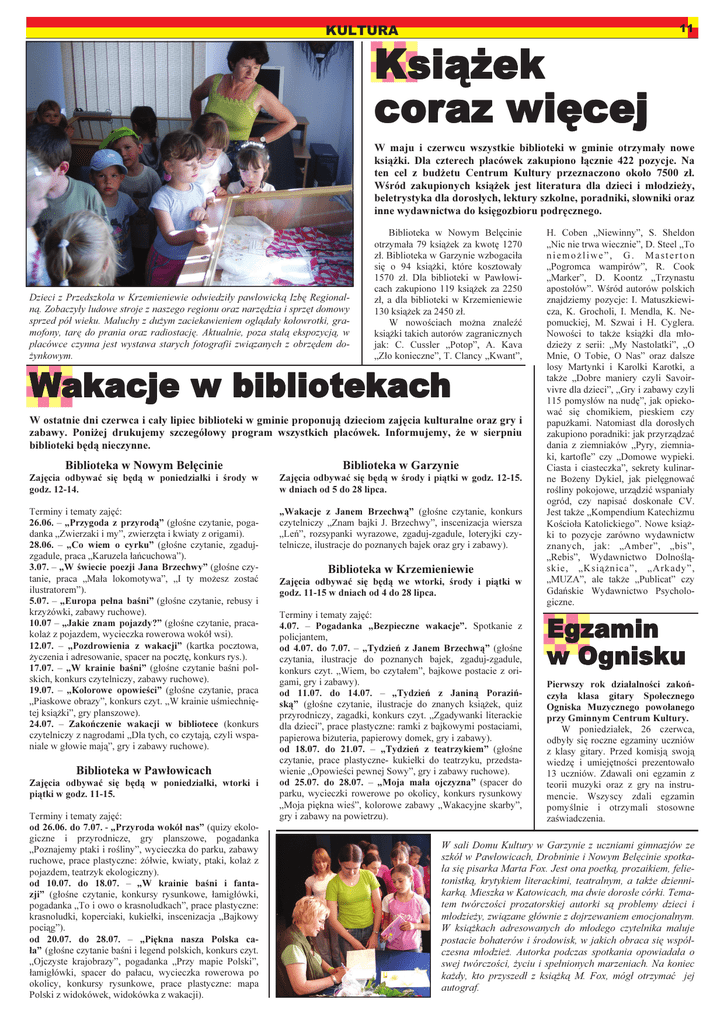 KULTURA Książek coraz więcej 11 11 W maju i czerwcu wszystkie biblioteki w gminie otrzymały nowe książki. Dla czterech placówek zakupiono łącznie 422 pozycje. Na ten cel z budżetu Centrum Kultury przeznaczono około 7500 zł. Wśród zakupionych książek jest literatura dla dzieci i młodzieży, beletrystyka dla dorosłych, lektury szkolne, poradniki, słowniki oraz inne wydawnictwa do księgozbioru podręcznego. Dzieci z Przedszkola w Krzemieniewie odwiedziły pawłowicką Izbę Regionalną. Zobaczyły ludowe stroje z naszego regionu oraz narzędzia i sprzęt domowy sprzed pół wieku. Maluchy z dużym zaciekawieniem oglądały kołowrotki, gramofony, tarę do prania oraz radiostację. Aktualnie, poza stałą ekspozycją, w placówce czynna jest wystawa starych fotografii związanych z obrzędem dożynkowym. Biblioteka w Nowym Belęcinie otrzymała 79 książek za kwotę 1270 zł. Biblioteka w Garzynie wzbogaciła się o 94 książki, które kosztowały 1570 zł. Dla biblioteki w Pawłowicach zakupiono 119 książek za 2250 zł, a dla biblioteki w Krzemieniewie 130 książek za 2450 zł. W nowościach można znaleźć książki takich autorów zagranicznych jak: C. Cussler „Potop”, A. Kava „Zło konieczne”, T. Clancy „Kwant”, Wakacje w bibliotekach W ostatnie dni czerwca i cały lipiec biblioteki w gminie proponują dzieciom zajęcia kulturalne oraz gry i zabawy. Poniżej drukujemy szczegółowy program wszystkich placówek. Informujemy, że w sierpniu biblioteki będą nieczynne. Biblioteka w Nowym Belęcinie Biblioteka w Garzynie Zajęcia odbywać się będą w poniedziałki i środy w godz. 12-14. Zajęcia odbywać się będą w środy i piątki w godz. 12-15. w dniach od 5 do 28 lipca. Terminy i tematy zajęć: 26.06. – „Przygoda z przyrodą” (głośne czytanie, pogadanka „Zwierzaki i my”, zwierzęta i kwiaty z origami). 28.06. – „Co wiem o cyrku” (głośne czytanie, zgadujzgadule, praca „Karuzela łańcuchowa”). 3.07. – „W świecie poezji Jana Brzechwy” (głośne czytanie, praca „Mała lokomotywa”, „I ty możesz zostać ilustratorem”). 5.07. – „Europa pełna baśni” (głośne czytanie, rebusy i krzyżówki, zabawy ruchowe). 10.07 – „Jakie znam pojazdy?” (głośne czytanie, pracakolaż z pojazdem, wycieczka rowerowa wokół wsi). 12.07. – „Pozdrowienia z wakacji” (kartka pocztowa, życzenia i adresowanie, spacer na pocztę, konkurs rys.). 17.07. – „W krainie baśni” (głośne czytanie baśni polskich, konkurs czytelniczy, zabawy ruchowe). 19.07. – „Kolorowe opowieści” (głośne czytanie, praca „Piaskowe obrazy”, konkurs czyt. „W krainie uśmiechniętej książki”, gry planszowe). 24.07. – Zakończenie wakacji w bibliotece (konkurs czytelniczy z nagrodami „Dla tych, co czytają, czyli wspaniale w głowie mają”, gry i zabawy ruchowe). „Wakacje z Janem Brzechwą” (głośne czytanie, konkurs czytelniczy „Znam bajki J. Brzechwy”, inscenizacja wiersza „Leń”, rozsypanki wyrazowe, zgaduj-zgadule, loteryjki czytelnicze, ilustracje do poznanych bajek oraz gry i zabawy). Biblioteka w Pawłowicach Zajęcia odbywać się będą w poniedziałki, wtorki i piątki w godz. 11-15. Terminy i tematy zajęć: od 26.06. do 7.07. - „Przyroda wokół nas” (quizy ekologiczne i przyrodnicze, gry planszowe, pogadanka „Poznajemy ptaki i rośliny”, wycieczka do parku, zabawy ruchowe, prace plastyczne: żółwie, kwiaty, ptaki, kolaż z pojazdem, teatrzyk ekologiczny). od 10.07. do 18.07. – „W krainie baśni i fantazji” (głośne czytanie, konkursy rysunkowe, łamigłówki, pogadanka „To i owo o krasnoludkach”, prace plastyczne: krasnoludki, koperciaki, kukiełki, inscenizacja „Bajkowy pociąg”). od 20.07. do 28.07. – „Piękna nasza Polska cała” (głośne czytanie baśni i legend polskich, konkurs czyt. „Ojczyste krajobrazy”, pogadanka „Przy mapie Polski”, łamigłówki, spacer do pałacu, wycieczka rowerowa po okolicy, konkursy rysunkowe, prace plastyczne: mapa Polski z widokówek, widokówka z wakacji). Biblioteka w Krzemieniewie Zajęcia odbywać się będą we wtorki, środy i piątki w godz. 11-15 w dniach od 4 do 28 lipca. Terminy i tematy zajęć: 4.07. – Pogadanka „Bezpieczne wakacje”. Spotkanie z policjantem, od 4.07. do 7.07. – „Tydzień z Janem Brzechwą” (głośne czytania, ilustracje do poznanych bajek, zgaduj-zgadule, konkurs czyt. „Wiem, bo czytałem”, bajkowe postacie z origami, gry i zabawy). od 11.07. do 14.07. – „Tydzień z Janiną Porazińską” (głośne czytanie, ilustracje do znanych książek, quiz przyrodniczy, zagadki, konkurs czyt. „Zgadywanki literackie dla dzieci”, prace plastyczne: ramki z bajkowymi postaciami, papierowa biżuteria, papierowy domek, gry i zabawy). od 18.07. do 21.07. – „Tydzień z teatrzykiem” (głośne czytanie, prace plastyczne- kukiełki do teatrzyku, przedstawienie „Opowieści pewnej Sowy”, gry i zabawy ruchowe). od 25.07. do 28.07. – „Moja mała ojczyzna” (spacer do parku, wycieczki rowerowe po okolicy, konkurs rysunkowy „Moja piękna wieś”, kolorowe zabawy „Wakacyjne skarby”, gry i zabawy na powietrzu). H. Coben „Niewinny”, S. Sheldon „Nic nie trwa wiecznie”, D. Steel „To niemożliwe”, G. Masterton „Pogromca wampirów”, R. Cook „Marker”, D. Koontz „Trzynastu apostołów”. Wśród autorów polskich znajdziemy pozycje: I. Matuszkiewicza, K. Grocholi, I. Mendla, K. Nepomuckiej, M. Szwai i H. Cyglera. Nowości to także książki dla młodzieży z serii: „My Nastolatki”, „O Mnie, O Tobie, O Nas” oraz dalsze losy Martynki i Karolki Karotki, a także „Dobre maniery czyli Savoirvivre dla dzieci”, „Gry i zabawy czyli 115 pomysłów na nudę”, jak opiekować się chomikiem, pieskiem czy papużkami. Natomiast dla dorosłych zakupiono poradniki: jak przyrządzać dania z ziemniaków „Pyry, ziemniaki, kartofle” czy „Domowe wypi
