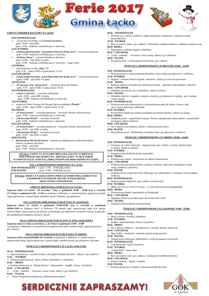 GMINNY OŚRODEK KULTURY W ŁĄCKU 30.01 PONIEDZIAŁEK • „El-quirkat" po polsku, czyli turniej warcabowy godz. 10.00 – sala GOK, godz. 13.00 – budynek wielofunkcyjny w Jazowsku 31.01 WTOREK • „Sztuka majsterkowania, czyli podaruj śmieciom drugie życie” – warsztaty plastyczne godz. 10:00 – budynek wielofunkcyjny w Jazowsku • „Królowa śniegu” – teatrzyk kukiełkowy dla dzieci godz. 10:00 –– sala GOK w Łącku, godz. 12:00 – budynek wielofunkcyjny w Jazowsku – wstęp wolny 1.02 ŚRODA • wyjazd do kina na film „Sing” 3D godz. 9:30 – zapisy GOK w Łącku (koszt: 25 zł) 2.02.CZWARTEK • „Sztuka majsterkowania, czyli podaruj śmieciom drugie życie” – warsztaty plastyczne (godz. 10:00 – sala GOK w Łącku) 3.02 PIĄTEK • „W zdrowym ciele, zdrowy duch” – wyjazd na basen do Chełmca godz. 9:30 – zapisy GOK w Łącku (koszt: 25 zł) 6.02 PONIEDZIAŁEK • „Ukryte w drewnie” – warsztaty rzeźbiarskie godz. 10:00 – sala GOK w Łącku godz. 13:00 – budynek wielofunkcyjny w Jazowsku 7.02 WTOREK • wyjazd do Teatru Nowego do Nowego Sącza na spektakl „Pinokio” godz. 10:00 – zapisy GOK w Łącku (koszt: 25 zł) 8.02 ŚRODA • „W leśnej krainie” – warsztaty plastyczne – tworzenie obrazów akwarelowych godz. 10:00 – budynek wielofunkcyjny w Jazowsku • „Jak powstaje dźwięk” – warsztaty muzyczne godz. 12:00 – budynek wielofunkcyjny w Jazowsku 9.02 CZWARTEK • „W leśnej krainie” – warsztaty plastyczne – tworzenie obrazów akwarelowych godz. 10:00 – sala GOK w Łącku • „Jak powstaje dźwięk” – warsztaty muzyczne godz. 12:00 – sala GOK w Łącku 10.02 PIĄTEK • Karnawałowy Bal Przebierańców – konkurs na najpiękniejszy strój karnawałowy, zabawy i konkursy dla dzieci godz. 10:00 – sala GOK godz. 13:00 – budynek wielofunkcyjny w Jazowsku 06.02 PONIEDZIAŁEK • Warcaby, gry i zabawy stolikowe, zajęcia plastyczno–techniczne: wykonanie masek karnawałowych. 07.02 WTOREK • Baw się razem z nami - gry i zabawy z elementami współzawodnictwa, układanie puzzli na czas. 08.02 ŚRODA • Zapoznanie z techniką origami, kalambury. 09.02 CZWARTEK • „Cuda – cudeńka” – tworzenie z masy solnej, zabawy i gry stolikowe. 10.02 PIĄTEK • Pożegnanie ferii – rozstrzygnięcie konkursów, gry i zabawy. ŚWIETLICA ŚRODOWISKOWA W BRZYNIE (10:00 – 14:00) 30.01 PONIEDZIAŁEK • Prace plastyczne z wykorzystaniem plasteliny i masy solnej, gry planszowe i stolikowe. 31.01 WTOREK • Origami – robienie różnych figurek i obrazków, zabawy na świeżym powietrzu. 01.02 ŚRODA • Robienie makiety z krajobrazem zimowym, karaoke – śpiewanie indywidualne i zbiorowe. 02.02 CZWARTEK • Układanie krzyżówek, gra w kalambury, zabawy ruchowe. 03.02 PIĄTEK • Układanie rebusów i zagadek o tematyce zimowej, gry planszowe, warcaby, gra w pamięć i wiele innych. 06.02 PONIEDZIAŁEK • Wykonywanie prac plastycznych z wykorzystaniem pasty do zębów, świecy i farb, gra w tenisa stołowego i piłkarzyki. 07.02 WTOREK • Wyświetlanie bajek przy pomocy projektora (na dużym ekranie), zabawy na śniegu. 08.02 ŚRODA • Układanie puzzli – mapa Polski, Europy i Świata, odnajdywanie miast, państw i kontynentów na mapach, zabawy ruchowe. 09.02 CZWARTEK • Gry i zabawy oraz konkursy lubiane i wybierane przez dzieci. 10.02 PIĄTEK • Praca plastyczna pt. „Dokarmiamy zwierzęta zimą”, gry planszowe i stolikowe. ŚWIETLICA ŚRODOWISKOWA W OBIDZY (10:00 – 14:00) 30.01 PONIEDZIAŁEK • Cieszymy się z ferii zimowych – organizowanie gier i zabaw w terenie, lepienie figur ze śniegu, zjazdy na sankach. 31.01 WTOREK • Zorganizowanie konkursu kolęd i pastorałek. UWAGA: ZAPISY NA WYJAZDY BĘDĄ OGŁASZANE NA BIEŻĄCO. 01.02 ŚRODA JEŚLI POJAWI SIĘ OFERTA PN. „BON KULTURY” W MCK SOKÓŁ • Wykonywanie masek i kotylionów na zabawę karnawałową. W NOWYM SĄCZU ZOSTANĄ ZORGANIZOWANE DODATKOWE WYJAZDY. 02.02 CZWARTEK • Wykonywanie prac plastycznych o tematyce zimowej: malowanie lub lepienie z masy HALA WIDOWISKOWO-SPORTOWA W ŁĄCKU solnej, modeliny i plasteliny. 30.01 PONIEDZIAŁEK godz. 11:00 – 14:00 piłka nożna 03.02 PIĄTEK 03.02 PIĄTEK godz. 11:00 – 14:00 piłka ręczna • Zorganizowanie rozgrywek tenisa stołowego oraz piłkarzyków w młodszej i starszej grupie wiekowej. UWAGA: DZIECI Z NASZEJ GMINY PODCZAS FERII MOGĄ KORZYSTAĆ 06.02 PONIEDZIAŁEK Z DARMOWYCH STOŁÓW DO GRY W PIŁKARZYKI ORAZ TENISA STOŁOWEGO. • Organizowanie konkursów, gier i zabaw świetlicowych. 07.02 WTOREK • Zbliża się Światowy Dzień Chorego – w czym możemy pomóc (pogadanka). GMINNA BIBLIOTEKA PUBLICZNA W ŁĄCKU 08.02 ŚRODA Zaprasza dzieci we wtorki (31 stycznia, 7 luty) w godzinach 14:00 – 16.00 oraz w czwartki • Wykonywanie laurek i upominków na Walentynki. (2 i 9 luty) w godzinach 9:30 – 11:30 na spotkania w bibliotece, w ramach których organizowane będą 09.02 CZWARTEK zajęcia plastyczne; czytanie bajek; układanie puzzli i klocków, gry planszowe. • Oglądanie filmów przyrodniczych „Zwierzęta leśne zimą”. 10.02 PIĄTEK FILIA GMINNEJ BIBLIOTEKI PUBLICZNEJ W JAZOWSKU • Zorganizowanie konkursu recytatorskiego. Zaprasza dzieci we wtorki w godzinach 14:00-16:00 oraz w czwartki w godzinach 10:00-12:00 na „Bajkowe ferie” w bibliotece. W ramach zajęć organizowane będą m.in. głośne ŚWIETLICA ŚRODOWISKOWA W JAZOWSKU (9:00 – 15:00) czytanie bajek; zajęcia plastyczne (feryjne wymyślanki); gry planszowe; tworzenie własnej; książeczki; 30.01 PONIEDZIAŁEK dla najmłodszych układanie klocków i puzzli. • Quizy o Polsce i Europie, kalambury. 31.01 WTOREK FILIA GMINNEJ BIBLIOTEKI PUBLICZNEJ W WOLI KOSNOWEJ • Scrable, supermatematyk, rebusy, krzyżówki. Zaprasza dzieci w środy i czwartki (1, 2, 8, 9 luty) w godzinach 13:00 – 15:00 01.02 ŚRODA na spotkania w bibliotece, w ramach których organizowane będą: czytanie