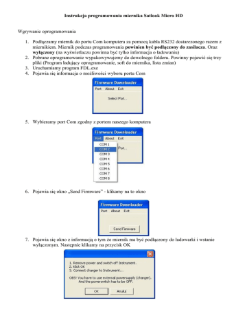 Instrukcja programowania miernika Satlook Micro HD Wgrywanie oprogramowania 1. Podłączamy miernik do portu Com komputera za pomocą kabla RS232 dostarczonego razem z miernikiem. Miernik podczas programowania powinien być podłączony do zasilacza. Oraz wyłączony (na wyświetlaczu powinna być tylko informacja o ładowaniu) 2. Pobrane oprogramowanie wypakowywujemy do dowolnego folderu. Powinny pojawić się trzy pliki (Program ładujący oprogramowanie, soft do miernika, lista zmian) 3. Uruchamiamy program FDL.exe 4. Pojawia się informacja o możliwości wyboru portu Com 5. Wybieramy port Com zgodny z portem naszego komputera 6. Pojawia się okno „Send Firmware” - klikamy na to okno 7. Pojawia się okno z informacją o tym że miernik ma być podłączony do ładowarki i wstanie wyłączonym. Następnie klikamy na przycisk OK 8. Pojawia się okno „Searching”. 9. W mierniku naciskamy przycisk uruchamiania ON, pojawi się okno wyboru oprogramowania. Wskazujemy Soft który chcemy załadować do miernika i klikamy na przycisk Otwórz. 10. Oprogramowanie zaczyna być ładowane do miernika. Czekamy tak długo aż wskaźnik osiągnie 100% 11. Po wgraniu oprogramowania powinien pojawić się komunikat „Download complet. No errors.” Klikamy na OK. Miernik ma załadowane nowe oprogramowanie, możemy go odłączyć od komputera i uruchomić. Wersje oprogramowania w mierniku możemy sprawdzić w jego Menu , w zakładce Ustawienia/ Seting – Wersja/Version Miernik ma domyślnie ustawione Menu w języku angielskim. Menu na język polski możemy zmienić klikając na Setup – Language - Polish opracowanie: Rafał Przybyła 0602762123, 327714776 [email protected] www.satsklep.pl ; www.eltech.net.pl