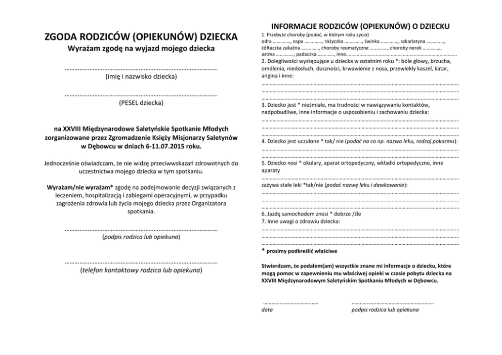 INFORMACJE RODZICÓW (OPIEKUNÓW) O DZIECKU ZGODA RODZICÓW (OPIEKUNÓW) DZIECKA Wyrażam zgodę na wyjazd mojego dziecka ………………………………………………………………………………… (imię i nazwisko dziecka) ………………………………………………………………………………… (PESEL dziecka) na XXVIII Międzynarodowe Saletyńskie Spotkanie Młodych zorganizowane przez Zgromadzenie Księży Misjonarzy Saletynów w Dębowcu w dniach 6-11.07.2015 roku. Jednocześnie oświadczam, że nie widzę przeciwwskazań zdrowotnych do uczestnictwa mojego dziecka w tym spotkaniu. Wyrażam/nie wyrażam* zgodę na podejmowanie decyzji związanych z leczeniem, hospitalizacją i zabiegami operacyjnymi, w przypadku zagrożenia zdrowia lub życia mojego dziecka przez Organizatora spotkania. ………………………………………………………………………………… (podpis rodzica lub opiekuna) ………………………………………………………………………………… (telefon kontaktowy rodzica lub opiekuna) 1. Przebyte choroby (podać, w którym roku życia) odra …..………, ospa ……..……, różyczka …..………, świnka ..…………, szkarlatyna ………..…, żółtaczka zakaźna ……..……, choroby reumatyczne …..………, choroby nerek …..………, astma …..………, padaczka……..……, inne.................................................................................. 2. Dolegliwości występujące u dziecka w ostatnim roku *: bóle głowy, brzucha, omdlenia, niedosłuch, duszności, krwawienie z nosa, przewlekły kaszel, katar, angina i inne: ……………………………………………………………………………………………………………………………… ……………………………………………………………………………………………………………………………… ……………………………………………………………………………………………………………………………… 3. Dziecko jest * nieśmiałe, ma trudności w nawiązywaniu kontaktów, nadpobudliwe, inne informacje o usposobieniu i zachowaniu dziecka: ……………………………………………………………………………………………………………………………… ……………………………………………………………………………………………………………………………… ……………………………………………………………………………………………………………………………… 4. Dziecko jest uczulone * tak/ nie (podać na co np. nazwa leku, rodzaj pokarmu): ……………………………………………………………………………………………………………………………… ……………………………………………………………………………………………………………………………… 5. Dziecko nosi * okulary, aparat ortopedyczny, wkładki ortopedyczne, inne aparaty ……………………………………………………………………………………………………………………………… zażywa stałe leki *tak/nie (podać nazwę leku i dawkowanie): ……………………………………………………………………………………………………………………………… ……………………………………………………………………………………………………………………………… ……………………………………………………………………………………………………………………………… 6. Jazdę samochodem znosi * dobrze /źle 7. Inne uwagi o zdrowiu dziecka: ……………………………………………………………………………………………………………………………… ……………………………………………………………………………………………………………………………… ……………………………………………………………………………………………………………………………… * prosimy podkreślić właściwe Stwierdzam, że podałem(am) wszystkie znane mi informacje o dziecku, które mogą pomoc w zapewnieniu mu właściwej opieki w czasie pobytu dziecka na XXVIII Międzynarodowym Saletyńskim Spotkaniu Młodych w Dębowcu. ….……………….………..…… data …………………………………………………… podpis rodzica lub opiekuna