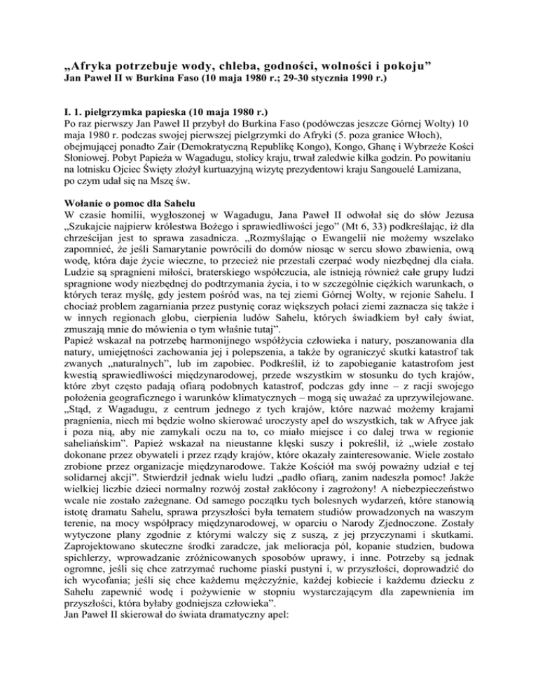 „Afryka potrzebuje wody, chleba, godności, wolności i pokoju” Jan Paweł II w Burkina Faso (10 maja 1980 r.; 29-30 stycznia 1990 r.) I. 1. pielgrzymka papieska (10 maja 1980 r.) Po raz pierwszy Jan Paweł II przybył do Burkina Faso (podówczas jeszcze Górnej Wolty) 10 maja 1980 r. podczas swojej pierwszej pielgrzymki do Afryki (5. poza granice Włoch), obejmującej ponadto Zair (Demokratyczną Republikę Kongo), Kongo, Ghanę i Wybrzeże Kości Słoniowej. Pobyt Papieża w Wagadugu, stolicy kraju, trwał zaledwie kilka godzin. Po powitaniu na lotnisku Ojciec Święty złożył kurtuazyjną wizytę prezydentowi kraju Sangouelé Lamizana, po czym udał się na Mszę św. Wołanie o pomoc dla Sahelu W czasie homilii, wygłoszonej w Wagadugu, Jana Paweł II odwołał się do słów Jezusa „Szukajcie najpierw królestwa Bożego i sprawiedliwości jego” (Mt 6, 33) podkreślając, iż dla chrześcijan jest to sprawa zasadnicza. „Rozmyślając o Ewangelii nie możemy wszelako zapomnieć, że jeśli Samarytanie powrócili do domów niosąc w sercu słowo zbawienia, ową wodę, która daje życie wieczne, to przecież nie przestali czerpać wody niezbędnej dla ciała. Ludzie są spragnieni miłości, braterskiego współczucia, ale istnieją również całe grupy ludzi spragnione wody niezbędnej do podtrzymania życia, i to w szczególnie ciężkich warunkach, o których teraz myślę, gdy jestem pośród was, na tej ziemi Górnej Wolty, w rejonie Sahelu. I chociaż problem zagarniania przez pustynię coraz większych połaci ziemi zaznacza się także i w innych regionach globu, cierpienia ludów Sahelu, których świadkiem był cały świat, zmuszają mnie do mówienia o tym właśnie tutaj”. Papież wskazał na potrzebę harmonijnego współżycia człowieka i natury, poszanowania dla natury, umiejętności zachowania jej i polepszenia, a także by ograniczyć skutki katastrof tak zwanych „naturalnych”, lub im zapobiec. Podkreślił, iż to zapobieganie katastrofom jest kwestią sprawiedliwości międzynarodowej, przede wszystkim w stosunku do tych krajów, które zbyt często padają ofiarą podobnych katastrof, podczas gdy inne – z racji swojego położenia geograficznego i warunków klimatycznych – mogą się uważać za uprzywilejowane. „Stąd, z Wagadugu, z centrum jednego z tych krajów, które nazwać możemy krajami pragnienia, niech mi będzie wolno skierować uroczysty apel do wszystkich, tak w Afryce jak i poza nią, aby nie zamykali oczu na to, co miało miejsce i co dalej trwa w regionie saheliańskim”. Papież wskazał na nieustanne klęski suszy i pokreślił, iż „wiele zostało dokonane przez obywateli i przez rządy krajów, które okazały zainteresowanie. Wiele zostało zrobione przez organizacje międzynarodowe. Także Kościół ma swój poważny udział e tej solidarnej akcji”. Stwierdził jednak wielu ludzi „padło ofiarą, zanim nadeszła pomoc! Jakże wielkiej liczbie dzieci normalny rozwój został zakłócony i zagrożony! A niebezpieczeństwo wcale nie zostało zażegnane. Od samego początku tych bolesnych wydarzeń, które stanowią istotę dramatu Sahelu, sprawa przyszłości była tematem studiów prowadzonych na waszym terenie, na mocy współpracy międzynarodowej, w oparciu o Narody Zjednoczone. Zostały wytyczone plany zgodnie z którymi walczy się z suszą, z jej przyczynami i skutkami. Zaprojektowano skuteczne środki zaradcze, jak melioracja pól, kopanie studzien, budowa spichlerzy, wprowadzanie zróżnicowanych sposobów uprawy, i inne. Potrzeby są jednak ogromne, jeśli się chce zatrzymać ruchome piaski pustyni i, w przyszłości, doprowadzić do ich wycofania; jeśli się chce każdemu mężczyźnie, każdej kobiecie i każdemu dziecku z Sahelu zapewnić wodę i pożywienie w stopniu wystarczającym dla zapewnienia im przyszłości, która byłaby godniejsza człowieka”. Jan Paweł II skierował do świata dramatyczny apel: „Oto dlaczego z tego miejsca, z tej stolicy Górnej Wolty, zwracam się do całego świata z uroczystym apelem. Ja, Jan Paweł II, Biskup Rzymu i Następca św. Piotra, wznoszę swój błagalny głos, nie mogę bowiem milczeć, gdy moi bracia i siostry są w niebezpieczeństwie. Mówię tu w imieniu tych, którzy nie mogą się odezwać: w imieniu ludzi, którzy ponieśli niewinną śmierć z powodu braku wody i chleba: w imieniu ojców i matek, którzy – nie mogąc tego pojąć – patrzyli na śmierć swoich dzieci, i w imieniu tych, którzy do końca będą oglądać w swoich dzieciach skutki głodu: mówię w imieniu przyszłych pokoleń, które nie powinny żyć z tą straszliwą groźbą wiszącą nad ich egzystencją. Kieruję ten apel do wszystkich! Nie czekajmy, aż wróci susza, straszliwa i niszczycielska! Nie czekajmy aż piaski sprowadzą znowu śmierć! Nie pozwólmy, aby przyszłość tych ludów była wiecznie zagrożona. Wczorajsza solidarność, która miała taj szeroki zasięg i okazała się tak skuteczną, jest dowodem, iż nie należy słuchać głosu egoizmu indywidualnego czy grupowego, ale że trzeba iść za głosem sprawiedliwości i miłości. Usłyszcie mój apel! Was, członków międzynarodowych organizacji, proszę, abyście przyspieszyli wprowadzenie w życie już opracowanych programów zapobiegawczych. Was, którzy jesteście odpowiedzialni za losy państw, proszę, abyście udzielili szczodrej pomocy krajom Sahelu, co pozwoli nowym, znacznym i wytrwałym wysiłkom skutecznie położyć kres dramatowi suszy. Was, członków organizacji pozarządowych, proszę, podwójcie wasze wysiłki; sprawcie, aby szlachetny odruch pomocy poruszył poszczególne jednostki – mężczyzn, kobiety i dzieci, tak aby pojęli, że ich wyrzeczenia mogą naprawdę zapewnić przyszłość ich braciom i siostrom. Zwracam się do was, naukowcy i technicy, zwracam się do instytutów badań naukowych; skierujcie wasze wysiłki na znalezienie nowych metod walki z pustynią. Cz