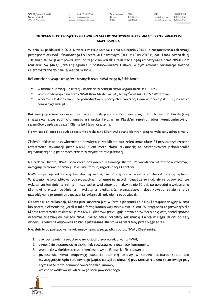 NWAI Dom Maklerski Nowy Świat 64 00-357 Warszawa tel: +48 22 2019750 web: www.nwai.pl email: [email protected] NewConnect: Regon: NIP: NWA 141338474 5252423576 KRS: Kapitał akcyjny: Kapitał wpłacony: 0000304374 1.851.500 zł 1.851.500 zł INFORMACJE DOTYCZĄCE TRYBU WNOSZENIA I ROZPATRYWANIA REKLAMACJI PRZEZ NWAI DOM MAKLERSKI S.A. W dniu 11 października 2015 r. weszła w życie ustawa z dnia 5 sierpnia 2015 r. o rozpatrywaniu reklamacji przez podmioty rynku finansowego i o Rzeczniku Finansowym (Dz.U. z 10.09.2015 r., poz. 1348), zwana dalej „Ustawą”. W związku z powyższym, od tego dnia wszelkie reklamacje będą rozpatrywane przez NWAI Dom Maklerski SA (dalej: „NWAI”) zgodnie z postanowieniami Ustawy, w tym również reklamacje złożone i nierozpatrzone do dnia jej wejścia w życie. Reklamacje dotyczące usług świadczonych przez NWAI mogą być składane: w formie pisemnej lub ustnej - osobiście w centrali NWAI w godzinach 9:00 - 17:30 korespondencyjnie na adres NWAI Dom Maklerski S.A., Nowy Świat 64, 00-357 Warszawa w formie elektronicznej – za pośrednictwem poczty elektronicznej (skan w formie pliku PDF) na adres [email protected] Reklamacja powinna zawierać informacje pozwalające w sposób niewątpliwy ustalić tożsamość Klienta (imię i nazwisko/nazwę podmiotu innego niż osoba fizyczna, nr PESEL/nr rejestru, adres korespondencyjny), szczegółowy opis zastrzeżeń Klienta jak i jego roszczenie. Na wniosek Klienta odpowiedz zostanie przekazana Klientowi pocztą elektroniczną na wskazany adres e-mail. Złożenie reklamacji niezwłocznie po powzięciu przez Klienta zastrzeżeń może ułatwić i przyśpieszyć rzetelne rozpatrzenie reklamacji przez NWAI. Klient może złożyć reklamację za pośrednictwem pełnomocnika legitymującego się pełnomocnictwem w zwykłej formie pisemnej. Na żądanie Klienta, NWAI potwierdza otrzymanie reklamacji Klienta. Potwierdzenie otrzymania reklamacji następuje w formie pisemnej lub w innej formie, uzgodnionej z Klientem. NWAI rozpatruje reklamację bez zbędnej zwłoki, nie później niż w terminie 30 dni od daty jej wpływu. W szczególnie skomplikowanych przypadkach, uniemożliwiających rozpatrzenie i udzielenie odpowiedzi we wskazanym terminie, termin ten może zostać wydłużony do maksymalnie 60 dni, po uprzednim wyjaśnieniu Klientowi przyczyn opóźnienia i wskazania okoliczności wymagających dodatkowego ustalenia oraz przewidywanego terminu rozpatrzenia reklamacji i udzielenia odpowiedzi. Odpowiedź na reklamację Klienta przekazywana jest w formie pisemnej na adres korespondencyjny Klienta lub pocztą elektroniczną, jeżeli o taką formę komunikacji wnioskował Klient. W przypadku negatywnego dla Klienta rozpatrzenia reklamacji przez NWAI Klientowi przysługuje prawo do zwrócenia się w tej samej sprawie w formie pisemnej do Zarządu NWAI. Zarząd NWAI rozpatrzy reklamację Klienta w ciągu 30 dni od daty wpływu, a pisemna odpowiedź zostanie przekazana Klientowi na wskazany przez niego adres. Niezależnie od postępowania reklamacyjnego, w przypadku sporu z NWAI, Klient może: 1. 2. 3. 4. 5. zawrzeć ugodę na podstawie negocjacji przeprowadzonych z NWAI, zwrócić się o pomoc do miejskich lub powiatowych rzeczników konsumenta; wystąpić z wnioskiem o rozpatrzenie sprawy do Rzecznika Finansowego, przedstawić NWAI propozycję zawarcia pisemnej umowy w sprawie poddania sporu pod rozstrzygnięcie Sądu Polubownego (zapisu na sąd polubowny) przy Komisji Nadzoru Finansowego przy czym NWAI może odmówić zawarcia takiej umowy, wnieść powództwo do właściwego sądu powszechnego. 1