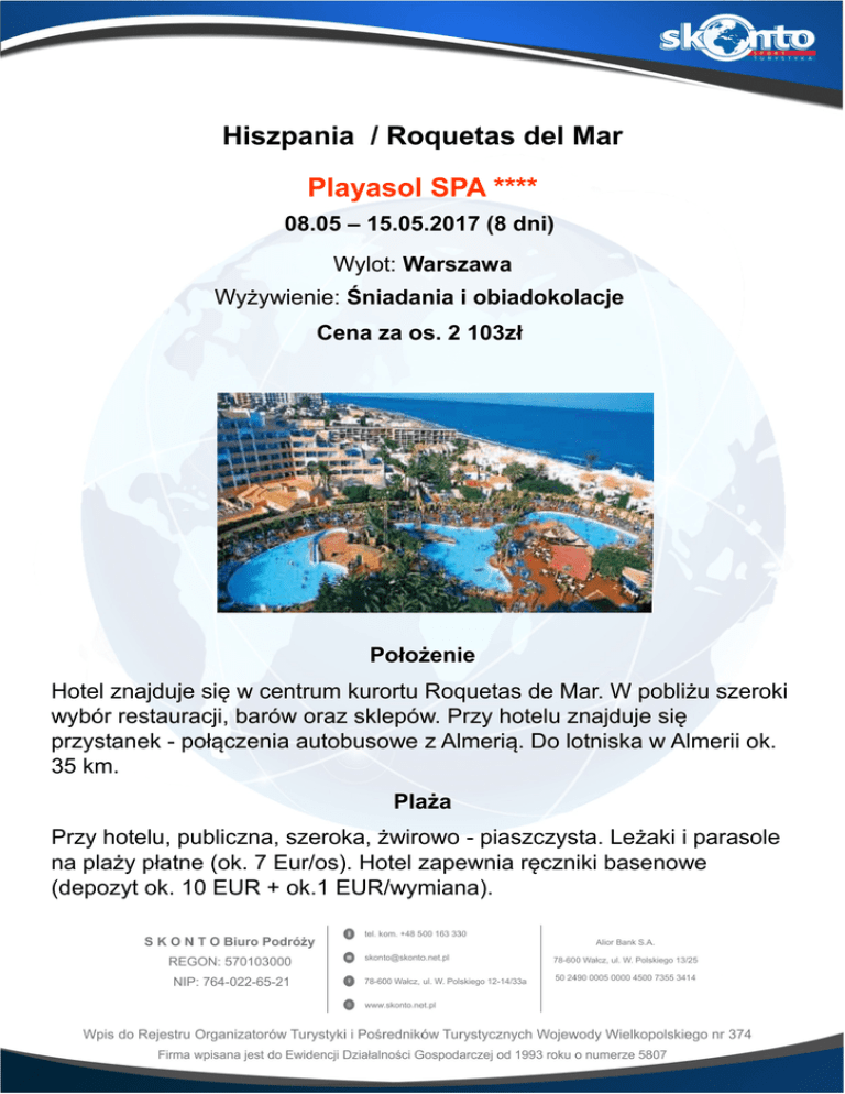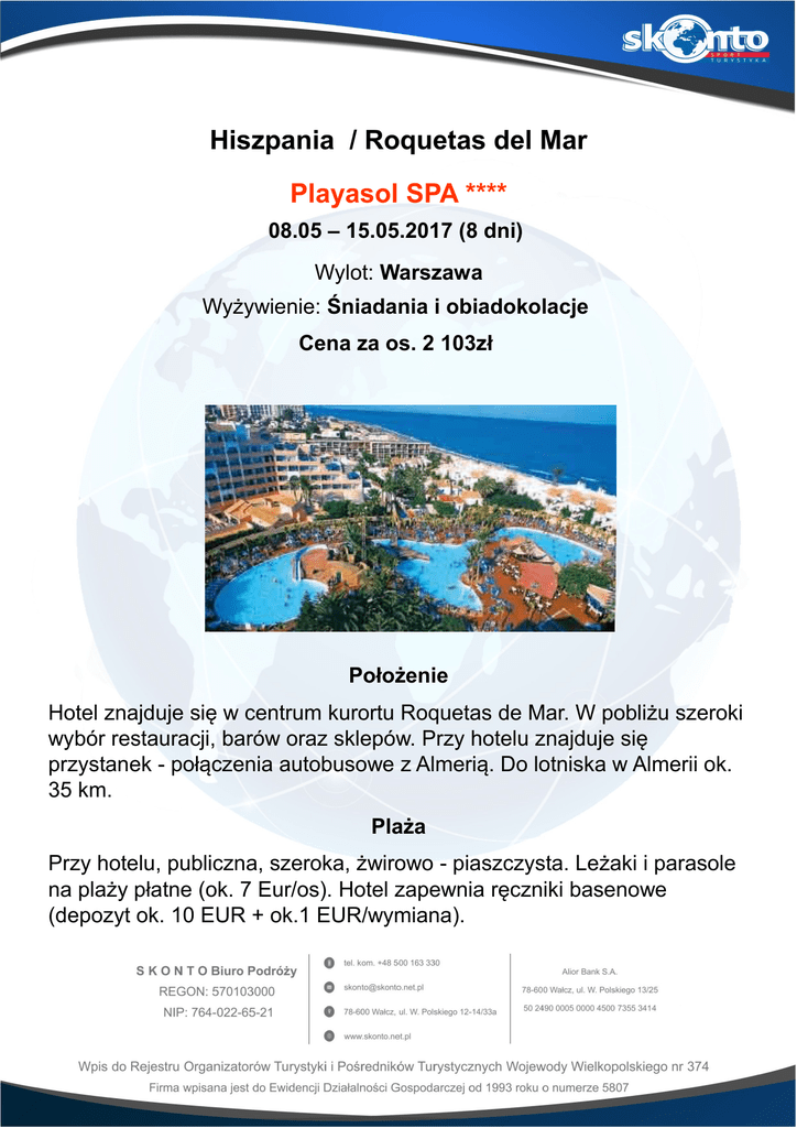 Hiszpania / Roquetas del Mar Playasol SPA **** 08.05 – 15.05.2017 (8 dni) Wylot: Warszawa Wyżywienie: Śniadania i obiadokolacje Cena za os. 2 103zł Położenie Hotel znajduje się w centrum kurortu Roquetas de Mar. W pobliżu szeroki wybór restauracji, barów oraz sklepów. Przy hotelu znajduje się przystanek - połączenia autobusowe z Almerią. Do lotniska w Almerii ok. 35 km. Plaża Przy hotelu, publiczna, szeroka, żwirowo - piaszczysta. Leżaki i parasole na plaży płatne (ok. 7 Eur/os). Hotel zapewnia ręczniki basenowe (depozyt ok. 10 EUR + ok.1 EUR/wymiana). Do dyspozycji gości Recepcja, lobby, windy, restauracja, bary, snack bar przy basenie (lipiec sierpień), ogród z tarasami słonecznymi,leżakami i parasolami, duży basen (pow. ok. 800 m2) ze zjeżdżalnią i z jacuzzi, brodzik dla dzieci (w basenach słodka woda), wybudowana w 2016 roku strefa wodna ze zjeżdżalniami, plac zabaw, mini klub, wypożyczalnia samochodów, parking (płatny), sklep z pamiątkami. Pokoje Hotel posiada 313 rozlokowanych w 7 piętrowym budynku. Wszystkie klimatyzowane, wygodne, z łazienką (suszarka do włosów), telefonem, TV-sat, minibarem (płatny), sejfem (płatny ok. 22 Eur/tydzień + depozyt), balkonem lub tarasem (meble balkonowe). W każdym pokoju najczęściej 2 łóżka (ok. 1,05 m x 2 m) i rozkładany fotel (ok. 1,8 m x 0,9 m). Łóżeczko dla dziecka do 2 lat gratis (ilość ograniczona), przy czym konfiguracja 2 osób dorosłych + 1 dziecko + infant nie jest możliwa. Hotel posiada kilka pokoi dla osób niepełnosprawnych - dostępność na potwierdzenie. Pokoje standardowe (ok.18 m2) - dla max 3 (tylko w układzie 2+1). Wyżywienie Śniadania i obiadokolacje w formie bogatego bufetu. Istnieje możliwość dopłaty do All Inclusive: śniadania, obiady i kolacje w formie bufetu, lokalne wino, piwo oraz woda do posiłków. Lokalne napoje alkoholowe i bezalkoholowe wg karty All Inclusive w barach (informacja o godz. otwarcia poszczególnych barów na miejscu), napoje (08:00-24:00), przekąski (w godz. wyznaczonych przez hotel). Program sportowy i animacyjny Bezpłatne: ping pong, petanka, gry planszowe, mini golf (konieczny depozyt za sprzęt). Płatne: bilard, paddle i tenis ziemny (korty w okolicy). Hotel zapewnia bogaty program animacyjny dla dzieci i dorosłych. W hotelu znajduje się strefa wellness i SPA (płatna). Internet Wi-Fi w recepcji gratis (30 min./dziennie), Wi-Fi w pokojach dodatkowo płatne (ok. 6 Eur/dzień, ok. 20 Eur/tydzień).
