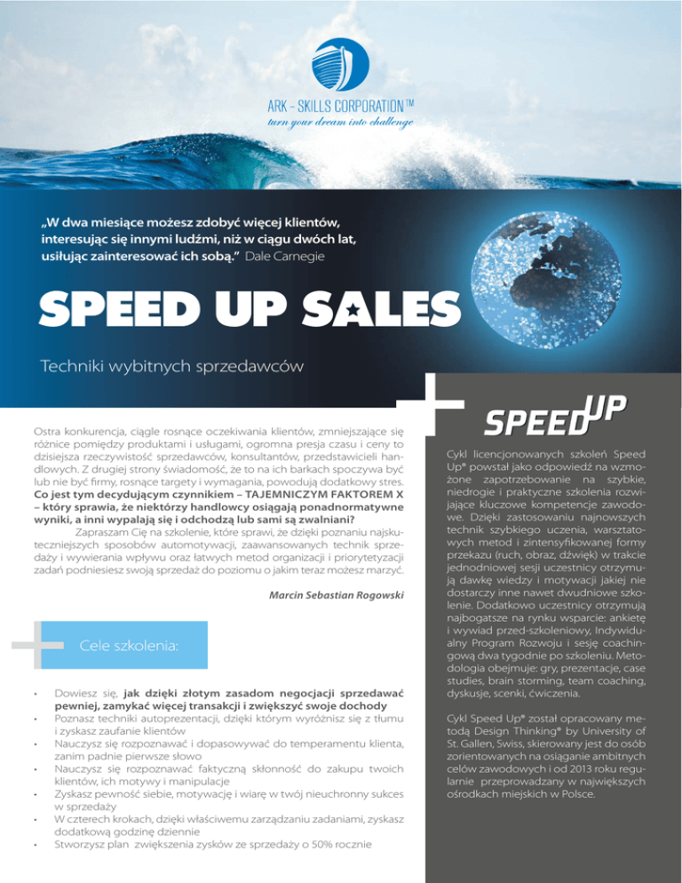 „W dwa miesiące możesz zdobyć więcej klientów, interesując się innymi ludźmi, niż w ciągu dwóch lat, usiłując zainteresować ich sobą.” Dale Carnegie SPEED UP SALES Techniki wybitnych sprzedawców Ostra konkurencja, ciągle rosnące oczekiwania klientów, zmniejszające się różnice pomiędzy produktami i usługami, ogromna presja czasu i ceny to dzisiejsza rzeczywistość sprzedawców, konsultantów, przedstawicieli handlowych. Z drugiej strony świadomość, że to na ich barkach spoczywa być lub nie być firmy, rosnące targety i wymagania, powodują dodatkowy stres. Co jest tym decydującym czynnikiem – TAJEMNICZYM FAKTOREM X – który sprawia, że niektórzy handlowcy osiągają ponadnormatywne wyniki, a inni wypalają się i odchodzą lub sami są zwalniani? Zapraszam Cię na szkolenie, które sprawi, że dzięki poznaniu najskuteczniejszych sposobów automotywacji, zaawansowanych technik sprzedaży i wywierania wpływu oraz łatwych metod organizacji i priorytetyzacji zadań podniesiesz swoją sprzedaż do poziomu o jakim teraz możesz marzyć. Marcin Sebastian Rogowski Cele szkolenia: t t t t t t t Dowiesz się, jak dzięki złotym zasadom negocjacji sprzedawać pewniej, zamykać więcej transakcji i zwiększyć swoje dochody Poznasz techniki autoprezentacji, dzięki którym wyróżnisz się z tłumu i zyskasz zaufanie klientów Nauczysz się rozpoznawać i dopasowywać do temperamentu klienta, zanim padnie pierwsze słowo Nauczysz się rozpoznawać faktyczną skłonność do zakupu twoich klientów, ich motywy i manipulacje Zyskasz pewność siebie, motywację i wiarę w twój nieuchronny sukces w sprzedaży W czterech krokach, dzięki właściwemu zarządzaniu zadaniami, zyskasz dodatkową godzinę dziennie Stworzysz plan zwiększenia zysków ze sprzedaży o 50% rocznie Cykl licencjonowanych szkoleń Speed Up® powstał jako odpowiedź na wzmożone zapotrzebowanie na szybkie, niedrogie i praktyczne szkolenia rozwijające kluczowe kompetencje zawodowe. Dzięki zastosowaniu najnowszych technik szybkiego uczenia, warsztatowych metod i zintensyfikowanej formy przekazu (ruch, obraz, dźwięk) w trakcie jednodniowej sesji uczestnicy otrzymują dawkę wiedzy i motywacji jakiej nie dostarczy inne nawet dwudniowe szkolenie. Dodatkowo uczestnicy otrzymują najbogatsze na rynku wsparcie: ankietę i wywiad przed-szkoleniowy, Indywidualny Program Rozwoju i sesję coachingową dwa tygodnie po szkoleniu. Metodologia obejmuje: gry, prezentacje, case studies, brain storming, team coaching, dyskusje, scenki, ćwiczenia. Cykl Speed Up® został opracowany metodą Design Thinking® by University of St. Gallen, Swiss, skierowany jest do osób zorientowanych na osiąganie ambitnych celów zawodowych i od 2013 roku regularnie przeprowadzany w największych ośrodkach miejskich w Polsce. Korzyści dla organizacji: t t Wysoki ROI na skutek zwiększenia sprzedaży dzięki lepszym umiejętnościom i organizacji pracy handlowców Wzrost motywacji, wytrzymałości i pozytywnego nastawienia sprzedawców przełoży się wprost na lepsze wyniki t t Wzrost liczby stałych i zadowolonych klientów dzięki wzrostowi kompetencji interpersonalnych handlowców Ograniczenie kosztów wynikających z wypalenia, absencji i fluktuacji w obrębie działu sprzedaży Program szkolenia: Godzina Moduł Ćwiczenia 9.00- 9.30 Faktor X – właściwa postawa, nastawienie, automotywacja Scenki pokazowe, test postawy, ćwiczenie „Sąd” 9:30-10:00 Prospecting i 1 Ćwiczenie „Infobroker” kontakt osobisty, telefoniczny i mailowy 10:00-11:00 Psychologia kontaktu i badanie potrzeb Ćwiczenie i scenki „Metaprogramy”, praca w trójkach: „Słuchanie kontekstowe” 11:00- 11:30 Prezentowanie Ćwiczenie „Kaz efektem WOW nał percepcji, a język korzyści” 11:30-13:00 Mechanizmy wpływu w negocjacjach 13:00-13:30 Przerwa obiadowa 13:30 -14:00 Techniki zamy- Coaching Brainkania sprzedaży storm, prezentacja 14:00-15:00 Metody wzmacniania relacji Case study problemowe „Dubaj” Techniki zarządzania czasem Prezentacja, dyskusja moderowana 15:00-15:30 15:30-16:00 Podsumowanie i planowanie rozwoju Prezentacja, Gra „OPEC” Coaching grupowy – „Moje cele” Całkowity czas trwania szkolenia 9.00-16.00 „Jeżeli nie potrafisz dobrze się sprzedać, nie sprzedasz dobrze niczego” szkolenie poprowadzi Marcin Sebastian Rogowski Coach, trener, mówca motywacyjny Ukończył prestiżowy The Art And Science of Coaching Erickson College Vancouver oraz Szkołę Trenerów Wszechnicy Uniwersytetu Jagiellońskiego. Doświadczenie w sprzedaży zdobywał już jako 20-latek w korporacjach zachodnich. Następnie jako przedsiębiorca prowadził działalność na rynkach międzynarodowych zdobywając wiele nagród, między innymi Gazele Biznesu w 2006 roku. Obecnie dyrektor zarządzający i trener programowy Ark Skills Corporation. Jego pasją jest coaching prowokatywny i działania motywacyjne skierowane do działów sprzedaży. 68% Dobre relacje z Klientami „uodparniają” ich na oferty konkurencji, prowadzą do odnawialnej sprzedaży, a przez to są czynnikiem stabilizującym w okresie zmiennej koniunktury. „Obojętność ze strony firmy dostawcy jest przyczyną 68% odejść Klientów.” źródło: AchieveGlobal.pl 70% 70% naszych decyzji zakupowych podejmujemy w oparciu o to, jak jesteśmy traktowani jako ludzie, a tylko 30% bazuje na właściwościach produktu. źródło: John McKean Zaufali nam: Program SPEED UP: Szkolenia SPEED UP z coachingowym programem Assistance Hr® to efekty do 30% lepsze od tradycyjnych szkoleń! To, co odróżnia szkolenia SPEED UP od innych szkoleń otwartych, to wydłużenie okresu motywacji uczestnika oraz większy wzrost i stabilność rozwijanych kompetencji. W tradycyjnych szkoleniach motywacja uczestnika jest wysoka jedynie w momencie podejmowania decyzji o uczestnictwie oraz w trakcie i chwilę po szkoleniu. Już dwa dni po szkoleniu następuje spadek motywacji, który