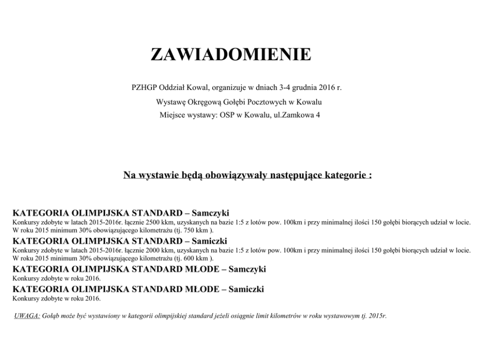 ZAWIADOMIENIE PZHGP Oddział Kowal, organizuje w dniach 3-4 grudnia 2016 r. Wystawę Okręgową Gołębi Pocztowych w Kowalu Miejsce wystawy: OSP w Kowalu, ul.Zamkowa 4 Na wystawie będą obowiązywały następujące kategorie : KATEGORIA OLIMPIJSKA STANDARD – Samczyki Konkursy zdobyte w latach 2015-2016r. łącznie 2500 kkm, uzyskanych na bazie 1:5 z lotów pow. 100km i przy minimalnej ilości 150 gołębi biorących udział w locie. W roku 2015 minimum 30% obowiązującego kilometrażu (tj. 750 kkm ). KATEGORIA OLIMPIJSKA STANDARD – Samiczki Konkursy zdobyte w latach 2015-2016r. łącznie 2000 kkm, uzyskanych na bazie 1:5 z lotów pow. 100km i przy minimalnej ilości 150 gołębi biorących udział w locie. W roku 2015 minimum 30% obowiązującego kilometrażu (tj. 600 kkm ). KATEGORIA OLIMPIJSKA STANDARD MŁODE – Samczyki Konkursy zdobyte w roku 2016. KATEGORIA OLIMPIJSKA STANDARD MŁODE – Samiczki Konkursy zdobyte w roku 2016. UWAGA: Gołąb może być wystawiony w kategorii olimpijskiej standard jeżeli osiągnie limit kilometrów w roku wystawowym tj. 2015r. KATEGORIA SPORT – A, B, C, D, E, F, G, H Gołębie sklasyfikowane wg najmniejszego coefficjentu uzyskanego w latach 2015 – 2016 z list konkursowych sporządzonych w bazie 1:5. Kategorie F, G, H sklasyfikowane wg coefficjentu za 2016 rok. KATEGORIA SPORT – WYCZYN Gołębie sklasyfikowane wg najwyższego konkurso-kilometrażu uzyskanego w latach 2015 – 2016 z list konkursowych sporządzonych na bazie 1:5. KATEGORIA SPORT *na dwa lata Łączna trasa o długości (przynajmniej) < w km > Konkursy na bazie Odległość Ilość konkursów Ilość uczestniczących gołębi Minimalna ilość hodowców A 100 do 400 km 10 250 20 1500 1/5 B 300 do 600 km 8 250 20 2800 1/5 C Ponad 500 km 6 150 20 3300 1/5 D 100 do 400 km 300 do 600 km ponad 500 km 11 konk. 3 do 5 2 do 6 1 do 3 250 250 150 20 20 20 3500 1/5 1/5 1/5 4 kon z 2 lat 250 50 --- 1/5 Łączna trasa o długości (przynajmniej) < km > Konkursy na bazie E – MARATON 700 km ** okres jednego roku (rok wystawowy) Odległość Ilość konkursów Ilość uczestniczących gołębi Minimalna liczba hodowców F ponad 100 km (gołębie młode) G (gołębie roczne) H ponad 300 km (gołębie dorosłe) 3 250 20 300 1/5 5 250 20 500 1/5 6 250 20 1800 1/5 KATEGORIA OKRĘGOWA STANDARD Wystawiamy gołębie, które zdobyły konkurs z lotu Oddziałowego powyżej 300 km z względnieniem płci (samce, samice).Gołębie będą oceniane za standard. Lista oddziałowa lub sekcyjna. KATEGORIA MŁODE STANDARD Wystawiamy młode minimum 3 konkursy i 400 km., gołębie bedą oceniane za standard z względnieniem płci (samce, samice). Lista oddziałowa lub sekcyjna. KATEGORIA MŁODE OKRĘGOWA STANDARD Wystawiamy młode minimum 1 konkurs i 100 km., gołębie bedą oceniane za standard z względnieniem płci (samce, samice). Lista oddziałowa lub sekcyjna. KATEGORIA ROCZNA STANDARD Wystawiamy gołębie, które zdobyły konkurs z lotu Oddziałowego powyżej 100 km z względnieniem płci (samce, samice). Gołębie będą oceniane za standard. Lista oddziałowa lub sekcyjna. KATEGORIA OKRĘGOWA SPORT – A, B, C, M Wystawiamy gołębie, które zamknęły jedna z w/w kategorii w jednym roku (roku wystawowym tj.2016), bez względu na płeć. Listy oddziałowe lub rejonowe (przy zachowaniu limitów ilościowych wkładanych gołębi i hodowców), liczy się coefficjent.Warunkiem otwarcia ww. klasy jest zgłoszenie minimum 3 gołębi w klasie. UWAGA: Gołębie wystawiane nie mogą posiadać poza obrączką rodową żadnych akcesorii typu: obrączka kontrolna – elektroniczna, znacznik, obrączka gumowa (obrączka adresowa musi być zasłonięta). Nagrody z wystawy: Klasa Olimpijska Standard Samce i Samice. 20% od ilości wystawionych gołębi – dyplomy Reprezentacja na wystawę Ogólnopolską plus rezerwa – Puchary Kategoria – A, B, C, D, E-MARATON, F, G, H. 20% od ilości wystawionych gołębi w danej kategorii– dyplomy Reprezentacja na wystawę Ogólnopolską plus rezerwa – Puchary Kategoria Okręgowa Standard 1 puchar – 20% nagrody Kategoria Młode Standard 1 puchar – 20% nagrody Kategoria Roczna Standard 1 puchar – 20% nagrody - dyplom Kategoria Okręgowa Sport – A, B, C, M. 1 puchar – 20% nagrody - dyplom Klasa Olimpijska Standard Młode Samczyki i Samiczki. Puchary za reprezentacje Zgłoszenia proszę przysłać na podany niżej adres do dnia 10 listopada 2016r. (liczy się data stempla pocztowego). Po tym terminie zgłoszenia nie będę przyjmowane. Dokumentacja w postaci karty ocen w ostateczności deklaracja wykonana przez Rachmistrza Oddziału. Adres korespondencyjny: Janusz Zefert ul.Tylickiego 86 87-820 Kowal Numery telefonów kontaktowych: Janusz Zefert 609 581 226, Karol Jankowski 693 401 730 Opłata za wystawionego gołębia wynosi 8 złotych. Gołębie będą przyjmowane w dniu 2 grudnia 2016r. (piątek) w godz. 15 – 17 ŻYCZYMY SUKCESÓW NA WYSTAWIE Komitet Organizacyjny