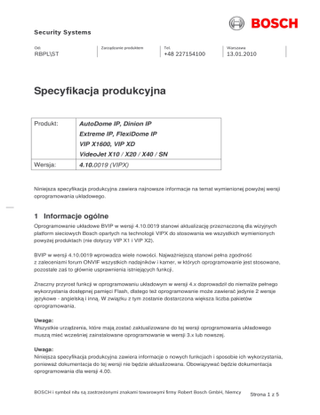 ! ""# $% $& & $' & $ "& $& Specyfikacja produkcyjna Produkt: AutoDome IP, Dinion IP Extreme IP, FlexiDome IP VIP X1600, VIP XD VideoJet X10 / X20 / X40 / SN Wersja: 4.10.0019 (VIPX) Niniejsza specyfikacja produkcyjna zawiera najnowsze informacje na temat wymienionej powy ej wersji oprogramowania układowego. 1 Informacje ogólne Oprogramowanie układowe BVIP w wersji 4.10.0019 stanowi aktualizacj przeznaczon dla wizyjnych platform sieciowych Bosch opartych na technologii VIPX do stosowania we wszystkich wymienionych powy ej produktach (nie dotyczy VIP X1 i VIP X2). BVIP w wersji 4.10.0019 wprowadza wiele nowo ci. Najwa niejsz stanowi pełna zgodno z zaleceniami forum ONVIF wszystkich nadajników i kamer, w których oprogramowanie jest stosowane, pozostałe za to głównie usprawnienia istniej cych funkcji. Znaczny przyrost funkcji w oprogramowaniu układowym w wersji 4.x doprowadził do niemal e pełnego wykorzystania dost pnej pami ci Flash, dlatego te oprogramowanie mo e zawiera jedynie 2 wersje j zykowe - angielsk i inn . W zwi zku z tym zostanie dostarczona wi ksza liczba pakietów oprogramowania. Uwaga: Wszystkie urz dzenia, które maj zosta zaktualizowane do tej wersji oprogramowania układowego musz mie wcze niej zainstalowane oprogramowanie w wersji 3.x lub nowszej. Uwaga: Niniejsza specyfikacja produkcyjna zawiera informacje o nowych funkcjach i sposobie ich wykorzystania, poniewa dokumentacja do tej wersji nie b dzie aktualizowana. Obowi zywa b dzie dokumentacja oprogramowania dla wersji 4.00. ( ) * + , * * - * + ./ 0 +) 12 .* $ % ! ""# $% $& & $' & $ "& $& 2 Nowe funkcje • • • • • • • • Pełna zgodno ze standardem ONVIF 1.0 Obsługa funkcji PTZ, zdarze i przetwarzania obrazu. Pełna zdolno oprogramowania układowego z oficjalnym narz dziem testowym ONVIF 1.01. Mo liwo maskowania stref prywatno ci a w 8 niezale nych obszarach dzi ki kamerom kopułkowym i nadajnikom. Maski ustawia si poprzez graficzny interfejs u ytkownika w przegl darce sieciowej. Mog mie kolor biały, szary lub czarny. Mo liwo wyboru jedynie trybu MPEG-4, je li nie wyst puje konieczno kodowania H.264 w celu uzyskania wydajno ci kodowania na poziomie oprogramowania układowego w wersji 3.5x, kiedy nadajnik pracuje ju na najwy szej wydajno ci. Tryb ten automatycznie wył cza funkcj stabilizacji obrazu wykorzystywan w analizie zawarto ci obrazu (VCA). Obsługa redukcji przepustowo ci sieci w czasie okresów ciszy przez moduły nadajników VIP X1600 XFM4 H.264. Do efektywnego działania funkcja ta wymaga wysokiej jako ci wej ciowego sygnału wizyjnego o niskim poziomie szumów. Uwaga: Funkcja ta wykorzystuje docelow przepływno danych oraz maksymaln przepływno danych jako parametry rozgraniczaj ce, gdzie docelowa przepływno danych oznacza warto ciszy (braku ruchu). Nadajnik ocenia, czy wyst puje ruch w scenie i przeł cza na maksymaln przepływno danych w celu uzyskania najwy szej jako ci obrazu poruszaj cych si obiektów. Po ponownym zapadni ciu ciszy w scenie, w ci gu kilku sekund przepływno wraca do poziomu docelowej przepływno ci danych. Aby utrzyma identyczn funkcjonalno nadajników wzgl dem poprzednich wersji oprogramowania układowego, zmodyfikowano domy lne profile ustawie . Profile zmodyfikowane przez u ytkowników w celu niekorzystania z ustawie domy lnych nale y zmodyfikowa r cznie. Tak e profile obecnie lub w przeszło ci wykorzystywane do zapisu musz zosta r cznie zmodyfikowane lub ustawione na warto ci domy lne. W przeciwnym wypadku nadajniki te b d pracowa z maksymaln przepływno ci danych przy pojawieniu si ruchu lub zakłóce w scenie, zamiast, jak poprzednio, korzysta z docelowej przepływno ci danych. Oddziałuje to przede wszystkim na wymagan przestrze zapisu. Omawiana funkcja dost pna jest dla maksymalnej przepływno ci danych wy szej o ponad 10% od docelowej przepływno ci danych. Obsługa protokołu RSTP (Rapid Spanning Tree Protocol) przez systemy podstawowe VIP X1600 zapewniaj ce nadmiarowe poł czenia w sieciach. Funkcja ta opisana jest w istniej cej dokumentacji. Obsługa funkcji agregacji kanałów Static Port Trunking przez systemy podstawowe VIP X1600. Funkcja ta umo liwia agregacj interfejsów Ethernet w celu uzyskania wy szej przepustowo ci w sieci. Funkcja opisana jest w istniej cej dokumentacji. Mo liwo tunelowania przez port HTTP odtwarzania z macierzy iSCSI, pozwalaj cego na odtwarzanie poprzez poł czenia WAN przy u yciu funkcji NAT / PAT. Mo liwo testowania nowych wersji funkcji IVA przez 30 dni, pocz wszy od aktualizacji oprogramowania układowego zawieraj cego now wersj IVA. ( ) * + , * * - * + ./ 0 +) 12 .* " % ! ""# $% $& & • • • • • • $' & $ "& $& Alarmy MOTION+ generowane z czasem zwłoki 1 s w celu zmniejszenia obci enia systemów zarz dzania przez otrzymywane zdarzenia. Mo liwo gromadzenia wielu alarmów MOTION+ lub IVA przez ustawiony czas. Poł czenia foniczne RTSP wykorzystuj ce znaczniki czasowe 8 kHz zapewniaj ce mo liwo odtwarzania w standardowych odtwarzaczach w rodzaju Quicktime czy VLC. Menu ekranowe kamer analogowych Dinion dost pne przez interfejs przegl darki sieciowej. Obsługa protokołu NTCIP przez kamery sieciowe AutoDome. Obsługa architektury uPNP w systemach MS Windows XP i Vista. 3 Zmiany • • • Problem z nadajnikiem VJ-X20 w trybie VCA uniemo liwiaj cy obsług inteligentnej analizy obrazu (IVA) bez zainstalowanej licencji został rozwi zany. Nie jest obecnie konieczne nabywanie licencji (IVA) do funkcjonalno ci VCA. Krosownica sieciowa została rozbudowana o obsług nadajnika VJ8008. Rozbudowana funkcja oszcz dzania pasma przepustowo ci w czasie ciszy w scenie mo e zmienia zachowanie modułów nadajnika VIP X1600 XFM4 H.264. Uwaga: Profile zmodyfikowane przez u ytkowników w celu niekorzystania z ustawie domy lnych nale y zmodyfikowa r cznie. Tak e profile obecnie lub w przeszło ci wykorzystywane do zapisu musz zosta r cznie zmodyfikowane lub ustawione na warto ci domy lne. W przeciwnym wypadku nadajniki te b d