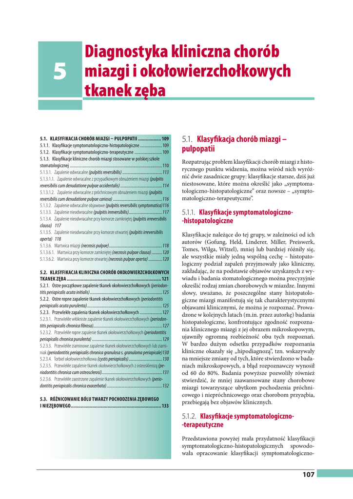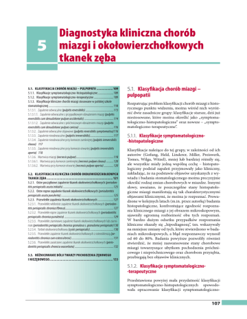 5 Diagnostyka kliniczna chorób miazgi i okołowierzchołkowych tkanek zęba 5.1. Klasyfikacja chorób miazgi – pulpopatii................... 109 5.1.1. Klasyfikacje symptomatologiczno-histopatologiczne......................109 5.1.2. Klasyfikacje symptomatologiczno-terapeutyczne...........................109 5.1.3. Klasyfikacje kliniczne chorób miazgi stosowane w polskiej szkole stomatologicznej........................................................................................110 5.1.3.1. Zapalenie odwracalne (pulpitis reversibilis).......................................113 5.1.3.1.1. Zapalenie odwracalne z przypadkowym obnażeniem miazgi (pulpitis reversibilis cum denudatione pulpae accidentalis).........................................114 5.1.3.1.2. Zapalenie odwracalne z próchnicowym obnażeniem miazgi (pulpitis reversibilis cum denudatione pulpae cariosa)................................................116 5.1.3.2. Zapalenie odwracalne objawowe (pulpitis reversibilis symptomatica).116 5.1.3.3. Zapalenie nieodwracalne (pulpitis irreversibilis).................................117 5.1.3.4. Zapalenie nieodwracalne przy komorze zamkniętej (pulpitis irreversibilis clausa) 117 5.1.3.5. Zapalenie nieodwracalne przy komorze otwartej (pulpitis irreversibilis aperta) 118 5.1.3.6. Martwica miazgi (necrosis pulpae)....................................................118 5.1.3.6.1. Martwica przy komorze zamkniętej (necrosis pulpae clausa)...........120 5.1.3.6.2. Martwica przy komorze otwartej (necrosis pulpae aperta)..............120 5.2. Klasyfikacja kliniczna chorób okołowierzchołkowych tkanek zęba........................................................................... 121 5.2.1. Ostre początkowe zapalenie tkanek okołowierzchołkowych (periodontitis periapicalis acuta initialis)......................................................................125 5.2.2. Ostre ropne zapalenie tkanek okołowierzchołkowych (periodontitis periapicalis acuta purulenta).........................................................................125 5.2.3. Przewlekłe zapalenia tkanek okołowierzchołkowych......................127 5.2.3.1. Przewlekłe włókniste zapalenie tkanek okołowierzchołkowych (periodontitis periapicalis chronica fibrosa)..................................................................127 5.2.3.2. Przewlekłe ropne zapalenie tkanek okołowierzchołkowych (periodontitis periapicalis chronica purulenta)....................................................................129 5.2.3.3. Przewlekłe ziarninowe zapalenie tkanek okołowierzchołkowych lub ziarniniak (periodontitis periapicalis chronica granulosa s. granuloma periapicale).130 5.2.3.4. Torbiel okołowierzchołkowa (cystis periapicalis).................................130 5.2.3.5. Przewlekłe zapalenie tkanek okołowierzchołkowych z osteosklerozą (periodontitis chronica cum osteosclerosi)..........................................................131 5.2.3.6. Przewlekłe zaostrzone zapalenie tkanek okołowierzchołkowych (periodontitis periapicalis chronica exacerbata)......................................................132 5.3. Różnicowanie bólu twarzy pochodzenia zębowego i niezębowego........................................................................ 133 5.1. Klasyfikacja chorób miazgi – pulpopatii Rozpatrując problem klasyfikacji chorób miazgi z historycznego punktu widzenia, można wśród nich wyróżnić dwie zasadnicze grupy: klasyfikacje starsze, dziś już niestosowane, które można określić jako „symptomatologiczno-histopatologiczne” oraz nowsze – „symptomatologiczno-terapeutyczne”. 5.1.1. Klasyfikacje symptomatologiczno‑histopatologiczne Klasyfikacje należące do tej grupy, w zależności od ich autorów (Gofung, Held, Linderer, Miller, Preiswerk, Tomes, Wilga, Witzel), mniej lub bardziej różniły się, ale wszystkie miały jedną wspólną cechę – histopatologiczny podział zapaleń przyjmowały jako kliniczny, zakładając, że na podstawie objawów uzyskanych z wywiadu i badania stomatologicznego można precyzyjnie określić rodzaj zmian chorobowych w miazdze. Innymi słowy, uważano, że poszczególne stany histopatologiczne miazgi manifestują się tak charakterystycznymi objawami klinicznymi, że można je rozpoznać. Prowadzone w kolejnych latach (m.in. przez autorkę) badania histopatologiczne, konfrontujące zgodność rozpoznania klinicznego miazgi z jej obrazem mikroskopowym, ujawniły ogromną rozbieżność obu tych rozpoznań. W bardzo dużym odsetku przypadków rozpoznania kliniczne okazały się „hipodiagnozą”, tzn. wskazywały na mniejsze zmiany od tych, które stwierdzono w badaniach mikroskopowych, a błąd rozpoznawczy wynosił od 60 do 80%. Badania powyższe pozwoliły również stwierdzić, że mniej zaawansowane stany chorobowe miazgi towarzyszące ubytkom pochodzenia próchnicowego i niepróchnicowego oraz chorobom przyzębia, przebiegają bez objawów klinicznych. 5.1.2. Klasyfikacje symptomatologiczno‑terapeutyczne Przedstawiona powyżej mała przydatność klasyfikacji symptomatologiczno‑histopatologicznych spowodowała opracowanie klasyfikacji symptomatologiczno 107 Rozdział 5 / Diagnostyka kliniczna chorób miazgi i okołowierzchołkowych tkanek zęba ‑terapeutycznych, to znaczy takich, które na podstawie objawów klinicznych nie usiłują postawić rozpoznania histopatologicznego, lecz wskazują na właściwą w danym przypadku metodę leczenia. Podstawę opracowania tych klasyfikacji stanowi fakt, że w miarę nasilania się zapalenia narastają objawy kliniczne, których dokładne analizowanie pozwala jedynie określić stopień zaawansowania procesu chorobowego – czy jest to zapalenie odwracalne nadające się do leczenia biologicznego, czy też nieodwracalne, wymagające wyłuszczenia miazgi. W latach 60. i 70. XX w. zaproponowano kilka takich klasyfikacji. Baume i Fiore‑Donno (1972 r.) wprowadzili podział pulpopatii