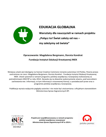 EDUKACJA GLOBALNA Warsztaty dla nauczycieli w ramach projektu „Połącz to! Świat zależy od nas – my zależymy od świata” Opracowanie: Magdalena Bergmann, Dorota Kondrat Fundacja Instytut Edukacji Kreatywnej INEK Niniejszy utwór jest dostępny na licencji Creative Commons Uznanie autorstwa 3.0 Polska. Pewne prawa zastrzeżone na rzecz: Magdalena Bergmann, Dorota Kondrat - Fundacja Instytut Edukacji Kreatywnej INEK. Utwór powstał w ramach programu polskiej współpracy rozwojowej realizowanej za pośrednictwem MSZ RP w roku 2014. Zezwala się na dowolne wykorzystanie utworu, pod warunkiem zachowania ww. informacji, w tym informacji o stosowanej licencji, o posiadaczach praw oraz o programie polskiej współpracy rozwojowej. Publikacja wyraża wyłącznie poglądy autorów i nie może być utożsamiana z oficjalnym stanowiskiem Ministerstwa Spraw Zagranicznych RP. Projekt jest współfinansowany w ramach programu polskiej współpracy rozwojowej Ministerstwa Spraw Zagranicznych RP w 2014 r. www.inek.pl CZYM JEST EDUKACJA GLOBALNA? Według definicji wypracowanej wspólnie w 2010 r. przez ekspertów z MEN, MSZ i ORE edukacja globalna to: „część kształcenia obywatelskiego i wychowania, która rozszerza jego zakres przez uświadamianie istnienia zjawisk i współzależności łączących ludzi i miejsca. Jej celem jest przygotowanie odbiorców do stawiania czoła wyzwaniom dotyczącym całej ludzkości. Przez współzależności rozumiemy wzajemne powiązania i przenikanie systemów kulturowych, środowiskowych, ekonomicznych, społecznych, politycznych i technologicznych”1 Obszar edukacji globalnej jest tak szeroki, jak charakter zjawisk ogarniających swoim zasięgiem państwa, kontynenty i cały świat. W szczególności zaś zajmuje się: wyjaśnianiem przyczyn i konsekwencji zjawisk o charakterze globalnym przedstawianiem perspektywy i sytuacji Globalnego Południa: krajów Afryki, Ameryki Płd. i części Azji, w których kumuluje się wiele negatywnych konsekwencji globalizacji (nazywanych często „Trzecim Światem” lub „krajami rozwijającymi się”) uczeniem rozumienia świata jako złożonego i dynamicznego systemu kształtowaniem krytycznego myślenia i zmiany postaw jednostkowych ukazywaniem wpływu jednostki na globalne procesy i procesów na jednostkę Mówiąc o globalizacji, najczęściej mamy na myśli ogół powiązanych ze sobą procesów występujących w skali światowej, a dotyczących czterech zasadniczych obszarów – społeczeństwa, środowiska, gospodarki i polityki. Sygnały i procesy globalizacji dają o sobie znać w wielu obszarach codziennego życia: pracy, nauce, czasie wolnym, zakupach i konsumpcji, podróżach, uczestnictwie politycznym, itp. SPOŁECZEŃSTWO GOSPODARKA 1 ŚRODOWISKO POLITYKA Źródło: http://fed.home.pl/teg/index.php?option=com_content&view=section&layout=blog&id=11&Itemid=178 DLACZEGO MÓWIMY O EDUKACJI GLOBALNEJ? jak już wspomniano powyżej, zależności pomiędzy częściami świata i zachodzącymi w nich procesami zacieśniają się, wywierając duży wpływ na życie jednostek, grup, rodzin, społeczności lokalnych globalizacja tworzy szanse, ale i zagrożenia, których warto być świadomym celem edukacji jest przygotowanie młodego człowieka do radzenia sobie we współczesnym świecie – powinno ono uwzględniać też aspekty globalne rośnie zaangażowanie Polski w życie społeczności międzynarodowej (UE, NATO, ONZ) i pomoc udzielana krajom Globalnego Południa – by zrozumieć sens tego zaangażowania i pomocy konieczna jest rzetelna informacja DLACZEGO GLOBALNE POŁUDNIE? Mianem Globalnego Południa określa się kraje Ameryki Płd., Afryki i części Azji. Mimo, iż mieszka w nich większość ludności świata, borykają się z wieloma złożonymi problemami społecznymi, gospodarczymi i politycznymi: ubóstwem, brakiem dostępu http://globalyearofinsight.com/media/theblessing/artwork/CHAP_05_Low/global_south_low-rez.jpg do podstawowych zasobów (woda, żywność, schronienie) oraz praw obywatelskich (np. prawo do edukacji, opieki zdrowotnej, równego traktowania ze względu na płeć), konfliktami społecznymi (wojny, zorganizowana przestępczość, terroryzm), deficytami demokracji i jednocześnie niewydolnością instytucji publicznych (korupcja, anarchia). „Globalne Południe” to propozycja nazywania tych obszarów świata bez negatywnego wartościowania (jak w przypadku zadomowionego w wielu językach określenia „Trzeci Świat”) albo wprowadzania w błąd co do rzeczywistej w nich sytuacji („kraje rozwijające się”, w których rozwój jest de facto utrudniony). OBSZARY I ZAGADNIENIA EDUKACJI GLOBALNEJ zrównoważony rozwój ochrona środowiska prawa człowieka warunki życia i dostęp do zasobów sprawiedliwość społeczna i dobrobyt zapobieganie i rozwiązywanie konfliktów relacje między kulturami, narodami, religiami odpowiedzialna konsumpcja i gospodarowanie zasobami JAK WŁĄCZYĆ ZAGADNIENIA EDUKACJI GLOBALNEJ DO PRAKTYKI EDUKACYJNEJ? Treści programowe przedmiotów są bardzo obszerne i niekiedy można spotkać się z uwagami nauczycieli, że ciężko je zrealizować w istniejących ramach czasowych. Czy w takiej sytuacji można pozwolić sobie na dodatkowe obciążenie merytoryczne i czasowe, jakim jest edukacja globalna? Poniżej podano kilka możliwych sposobów włączania elementów edukacji globalnej do codziennej pracy z uczniami bez konieczności ponoszenia dodatkowych nakładów czasowych: w już istniejących programach nauczania występuje wiele zagadnień, do których można podejść z perspektywy edukacji globalnej – wykorzystać jako metaforę, ukazać długofalowe konsekwencje, pokazać analogię z innym problemem przy pracy metodą projektu edukacyjnego można zwrócić uwagę uczniów na to, iż sprawa czy problem, którą chcieliby się zająć (np. zanieczyszczenie lokalnego środowiska), ma szerszy kontekst i zachęcić do jego odkrywania w ks