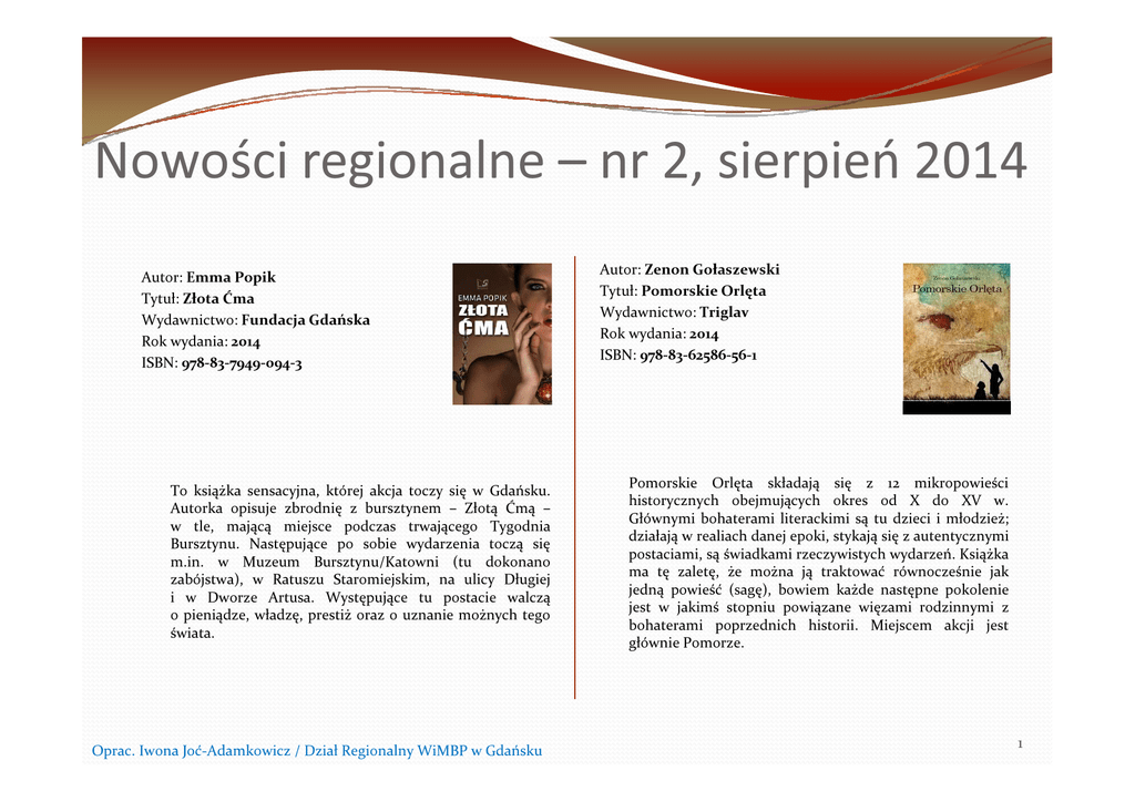 Nowości regionalne – nr 2, sierpień 2014 Autor: Emma Popik Tytuł: Złota Ćma Wydawnictwo: Fundacja Gdańska Rok wydania: 2014 ISBN: 978-83-7949-094-3 To książka sensacyjna, której akcja toczy się w Gdańsku. Autorka opisuje zbrodnię z bursztynem – Złotą Ćmą – w tle, mającą miejsce podczas trwającego Tygodnia Bursztynu. Następujące po sobie wydarzenia toczą się m.in. w Muzeum Bursztynu/Katowni (tu dokonano zabójstwa), w Ratuszu Staromiejskim, na ulicy Długiej i w Dworze Artusa. Występujące tu postacie walczą o pieniądze, władzę, prestiż oraz o uznanie możnych tego świata. Oprac. Iwona Joć-Adamkowicz / Dział Regionalny WiMBP w Gdańsku Autor: Zenon Gołaszewski Tytuł: Pomorskie Orlęta Wydawnictwo: Triglav Rok wydania: 2014 ISBN: 978-83-62586-56-1 Pomorskie Orlęta składają się z 12 mikropowieści historycznych obejmujących okres od X do XV w. Głównymi bohaterami literackimi są tu dzieci i młodzież; działają w realiach danej epoki, stykają się z autentycznymi postaciami, są świadkami rzeczywistych wydarzeń. Książka ma tę zaletę, że można ją traktować równocześnie jak jedną powieść (sagę), bowiem każde następne pokolenie jest w jakimś stopniu powiązane więzami rodzinnymi z bohaterami poprzednich historii. Miejscem akcji jest głównie Pomorze. 1 Autor: Łukasz Maciejewski (red.) Tytuł: Flirtując z życiem Wydawnictwo: Znak Rok wydania: 2014 ISBN: 978-83-240-2468-1 Pochodząca z kaszubskiego Gowidlina Danuta Stenka to piękna, emocjonalna, temperamentna, kobieta sukcesu, gwiazda ekranu. Media, kreując wizerunek artystki, nawet w połowie nie oddają prawdy o jej niezwykłej osobowości. Pełne szczerości rozmowy z Łukaszem Maciejewskim odsłaniają jej inne, nieznane oblicze. Stenka nie waha się otwarcie mówić o kosztach, jakie wiążą się z jej wymagającym zawodem – o towarzyszącym jej przez lata stresie i ciągłym braku pewności siebie. Scenariusz: Barbara Kosmowska Rysunki: Roman Kucharski Tytuł: Wakacje w Raju Wydawnictwo: Fundacja Partnerstwo Dorzecze Słupi, TO DESIGN Rok wydania: 2013 ISBN: 978-83-937736-0-2 Ukazał się kolejny bytowski komiks. To zabawna wakacyjna historia o pewnej parze z Warszawy, która wybrała się w okolice Jasienia w powiecie bytowskim na wczasy. Dla niego to miłe wspomnienie dzieciństwa, dla niej na początku dopust Boży. Scenarzystka Barbara Kosmowska wykorzystała dobrą znajomość okolicy i ludzi, nie tylko tych mieszkających wokół jasieńskiego jeziora. Np. jedna z historyjek – dotycząca grzybobrania – która przydarzyła się w tamtejszych lasach pisarce, została przeniesiona do komiksu. 2 Autor: Zygfryd Stefan Mielewczyk Tytuł: Fotograficzne promieniowanie tła Wydawnictwo: Oskar Rok wydania: 2013 ISBN: 978-83-63709-29-7 Publikacji o Polakach w Wolnym Mieście Gdańsku mamy całkiem sporo, ale książki takiej, jak „Fotograficzne promieniowanie tła” jeszcze nie było. Zygfryd Stefan Mielewczyk (1936-2011) postanowił spisać rodzinną historię w oparciu o zdjęcia zachowane w domowym archiwum. Układają się one w opowieść o życiu codziennym i odświętnym zarówno w Gdańsku, jak i na Kaszubach. Jest ona tym bardziej ciekawa, że ojcem autora był Franciszek Mielewczyk, obrońca Poczty Polskiej w Gdańsku, któremu udało się wydostać z oblężonego przez Niemców budynku i szczęśliwie uniknął losu kolegów rozstrzelanych na Zaspie w październiku 1939 r. Autor: Monika Sanecka Tytuł: Historia kaszubszczyzny z zarysie Wydawnictwo: Region Rok wydania: 2014 ISBN: 978-83-7591-341-5 Nadanie kaszubszczyźnie statusu języka regionalnego stało się dla mnie inspiracją do zajęcia się jej historią. Dodatkową motywacją uzasadniającą wybór tematu jest fakt, że jestem mieszkanką Chojnic, miasta, które przed wiekami Jan Długosz nazwał „Bramą Pomorza i Kaszub”, a które dzisiaj identyfikuje się z kulturą kaszubską. Fragment wstępu 3 Autor: Małgorzata Klinkosz (red.) Zenon Lica (red.) Tytuł: Językowy, literacki i kulturowy obraz Pomorza Wydawnictwo: Wydawnictwo Uniwersytetu Gdańskiego Rok wydania: 2013 ISBN: 978-83-7865-086-7 1 Prezentowany tom stanowi pokłosie konferencji zorganizowanej przez Zakład Historii Języka Polskiego, Dialektologii i Onomastyki wespół z Instytutem Kaszubskim. Poruszane w niej problemy dotyczyły języka kaszubskiego, toponimii, antroponimii, choronimii i chrematonimii oraz różnych innych zagadnień językoznawczych, i nie tylko, związanych z Pomorzem. Autor: Mirosław Ugowski Tytuł: Baśka. Kaszubska gra karciana Wydawnictwo: Zrzeszenie KaszubskoPomorskie Rok wydania: 2014 ISBN: 978-83-63538-08-8 „BAŚKA” jest grą w karty dla czterech osób. Można też grać w pięć osób, trzy lub dwie. W każdej grze mamy podział na ,,starych’’ i ,,młodych’’. W ,,zwykłej grze’’ oraz zgłoszonym „weselu”, mamy dwóch „starych” i dwóch „młodych”. W pozostałych grach jest zawsze jeden „stary” i trzech „młodych”. Gra w „BAŚKĘ” powstała na Kaszubach na przełomie I i II połowy XIX w. Cztery damy w jednym ręku nazywane są „Baśką”, stąd pochodzi nazwa gry. 4 Autor: Jan Perszon Tytuł: Ksiądz Zygmunt Trella Wydawnictwo: Zrzeszenie Kaszubsko-Pomorskie Rok wydania: 2014 ISBN: 9 978-83-63538-16-3 Pokaźną część swej życiowej drogi – bez mała trzydzieści lat ks. Trella odbył jako proboszcz w Mechowie. Chrzcił, spowiadał, katechizował, sprawował codzienną Eucharystię, błogosławił nowe małżeństwa, celebrował pogrzeby. Dla wielu – zwłaszcza młodych parafian – był tam „od zawsze”. Towarzyszył – we dnie i w nocy – codziennej egzystencji wiernych, dla których z woli Kościoła był pasterzem i przewodnikiem w drodze do Boga. Wrósł w lokalną wspólnotę, która – zwłaszcza pod koniec jego życia – mówiła o nim z dumą „nasz ksiądz”. W czasach, które ponad wszystko cenią aktywność, wydajność, ef