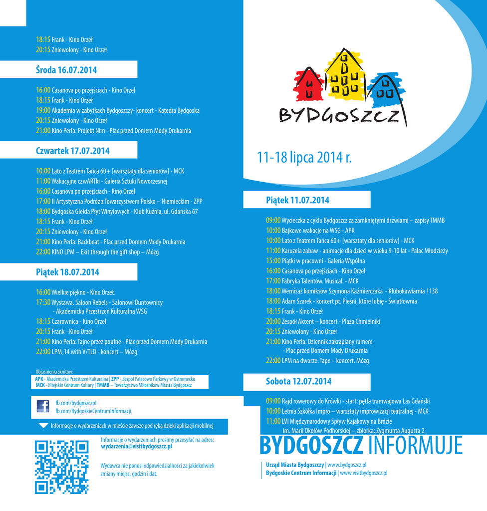 18:15 Frank - Kino Orzeł 20:15 Zniewolony - Kino Orzeł Środa 16.07.2014 16:00 Casanova po przejściach - Kino Orzeł 18:15 Frank - Kino Orzeł 19:00 Akademia w zabytkach Bydgoszczy- koncert - Katedra Bydgoska 20:15 Zniewolony - Kino Orzeł 21:00 Kino Perła: Projekt Nim - Plac przed Domem Mody Drukarnia Czwartek 17.07.2014 10:00 Lato z Teatrem Tańca 60+ [warsztaty dla seniorów] - MCK 11:00 Wakacyjne czwARTki - Galeria Sztuki Nowoczesnej 16:00 Casanova po przejściach - Kino Orzeł 17:00 II Artystyczna Podróż z Towarzystwem Polsko – Niemieckim - ZPP 18:00 Bydgoska Giełda Płyt Winylowych - Klub Kuźnia, ul. Gdańska 67 18:15 Frank - Kino Orzeł 20:15 Zniewolony - Kino Orzeł 21:00 Kino Perła: Backbeat - Plac przed Domem Mody Drukarnia 22:00 KINO LPM – Exit through the gift shop – Mózg Piątek 18.07.2014 16:00 Wielkie piękno - Kino OrzeŁ 17:30 Wystawa. Saloon Rebels - Salonowi Buntownicy - Akademicka Przestrzeń Kulturalna WSG 18:15 Czarownica - Kino Orzeł 20:15 Frank - Kino Orzeł 21:00 Kino Perła: Tajne przez poufne - Plac przed Domem Mody Drukarnia 22:00 LPM ‚14 with V/TLD - koncert – Mózg Objaśnienia skrótów: APK - Akademicka Przestrzeń Kulturalna | ZPP - Zespół Pałacowo Parkowy w Ostromecku MCK - Miejskie Centrum Kultury | TMMB – Towarzystwo Miłośników Miasta Bydgoszcz fb.com/bydgoszczpl fb.com/BydgoskieCentrumInformacji Informacje o wydarzeniach w mieście zawsze pod ręką dzięki aplikacji mobilnej Informacje o wydarzeniach prosimy przesyłać na adres: [email protected] Wydawca nie ponosi odpowiedzialności za jakiekolwiek zmiany miejsc, godzin i dat. 11-18 lipca 2014 r. Piątek 11.07.2014 09:00 Wycieczka z cyklu Bydgoszcz za zamkniętymi drzwiami – zapisy TMMB 10:00 Bajkowe wakacje na WSG - APK 10:00 Lato z Teatrem Tańca 60+ [warsztaty dla seniorów] - MCK 11:00 Karuzela zabaw - animacje dla dzieci w wieku 9-10 lat - Pałac Młodzieży 15:00 Piątki w pracowni - Galeria Wspólna 16:00 Casanova po przejściach - Kino Orzeł 17:00 Fabryka Talentów. Musical. - MCK 18:00 Wernisaż komiksów Szymona Kaźmierczaka - Klubokawiarnia 1138 18:00 Adam Szarek - koncert pt. Pieśni, które lubię - Światłownia 18:15 Frank - Kino Orzeł 20:00 Zespół Akcent – koncert - Plaża Chmielniki 20:15 Zniewolony - Kino Orzeł 21:00 Kino Perła: Dziennik zakrapiany rumem - Plac przed Domem Mody Drukarnia 22:00 LPM na dworze. Tape - koncert. Mózg Sobota 12.07.2014 09:00 Rajd rowerowy do Krówki - start: pętla tramwajowa Las Gdański 10:00 Letnia Szkółka Impro – warsztaty improwizacji teatralnej - MCK 11:00 LVI Międzynarodowy Spływ Kajakowy na Brdzie im. Marii Okołów Podhorskiej – zbiórka: Zygmunta Augusta 2 BYDGOSZCZ INFORMUJE Urząd Miasta Bydgoszczy | www.bydgoszcz.pl Bydgoskie Centrum Informacji | www.visitbydgoszcz.pl 11:30 Sceny Leonarda Da Vinci - antydepresyjne spotkanie ze sztuką i z sobą – ZPP 12:30 Spacer z przewodnikiem: Nad Stary Kanał Bydgoski - start: Bydgoskie Centrum Informacji 16:00 Casanova po przejściach - Kino Orzeł 18:00 Letnie Koncerty Promenadowe: Orkiestra Dęta Inowrocław - Barka „Lemara” 18:15 Frank - Kino Orzeł 19:00 II edycja Moblinego Muzeum - Start: Kawiarnia Strefa 19:00 Pierwsze DEMO + Tony Clifton Presents - koncert. Wake Park/Myślęcinek 20:15 Zniewolony - Kino Orzeł 21:00 Kino Perła: Łowca jeleni - Plac przed Domem Mody Drukarnia Niedziela 13.07.2014 09:30 Letnia Akademia Ruchu. Orientalny taniec brzucha - Wyspa Młyńska 10:00 Piknik Strzelecki - Strzelnica Garnizonowa, ul. Rynkowska 7 13:00 Niejedna Strona Sztuki - warsztaty dla najmłodszych - Galeria Miejska bwa 14:00 Futbol Amerykański, KS Bydgoszcz Archers vs Patrioci Poznań - Stadion Polonii 16:00 Casanova po przejściach - Kino Orzeł 16:00 Muzyczne tarasy: Krzysztof Filasiński (baryton) – koncert – ZPP 17:00 Wielka Gala Disco Polo - Broadway Club 17:00 Przystanek Teatr: Pan Baj i zaczarowana katarynka - Amfiteatr przy spichrzach, ul. Grodzka 11 18:15 Frank - Kino Orzeł 19:00 Rzeka Muzyki. CO - Opera na Pokładzie - Amfiteatr Opery Nova 19:00 Letni Mikser vol. 1 – pokaz krótkich form impro - Kawiarnia SZPULKA 20:15 Zniewolony - Kino Orzeł 21:00 Kino Perła: Gracz - Plac przed Domem Mody Drukarnia Poniedziałek 14.07.2014 17:30 Spotkanie miłośników gór. Klub Turystów Górskich Trawers - Sienkiewicza 1/I Wtorek 15.07.2014 11:00 Wtorkowe Warsztaty Wakacyjne dla dzieci - Galeria Sztuki Nowoczesnej 16:00 Casanova po przejściach - Kino Orzeł 11:30 Sceny Leonarda Da Vinci - antydepresyjne spotkanie ze sztuką i z samym sobą – ZPP BYDGOSZCZ INFORMUJE