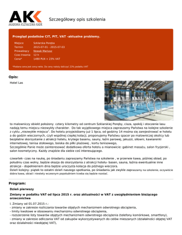 Szczegółowy opis szkolenia Przegląd podatków CIT, PIT, VAT –aktualne problemy. Miejsce Szklarska Poręba Termin 2015-07-01 - 2015-07-03 Prowadzący Nowak Mariusz Czas trwania 12 h Cena* 1490 PLN + 23% VAT *Podana cena jest ceną netto. Do ceny należy doliczyć 23% podatku VAT Opis: Hotel Las to malowniczy obiekt położony cztery kilometry od centrum Szklarskiej Poręby, cisza, spokój i otoczenie lasu nadają temu miejscu niezwykły charakter. Do tak wyjątkowego miejsca zapraszamy Państwa na kolejne szkolenie z cyklu „niezwykłe miejsca”. Do hotelu przyjeżdżamy już 1 lipca, od godziny 14 można się zarejestrować w hotelu a do godzin wieczornych, czyli wspólnej ciepłej kolacji, proponujemy Państwu spacer po malowniczej okolicy lub bezpłatne skorzystanie z atrakcji hotelu, krytego basenu, sauny, łaźni parowej, jakuzzi, siłowni, kawiarenki internetowej, tenisa stołowego, boiska do piłki plażowej , kortu tenisowego, Szczególnie Panie może zainteresować dodatkowa oferta hotelu a mianowicie: gabinet masażu, salon fryzjerski , salon kosmetyczny. Każdy znajdzie dla siebie coś interesującego. czwartek- czas na naukę, po śniadaniu zapraszamy Państwa na szkolenie , w przerwie kawa, później obiad, po południu czas wolny, będzie okazja do skorzystania z atrakcji hotelu- basen, sauna, łaźnia ewentualnie inne atrakcje - dopełnieniem dnia będzie uroczysta kolacja do późnego wieczora. Dzień kolejny- piątek to ostatni dzień naszego spotkania, po śniadaniu jak zwykle zapraszamy na szkolenie, oczywiście dobra kawa, obiad i niestety wczesnym popołudniem trzeba się będzie rozstać. Program: Dzień pierwszy Zmiany w podatku VAT od lipca 2015 r. oraz aktualności w VAT z uwzględnieniem bieżącego orzecznictwa I. Zmiany od 01.07.2015 r.: - zmiany w zakresie rozliczania towarów objętych mechanizmem odwrotnego obciążenia, - limity kwotowe w stosowaniu mechanizmu odwrotnego obciążenia, - rozszerzenie listy towarów objętych mechanizmem odwrotnego obciążenia (telefony komórkowe, smartfony), - zmiany w zakresie odliczania VAT od zakupów wykorzystywanych do celów mieszanych (działalności objętej VAT oraz działalności nieobjętej VAT), - zmiany dotyczące ulgi na złe długi – dłużnik w trakcie postępowania upadłościowego lub w trakcie likwidacji, - wprowadzenie informacji podsumowujących dla transakcji objętych mechanizmem odwrotnego obciążenia, - zmiany w zakresie towarów objętych odpowiedzialnością solidarną za zaległości podatkowe (rozszerzenie listy towarów w tym o komputery przenośne, tablety, konsole do gier), - zmiany dotyczące kaucji gwarancyjnej, II. Zmiany w VAT uchwalone na 2015 r. ustawą z dnia 25 lipca 2014 r. o zmianie ustawy o podatku od towarów i usług oraz ustawy – Ordynacja podatkowa (Dz.U. z 2014r., poz 1171): Procedura małego punktu obsługi w zakresie VAT obowiązująca w Polsce i w UE od 1 stycznia 2015 r.: - sposób rozliczania według nowej procedury, - pojęcie usług telekomunikacyjnych, usług nadawczych oraz usług elektronicznych, - pojęcie państwa członkowskiego identyfikacji i konsumpcji, - pojęcie stałego miejsca prowadzenia działalności gospodarczej oraz państwa członkowskiego prowadzenia przedsiębiorstwa, - rejestracja, składanie deklaracji, płatność, zwroty, prowadzenie ewidencji. III. Bieżące problemy związane z rozliczaniem VAT 1. Odliczenie podatku VAT z tytułu nabycia samochodów: - definicja pojazdu samochodowego, - limity odliczeń 50% podatku naliczonego z tytułu nabycia oraz użytkowania samochodów, nabycia paliwa i wydatków eksploatacyjnych związanych z samochodem, - przypadki, w których podatnikowi przysługuje pełne 100% prawo do odliczenia z tytułu nabycia oraz leasingu samochodów oraz nabycia paliwa, - wykorzystywanie samochodu wyłącznie do działalności gospodarczej podatnika, - obowiązek prowadzenia ewidencji przebiegu pojazdu, obowiązek zgłaszania w urzędzie skarbowym informacji o samochodach - odprzedaż oraz oddanie samochodów w odpłatne używanie na podstawie umowy najmu, dzierżawy, leasingu lub innej umowy o podobnym charakterze, samochody specjalne, - korekta podatku naliczonego w przypadku zmiany przeznaczenia samochodów, - brak opodatkowania nieodpłatnego użycia samochodu, od którego przysługiwało ograniczone prawo do odliczenia, - obowiązek przeprowadzenia dodatkowych badań technicznych, - rejestracja umów leasingowych – warunek pełnego prawa do odliczenia VAT, - zakaz odliczenia podatku od zakupu paliwa – zmiana od 01.07.2015r., - interpretacje organów podatkowych oraz orzecznictwo, 2. Moment powstania obowiązku podatkowego oraz podstawa opodatkowania: - zasada ogólna dotycząca momentu powstania obowiązku podatkowego, - usługi wykonane częściowo, usługi i dostawy ciągłe wykonywane w okresach rozliczeniowych, - szczególny moment powstania obowiązku podatkowego: a. z chwilą otrzymania zapłaty, b. wystawienia faktury (m.in. w przypadku usług budowlanych), c. w przypadku usług najmu, dzierżawy, leasingu, stałej obsługi prawnej i biurowej, usług ochrony i dozoru, dostawy mediów i usług komunalnych, - definicja podstawy opodatkowania, - wliczanie kosztów dodatkowych transakcji, takich jak koszty transportu czy ubezpieczenia, do podstawy opodatkowania świadczenia głównego, - potwierdzenie faktury korygującej – przypadki, w których nie ma obowiązku otrzymania potwierdzenia odbioru korekty przez nabywcę. 3. Rozliczanie podatku naliczonego: - ustalanie momentu powstania prawa do odliczenia, - odliczenie podatku naliczonego w przypadku wewnątrzwspólnotowych nabyć towarów – konieczność posiadania faktury, - przepisy ograniczające prawo do odliczenia podatku, 4. Fakturowanie: - podmioty, które mogą wystawiać faktury oraz dane faktury; oznaczanie faktur w przypadku stosowania procedur szczególnych (metody kasowej, marży, odwrotnego obciążenia), - faktury uproszczone, faktury