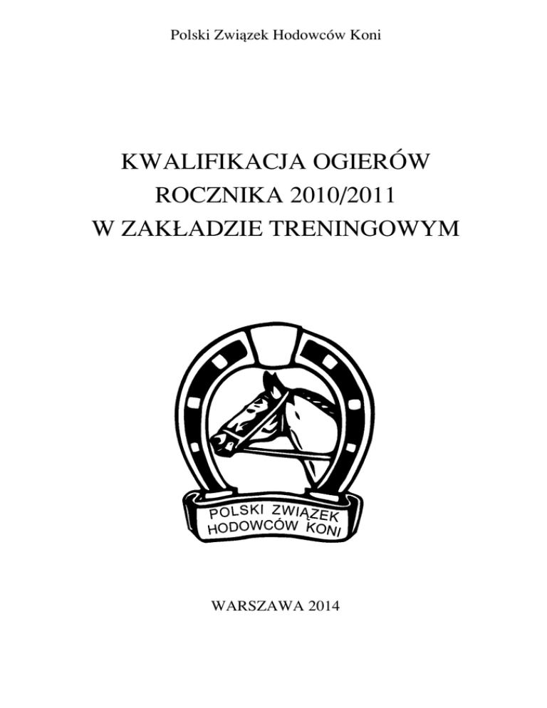 Polski Zwi¹zek Hodowców Koni KWALIFIKACJA OGIERÓW ROCZNIKA 2010/2011 W ZAK£ADZIE TRENINGOWYM WARSZAWA 2014 1 POLSKI ZWIAZEK HODOWCÓW KONI REDAKCJA KSI¥G STADNYCH 00-673 WARSZAWA ul. Koszykowa 60/62 m. 16 tel. 0-22-628-98-38 faks 0-22-628-68-79 ISSN 1508-7417 Wszelkie prawa PZHK zastrze¿one. Przedruk i kopiowanie materia³ów zawartych w Katalogu w ca³oœci lub czêœciowo wymaga pisemnego zezwolenia PZHK Nak³ad egz. 75 szt. Cena 10 z³ (w tym 23% VAT) 2 INDEKS A L ALAN ............................................. 24 APORT ........................................... 14 AREBUS ........................................ 37 ATOMIUM L ................................. 42 LANDGRAF II ............................... 40 LARKIN ......................................... 39 L-MONSTER.................................. 21 M B MEQINI .......................................... 33 BLACK JACK AK......................... 31 BOLID ............................................ 15 BULWAR....................................... 28 O C P CAIRO AK ..................................... 32 CANTO AMICOR ......................... 46 CASANDER AK............................ 41 COSMIC ROMEO AK................... 30 Q ORTON L ....................................... 43 PROWOKATOR ............................ 27 PRZEDŚWIT BARAŻ.................... 17 QUENTIN Z ................................... 34 E R EROTYK ........................................ 25 EXCALIBUR M............................. 23 RUBIN S......................................... 29 S G GERSHWIN ................................... 22 GOLD QUATERBACK................. 35 G-SHOCK ...................................... 18 SENTIDO ....................................... 16 SEPTIMO ....................................... 19 H TARANTINO ................................. 26 H-ELDORADO .............................. 45 HUNCWOT.................................... 36 V T VAN SOLDIER .............................. 44 J W JAGUAR ........................................ 13 WENYLL........................................ 20 K KASZMIR ...................................... 38 3 4 Stacjonarny trening ogierów ras szlachetnych w 2014 r. Terminy kwalifikacji i prób dzielności w 2014 r. Rodzaj próby ZT Data kwalifikacji Data próby Ogiery szlachetne – m, wlkp, sp i import. ZT Bielice (trening wierzchowy) 24‐25 czerwca 02‐03 października Ogiery śląskie, szlachetne (trening zaprzęgowy) 12 sierpnia 10‐11 października ZT Książ Opłaty KOSZT (brutto): • 100‐dniowego treningu wierzchowego wynosi 6.000 zł • 60‐dniowego treningu zaprzęgowego wynosi 3.000 zł W przypadku zaakceptowania przez Ministerstwo Rolnictwa i Rozwoju Wsi złożonego przez PZHK programu dotowania oceny wartości użytkowej ogierów poddawanych 60/100‐dniowemu treningowi, będzie możliwość dofinansowania przez PZHK do 70% kosztów takiego treningu. Zgłoszenia W zgłoszeniu ogiera do OZHK/WZHK należy podać jego nazwę i numer identyfikacyjny (z paszportu), dane właściciela (imię, nazwisko/nazwę, NIP, PESEL/REGON, serię i numer dowodu osobistego właściciela, adres, numer telefonu kontaktowego) z adnotacją, że jest to zgłoszenie ogiera do ZT. Dane te będą niezbędne w związku z podpisywaniem przez PZHK umowy z właścicielami ogierów zakwalifikowanych do treningu. Badania markerów genetycznych Ogiery zakwalifikowane do treningu muszą mieć potwierdzone pochodzenie po obojgu rodzicach. W tym celu lekarz weterynarii pracujący na zlecenie Zakładu Treningowego pobiera krew zakwalifikowanym ogierom i wysyła ją do analizy. Pochodzenie potwierdza się na podstawie badań markerów genetycznych ogiera i jego rodziców. Jeśli wynik badania wykaże niezgodność pary rodzicielskiej, ogier zostanie wycofany z treningu. W takiej sytuacji koszty pobytu i treningu ogiera w ZT pokrywa właściciel. UWAGA: PZHK pokrywa koszty badań markerów genetycznych tylko w przypadku ogierów zakwalifikowanych do treningu . Ogiery hodowli zagranicznej Ogiery zagraniczne (z właściwych ksiąg stadnych – patrz strona: www.pzhk.pl) muszą zostać zgłoszone do właściwego OZHK/WZHK oraz wpisane do bazy PZHK. Należy pamiętać, iż w paszporcie zagranicznym ogiera 5 winien być wpisany polski właściciel, a dokonać tego winien związek rodzimy (czyli zagraniczny), który wydał paszport. W celu zarejestrowania ogiera hodowli zagranicznej w polskiej bazie pracownik odpowiedniego OZHK/WZHK musi zidentyfikować konia, m. in. poprzez porównanie z opisem graficznym w jego paszporcie. Pracownik OZHK/WZHK wykonuje kserokopię stron z paszportu: z datą urodzenia i nazwą, z rodowodem i opisem oraz ze stroną z wpisanym polskim właścicielem i nazwą pod jaką został zarejestrowany koń. Jeżeli dokumenty konia nie zostały wystawione w języku angielskim, francuskim lub niemieckim, właściciel jest zobowiązany przetłumaczyć je u tłumacza przysięgłego i tłumaczenie to wraz z oryginalnym dokumentem hodowlanym dostarczyć do OZHK/WZHK. Zdrowie Ogiery muszą posiadać świadectwo zdrowia wystawione przez lekarza weterynarii oraz paszport konia z wpisanymi szczepieniami przeciwko grypie. Brak szczepień bądź jakiekolwiek nieprawidłowości w schemacie szczepień spowodują niedopuszczenie ogiera do kwalifikacji. Obowiązuje następujący schemat szczepień: 1. szczepienia bazowe: o pierwsze szczepienie – w dniu rozpoczęcia szczepień o drugie szczepienie – nie wcześniej niż 21. dnia i nie później niż 92. dnia od pierwszego szczepienia 2. szczepienie przypominające: o co 6 miesięcy od ostatniego szczepienia (dopuszczalny jest 21‐dniowy okres przekroczenia terminu); o żadne szczepienie przypominające nie może się odbyć później niż 7 dni przed przybyciem na kwalifikację. W przypadku wszelkiego rodzaju zmian skórnych, właściciel zobligowany jest przedstawić wynik badania laboratoryjnego z okresu nie wcześniej niż dwu tygodni przed kwalifikacją. Brak w