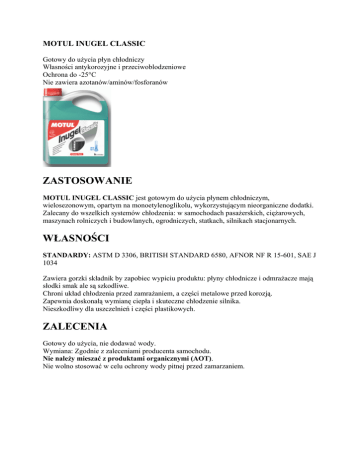 MOTUL INUGEL CLASSIC Gotowy do użycia płyn chłodniczy Własności antykorozyjne i przeciwoblodzeniowe Ochrona do -25°C Nie zawiera azotanów/aminów/fosforanów ZASTOSOWANIE MOTUL INUGEL CLASSIC jest gotowym do użycia płynem chłodniczym, wielosezonowym, opartym na monoetylenoglikolu, wykorzystującym nieorganiczne dodatki. Zalecany do wszelkich systemów chłodzenia: w samochodach pasażerskich, ciężarowych, maszynach rolniczych i budowlanych, ogrodniczych, statkach, silnikach stacjonarnych. WŁASNOŚCI STANDARDY: ASTM D 3306, BRITISH STANDARD 6580, AFNOR NF R 15-601, SAE J 1034 Zawiera gorzki składnik by zapobiec wypiciu produktu: płyny chłodnicze i odmrażacze mają słodki smak ale są szkodliwe. Chroni układ chłodzenia przed zamrażaniem, a części metalowe przed korozją. Zapewnia doskonałą wymianę ciepła i skuteczne chłodzenie silnika. Nieszkodliwy dla uszczelnień i części plastikowych. ZALECENIA Gotowy do użycia, nie dodawać wody. Wymiana: Zgodnie z zaleceniami producenta samochodu. Nie należy mieszać z produktami organicznymi (AOT). Nie wolno stosować w celu ochrony wody pitnej przed zamarzaniem. MOTUL INUGEL EXPERT Gotowy do użycia płyn chłodniczy Własności antykorozyjne i przeciwoblodzeniowe Ochrona do -30°C Nie zawiera azotanów/aminów/fosforanów ZASTOSOWANIE MOTUL INUGEL EXPERT jest gotowym do użycia płynem chłodniczym, opartym na monoetylenoglikolu, łączący technologię organiczną i nieorganiczną, tzw. dodatki hybrydowe. Produkt ten można mieszać z wszystkimi płynami chłodniczymi opartymi na monoetylenoglikolu. Zalecany do wszelkich systemów chłodzenia: w samochodach pasażerskich, ciężarowych, maszynach rolniczych i budowlanych, ogrodniczych, statkach, silnikach stacjonarnych. WŁASNOŚCI Zawiera składnik zgorzkniający w celu zapobieżenia wypiciu produktu: płyny chłodnicze i odmrażacze mają słodki smak ale są szkodliwe. Chroni układ chłodzenia przed zamrażaniem, a części metalowe przed korozją. Zapewnia doskonałą wymianę ciepła i skuteczne chłodzenie silnika. Zarówno krzemiany jak i kwasy organiczne zapewniają właściwości antykorozyjne, które utrzymują się pomimo starzenia się produktu. Nieszkodliwy dla uszczelnień i części plastikowych. ZALECENIA Gotowy do użycia, nie dodawać wody. Wymiana: Zgodnie z zaleceniami producenta samochodu. Nie wolno stosować w celu ochrony wody pitnej przed zamarzaniem. MOTUL INUGEL EXPERT ULTRA Płyn chłodniczy w koncentracie Własności antykorozyjne i przeciwoblodzeniowe Nie zawiera azotanów/aminów/fosforanów ZASTOSOWANIE MOTUL INUGEL EXPERT ULTRA jest skoncentrowanym płynem chłodniczym, który należy zmieszać z miękką wodą w celu uzyskania płynu chłodniczego, opartym na monoetylenoglikolu, oraz mieszaniny organicznych i nieorganicznych dodatków - technologia hybrydowa. Ten produkt może być mieszany z wszystkimi płynami chłodniczymi opartymi na monoetylenoglikolu. Zalecany do wszelkich systemów chłodniczych: samochodów osobowych, ciężarowych, maszyn budowlanych, drogowych i rolniczych, statków i silników stacjonarnych. WŁASNOŚCI Zawiera składnik zgorzkniający w celu zapobieżenia wypiciu produktu: płyny chłodnicze i odmrażacze mają słodki smak ale są szkodliwe. Chroni układ chłodzenia przed zamrażaniem, a części metalowe przed korozją. Zapewnia doskonałą wymianę ciepła i skuteczne chłodzenie silnika. Zarówno krzemiany jak i kwasy organiczne zapewniają właściwości antykorozyjne, które utrzymują się pomimo starzenia się produktu. Nieszkodliwy dla uszczelnień i części plastikowych. ZALECENIA Nie należy stosować produktu w czystej postaci. Mieszać z miękką wodą by uzyskać żądany poziom zabezpieczenia przed mrozem: porównaj z tabelą. W celu utrzymania właściwości antykorozyjnych nie należy rozpuszczać poniżej 33%. Woda do zmieszania: Jeśli to możliwe używać miękkiej wody: maksymalna twardość 35°Fr a zawartość chloranów i siarczanów maksymalnie 50ppm. Wymiana: zgodnie z zaleceniem producenta. Nie wolno stosować tego produktu w celu ochrony wody pitnej przed zamarzaniem. MOTUL INUGEL OPTIMAL Gotowy do użycia płyn chłodniczy Własności antykorozyjne i przeciwoblodzeniowe Ochrona do -30°C TECHNOLOGIA AOT Nie zawiera azotanów/aminów/fosforanów ZASTOSOWANIE MOTUL INUGEL OPTIMAL jest gotowym do użycia płynem chłodniczym, opartym na monoetylenoglikolu, wykorzystujący dodatki organiczne (AOT). Zalecany do wszelkich systemów chłodzenia: w samochodach pasażerskich, ciężarowych, maszynach rolniczych i budowlanych, ogrodniczych, statkach, silnikach stacjonarnych. WŁASNOŚCI Zawiera składnik zgorzkniający w celu zapobieżenia wypiciu produktu: płyny chłodnicze i odmrażacze mają słodki smak ale są szkodliwe. Optymalna ochrona systemu chłodzenia przed mrozem i a części metalowych przed korozją. Technologia AOT zapewnia doskonałą wymianę ciepła, a w ten sposób skuteczne chłodzenie silnika i zapobiega przegrzaniu. Technologia organiczna zapewnia właściwości antykorozyjne, również w wysokich temperaturach, które utrzymują się w miarę starzenia się produktu. Niskie zużycie inhibitorów korozji zapewnia długi okres trwałości między wymianami. Ochrona pomp wodnych, zapobiega osadzaniu się kamienia. Nieszkodliwe dla uszczelnień i części plastikowych. ZALECENIA Gotowy do użycia, nie dodawać wody. Wymiana: Zgodnie z zaleceniami producenta samochodu. Nie należy mieszać z produktami nieorganicznymi. Nie wolno stosować w celu ochrony wody pitnej przed zamarzaniem. MOTUL INUGEL OPTIMAL ULTRA Płyn chłodniczy w koncentracie Własności antykorozyjne i przeciwoblodzeniowe TECHNOLOGIA AOT Nie zawiera azotanów/aminów/fosforanów ZASTOSOWANIE MOTUL INUGEL OPTIMAL ULTRA jest skoncentrowanym płynem chłodniczym, który należy zmieszać z miękką wodą w celu uzyskania płynu chłodniczego, opartym na monoetylenoglikolu, oraz dodatkach organicznyc