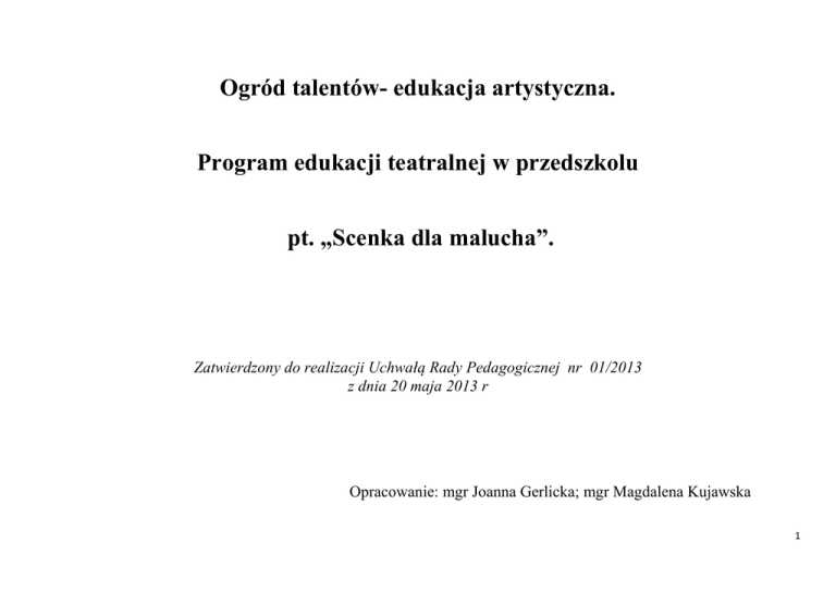 Ogród talentów- edukacja artystyczna. Program edukacji teatralnej w przedszkolu pt. „Scenka dla malucha”. Zatwierdzony do realizacji Uchwałą Rady Pedagogicznej nr 01/2013 z dnia 20 maja 2013 r Opracowanie: mgr Joanna Gerlicka; mgr Magdalena Kujawska 1 Wstęp Zabawy w teatr dają dziecku radość i zapewniają rozwój. Edukacja teatralna wkracza w życie małego dziecka w okresie, w którym jest ono najbardziej twórcze. Przedszkolak angażując się w zabawy o charakterze teatralnym, robi to, ponieważ sprawia mu ogromną radość i przyjemność. Silna, wrodzona potrzeba fikcji, przekształcania rzeczywistego świata czynne uczestniczenie w wielkiej przygodzie, stanowią odpowiednie pole do kształtowania: wrażliwości estetycznej, moralnej i społecznej. Edukacja teatralna pozwala ukształtować dziecko jako aktora, który będzie odczuwał potrzebę kontaktu z teatrem, będzie reagował na barwę, muzykę, światło, piękno słowa i ruchu. Przedszkolak w zabawie raz jest jej reżyserem, innym razem aktorem, widzem, jak również twórcą nowego świata - teatru zabawy. Dziecko nie jest zawodowym aktorem, ono bawi się w teatr, tak więc zadania aktorskie nie mogą przekraczać możliwości dzieci, krępować ich i pozbawiać własnej osobowości. Atmosfera swobody i radości powinna dawać uczestnikom zabawy w teatr poczucie odprężenia i bezpieczeństwa. Stosowanie form teatralnych pomaga rozwijać dzieci we wszystkich sferach. 1. Adresaci i warunki wdrożeniowe Program jest kontynuacją działań artystycznych ostatnich dwóch lat. Realizuje on zadania edukacyjne i wychowawcze określone w podstawie programowej wychowania przedszkolnego. Ponadto rozwija uzdolnienia artystyczne swoich wychowanków poprzez różnorodne formy aktywności twórczej. Program „Scenka dla malucha” to cykl zajęć dotyczących tworzenia widowiska teatralnego. Celem jest zapoznanie dziecka ze sztuką teatralną, poznanie środków wyrazu artystycznego stosowanych w teatrze, kształcenie umiejętności dramatycznych podczas zabaw twórczych, wprowadzenie elementów gry aktorskiej w tworzonych przez grupę widowiskach teatralnych, zakończonych występem przed publicznością, tj. rodzicami, dziećmi w przedszkolu oraz prezentowanie spektaklu na zajęciach otwartych dla nauczycieli w formie warsztatów metodycznych. Innowacją jest wspólna gra aktorska dzieci z nauczycielami tworzącymi program teatralny. Adresatami tego programu są dzieci 4, 5 letnie. Program zakłada realizację po jednej godzinie tygodniowo dla każdej z tych grup (2 godziny tygodniowo łącznie). Program jest kierowany do dwóch grup przedszkolnych, celem wyrównywania szans edukacyjnych. 2 2. Cele programu Cele ogólne: Rozwijanie dziecięcej wrażliwości na żywe słowo, poprzez zabawy parateatralne wyzwalające aktywność ruchową i pantomimiczną dzieci Wyrażanie uczuć i nastrojów poprzez różne formy ekspresji Cele szczegółowe: Wie co to jest teatr, aktor, reżyser, teatr, widz. Potrafi wejść na scenę i odtworzyć tekst wiersza Odgrywa określone scenki poprzez mimikę, ruch, słowa Używa większego zasobu słów Posługuje się rekwizytami w odgrywanych scenkach. Uczestniczy w przedstawieniach teatralnych na terenie przedszkola oraz w placówkach kulturalnych. 3. Przewidywane osiągnięcia wychowanków Przestrzega reguł obowiązujących w społeczności dziecięcej; współdziała w sytuacjach zadaniowych Mówi poprawnie pod względem artykulacyjnym, gramatycznym, fleksyjnym i składniowym Mówi płynnie, niezbyt głośno, dostosowując ton głosu do sytuacji Wie, jak należy się zachować podczas teatrzyku, konkursu, przedstawieniu w teatrze Odgrywa role w zabawach parateatralnych, posługując się mowa, mimiką, gestem i ruchem; posługuje się rekwizytami Śpiewa piosenki z dziecięcego repertuaru; chętnie uczestniczy w zbiorowym śpiewie, w tańcach i muzykowaniu Tworzy muzykę korzystając z instrumentów perkusyjnych oraz innych przedmiotów), a także improwizuje ja ruchem Umie wypowiadać się w różnych technikach plastycznych i przy użyciu elementarnych środków wyrazu (takich jak: kształt i barwa) 3 Dysponuje sprawnością rąk oraz koordynacją wzrokowo-ruchową potrzebną do rysowania, wycinania Potrafi słuchać ze zrozumieniem bajek, baśni, opowiadań i rozmawia o nich; interesuje się książkami 4. Treści kształcenia Zapoznanie z pojęciem teatr (funkcje, rodzaje); Poznanie słownictwa związanego z teatrem (scena, widownia, widz, kurtyna, aktor, narrator, rekwizyty, „żywa” scenografia); Zapoznanie z zawodami związanymi z teatrem (reżyser, scenarzysta, aktor) oraz pełnienie ich roli; Słuchanie bajek, opowiadań, wierszy – bliższe poznawanie bohaterów; Organizowanie zabaw w teatr; Wygłaszanie krótkich scenek dramowych, pantomimicznych, z użyciem kukiełek; Tworzenie dalszego ciągu opowiadań, bajek; Organizowanie zabaw i ćwiczeń słownych, artykulacyjnych, oddechowych; Inscenizowanie ruchem treści literackich; Udział w spektaklach teatralnych w wykonaniu aktorów teatralnych np. teatry dojazdowe, teatrzyki, kukiełkowe; Uświetnianie występami różnych uroczystości przedszkolnych; Udział w przeglądach teatralnych oraz konkursach dla dzieci; Utworzenie kącika teatralnego oraz garderoby strojów w przedszkolu. 5. Metody i formy pracy oraz sposoby realizacji Mając na uwadze to, jak wiele walorów posiadają zajęcia artystyczne prowadzone w grupach przedszkolnych, które dla dziecka są początkiem prawdziwych wewnętrznych przeżyć, planując realizację naszego programu, postanowiłyśmy posłużyć się metodami pozwalającymi na angażowanie różnych zmysłów, zachęcających do twórczego działania. 4 Wdrażając nasz program, kontynuować będziemy kształcenie wielostronne. Strategia ta sprowadza się do takiego zróżnicowania i zharmonizowania metod uczenia się, aby umożliwiały dzieciom zdobywanie wiedzy o świecie i zmienianie się poprz