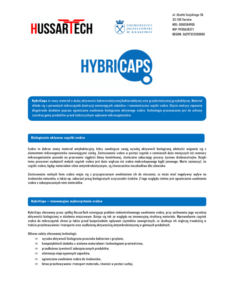 ul. Józefa Szujskiego 36 33-100 Tarnów KRS: 0000584900 NIP: 9930658371 REGON: 36297353500000 HybriCaps to nowy materiał o dużej aktywności bakteriostatycznej/bakteriobójczej oraz grzybostatycznej/grzybobójczej. Materiał składa się z porowatych mikrocząstek (matrycy) zawierających submikro- i nanometryczne cząstki srebra. Użycie matrycy zapewnia długotrwałe działanie poprzez ograniczone uwalnianie biologicznie aktywnego srebra. Technologia przeznaczona jest do ochrony szerokiej gamy produktów przed niekorzystnym wpływem mikroorganizmów. Biologicznie aktywne cząstki srebra Srebro to dobrze znany materiał antybakteryjny, który zawdzięcza swoją wysoką aktywność biologiczną zdolności wiązania się z elementami mikroorganizmów zawierającymi siarkę. Zastosowanie srebra w postaci cząstek o rozmiarach dużo mniejszych niż rozmiary mikroorganizmów pozwala na przerwanie ciągłości błony komórkowej, skutecznie zaburzając procesy życiowe drobnoustrojów. Dzięki temu procesowi wydajność małych cząstek srebra jest dużo większa niż srebra makroskopowego bądź jonowego. Warto zaznaczyć, że cząstki srebra, będąc materiałem silnie antymikrobiotycznym, są równocześnie nieszkodliwe dla człowieka. Zastosowanie wolnych form srebra wiąże się z przyspieszonym uwalnianiem ich do otoczenia, co może mieć negatywny wpływ na środowisko naturalne, a także np. zaburzać pracę biologicznych oczyszczalni ścieków. Z tego względu istotne jest ograniczenie uwalniania srebra z zabezpieczonych nimi materiałów. HybriCaps – innowacyjne wykorzystanie srebra HybriCaps oferowany przez spółkę HussarTech rozwiązuje problem niekontrolowanego uwalniania srebra, przy zachowaniu jego wysokiej aktywności biologicznej w działaniu miejscowym. Dzieje się tak ze względu na innowacyjną strukturę materiału. Wprowadzenie cząstek srebra do mikrocząstek chroni je także przed bezpośrednim wpływem czynników zewnętrznych, co skutkuje ich większą trwałością w trakcie przechowywania i transportu oraz wydłużoną aktywnością antymikrobiotyczną w gotowych produktach. Główne zalety oferowanej technologii: • wysoka aktywność biologiczna przeciwko bakteriom i grzybom, • kompatybilność dodatku z wieloma materiałami i technologiami przetwórstwa, • przedłużona żywotność zabezpieczonych produktów, • eliminacja nieprzyjemnych zapachów, • ograniczone uwalnianie srebra do środowiska, • łatwe przechowywanie i transport materiału, również w postaci suchej. ul. Józefa Szujskiego 36 33-100 Tarnów KRS: 0000584900 NIP: 9930658371 REGON: 36297353500000 Mechanizm działania HybriCaps oraz ich zastosowanie HybriCaps pozwala na wydajną eliminację mikroorganizmów poprzez ich kontakt z aktywnymi cząstkami srebra znajdującymi się w zabezpieczonym materiale. W przypadku produktów niezabezpieczonych dodatkiem antymikrobiotycznym może dochodzić do tworzenia się na ich powierzchni biofilmów. Biofilmy mogą z kolei prowadzić do degradacji materiału, obniżenia estetyki produktu, wytwarzania nieprzyjemnych zapachów, a nawet stanowić ogniska szerzenia się zakażeń. Produkt niezabezpieczony HybriCaps Produkt zabezpieczony HybriCaps Skuteczność technologii została potwierdzona w badaniach z użyciem różnych szczepów bakterii i grzybów. Materiał został zastosowany m.in. do ochrony wysokiej jakości tworzyw poliamidowych, filmów lateksowych i nitrylowych oraz farb proszkowych. Możliwości zastosowania HybriCaps są jednak znacznie szersze, gdyż matryca umożliwia zastosowanie go także do ochrony innych tworzyw sztucznych, włókien, lakierów, żywic epoksydowych, poliestrowych, poliuretanów oraz papieru. Folia nitrylowa zabezpieczona HybriCaps - wyraźnie widoczna strefa zahamowania wzrostu grzyba Asperigillus niger Poliamid zabezpieczony HybriCaps - na czerwono zaznaczona strefa zahamowania wzrostu Staphylococcus aureus HussarTech Sp. z o.o. oferuje możliwość współpracy producentom, którzy poszukują efektywnego zabezpieczenia bakterio- i grzybobójczego swoich produktów. Dalsze informacje: Anna Ogar Prezes Zarządu HussarTech Sp. z o.o. tel. 507-388-720, email: [email protected] www.hussartech.com
