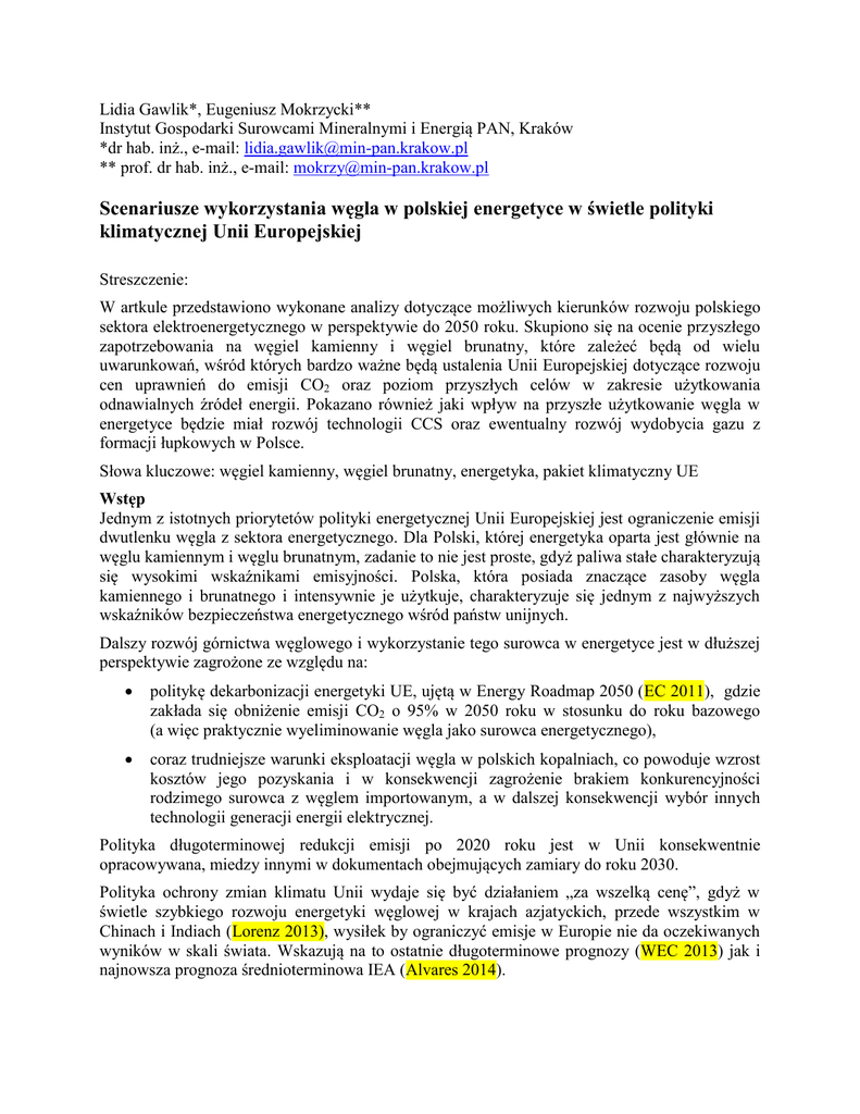 Lidia Gawlik*, Eugeniusz Mokrzycki** Instytut Gospodarki Surowcami Mineralnymi i Energią PAN, Kraków *dr hab. inż., e-mail: [email protected] ** prof. dr hab. inż., e-mail: [email protected] Scenariusze wykorzystania węgla w polskiej energetyce w świetle polityki klimatycznej Unii Europejskiej Streszczenie: W artkule przedstawiono wykonane analizy dotyczące możliwych kierunków rozwoju polskiego sektora elektroenergetycznego w perspektywie do 2050 roku. Skupiono się na ocenie przyszłego zapotrzebowania na węgiel kamienny i węgiel brunatny, które zależeć będą od wielu uwarunkowań, wśród których bardzo ważne będą ustalenia Unii Europejskiej dotyczące rozwoju cen uprawnień do emisji CO2 oraz poziom przyszłych celów w zakresie użytkowania odnawialnych źródeł energii. Pokazano również jaki wpływ na przyszłe użytkowanie węgla w energetyce będzie miał rozwój technologii CCS oraz ewentualny rozwój wydobycia gazu z formacji łupkowych w Polsce. Słowa kluczowe: węgiel kamienny, węgiel brunatny, energetyka, pakiet klimatyczny UE Wstęp Jednym z istotnych priorytetów polityki energetycznej Unii Europejskiej jest ograniczenie emisji dwutlenku węgla z sektora energetycznego. Dla Polski, której energetyka oparta jest głównie na węglu kamiennym i węglu brunatnym, zadanie to nie jest proste, gdyż paliwa stałe charakteryzują się wysokimi wskaźnikami emisyjności. Polska, która posiada znaczące zasoby węgla kamiennego i brunatnego i intensywnie je użytkuje, charakteryzuje się jednym z najwyższych wskaźników bezpieczeństwa energetycznego wśród państw unijnych. Dalszy rozwój górnictwa węglowego i wykorzystanie tego surowca w energetyce jest w dłuższej perspektywie zagrożone ze względu na: politykę dekarbonizacji energetyki UE, ujętą w Energy Roadmap 2050 (EC 2011), gdzie zakłada się obniżenie emisji CO2 o 95% w 2050 roku w stosunku do roku bazowego (a więc praktycznie wyeliminowanie węgla jako surowca energetycznego), coraz trudniejsze warunki eksploatacji węgla w polskich kopalniach, co powoduje wzrost kosztów jego pozyskania i w konsekwencji zagrożenie brakiem konkurencyjności rodzimego surowca z węglem importowanym, a w dalszej konsekwencji wybór innych technologii generacji energii elektrycznej. Polityka długoterminowej redukcji emisji po 2020 roku jest w Unii konsekwentnie opracowywana, miedzy innymi w dokumentach obejmujących zamiary do roku 2030. Polityka ochrony zmian klimatu Unii wydaje się być działaniem „za wszelką cenę”, gdyż w świetle szybkiego rozwoju energetyki węglowej w krajach azjatyckich, przede wszystkim w Chinach i Indiach (Lorenz 2013), wysiłek by ograniczyć emisje w Europie nie da oczekiwanych wyników w skali świata. Wskazują na to ostatnie długoterminowe prognozy (WEC 2013) jak i najnowsza prognoza średnioterminowa IEA (Alvares 2014). W tym artykule przedstawiono kilka scenariuszy wykorzystania węgla kamiennego i węgla brunatnego do 2050 roku. Są one podsumowaniem i rozwinięciem niektórych tez postawionych w pracy, wykonanej przez Instytut Gospodarki Surowcami Mineralnymi i Energią PAN na zlecenie Górniczej Izby Przemysłowo-Handlowej (Gawlik (red.) 2013). Polityka klimatyczna Unii Europejskiej Pretendując do miana światowego lidera w działaniach na rzecz ograniczenia zmian klimatu, Unia Europejska nakłada na kraje członkowskie zobowiązania, których realizacja na razie jest obowiązującą do roku 2020. Pakiet energetyczno-klimatyczny „3x20” zaakceptowany w grudniu 2008 r. na unijnym szczycie wprowadził w życie cele na rok 2020 przyjęte w marcu 2007 roku przez Komisję Europejską, polegające na redukcji o 20% emisji gazów cieplarnianych, wzrost efektywności energetycznej o 20% oraz 20% udział odnawialnych źródeł energii w bilansie energetycznym. Ambicje Unii Europejskiej nie kończą się na tym. Dalsze, długoterminowe plany dotyczące ochrony klimatu przedstawiono w Energy Road Map 2050 (EC 2011). Propozycje Komisji Europejskiej w sprawie celów polityki energetycznoklimatycznej na 2030 r. są obecnie na etapie roboczych dyskusji (KE 2013). KE zaproponowała m.in. redukcję emisji CO2 o 40% w stosunku do roku 1990, 27% udział źródeł odnawialnych (OZE) w produkcji energii elektrycznej dla całej UE oraz reformę systemu handlu uprawnieniami do emisji (ETS), zakładającą możliwość ingerowania przez Komisję w jego mechanizm rynkowy. Decyzje co do poziomu i kierunków tych zobowiązań nie są jeszcze znane, a wiele krajów (w tym zwłaszcza Polska), nie negując szczytnego celu ograniczania emisji gazów cieplarnianych, broni się przed precyzyjnym wyznaczaniem sposobów ograniczania tej emisji. Wyznaczenie kilku celów równocześnie powoduje bowiem, że przestaje być możliwe opracowanie indywidualnej dla poszczególnych krajów strategii, która brałaby pod uwagę specyficzne cechy poszczególnych gospodarek narodowych. Jednakże, budując strategię rozwoju krajowego systemu energii, należy brać pod uwagę ewentualność wprowadzenia przez Unię takich zobowiązań. Dwa elementy polityki klimatycznej Unii, które będą miały zasadniczy wpływ na możliwy kierunek rozwoju sektora energii w Polsce w perspektywie 2050 roku i koszty jakie kraj będzie musiał ponieść, to wielkość dopuszczalnej emisji CO2 do atmosfery oraz obligatoryjny poziom energii ze źródeł odnawialnych w zużyciu finalnym energii elektrycznej. Zastosowana metodyka badawcza i przyjęte założenia W analizach zastosowano metody modelowania matematycznego, wykorzystując modele zaimplementowane na platformach komputerowych, dedykowane do analiz systemów paliwowoenergetycznych (Gawlik (red.) 2013). Model wybiera technologie wytwarzania energii elektrycznej tak, aby możliwe było wyprodukowanie wymaganej ilości energii pokrywającej przewidywane zapotrzebowanie. Zadaną funkcją celu jest minimalizacja łącznych kosztów systemowych w całym okresie do 20
