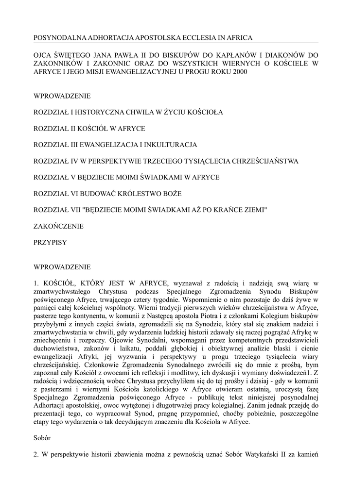 POSYNODALNA ADHORTACJA APOSTOLSKA ECCLESIA IN AFRICA OJCA ŚWIĘTEGO JANA PAWŁA II DO BISKUPÓW DO KAPŁANÓW I DIAKONÓW DO ZAKONNIKÓW I ZAKONNIC ORAZ DO WSZYSTKICH WIERNYCH O KOŚCIELE W AFRYCE I JEGO MISJI EWANGELIZACYJNEJ U PROGU ROKU 2000 WPROWADZENIE ROZDZIAŁ I HISTORYCZNA CHWILA W ŻYCIU KOŚCIOŁA ROZDZIAŁ II KOŚCIÓŁ W AFRYCE ROZDZIAŁ III EWANGELIZACJA I INKULTURACJA ROZDZIAŁ IV W PERSPEKTYWIE TRZECIEGO TYSIĄCLECIA CHRZEŚCIJAŃSTWA ROZDZIAŁ V BĘDZIECIE MOIMI ŚWIADKAMI W AFRYCE ROZDZIAŁ VI BUDOWAĆ KRÓLESTWO BOŻE ROZDZIAŁ VII "BĘDZIECIE MOIMI ŚWIADKAMI AŻ PO KRAŃCE ZIEMI" ZAKOŃCZENIE PRZYPISY WPROWADZENIE 1. KOŚCIÓŁ, KTÓRY JEST W AFRYCE, wyznawał z radością i nadzieją swą wiarę w zmartwychwstałego Chrystusa podczas Specjalnego Zgromadzenia Synodu Biskupów poświęconego Afryce, trwającego cztery tygodnie. Wspomnienie o nim pozostaje do dziś żywe w pamięci całej kościelnej wspólnoty. Wierni tradycji pierwszych wieków chrześcijaństwa w Afryce, pasterze tego kontynentu, w komunii z Następcą apostoła Piotra i z członkami Kolegium biskupów przybyłymi z innych części świata, zgromadzili się na Synodzie, który stał się znakiem nadziei i zmartwychwstania w chwili, gdy wydarzenia ludzkiej historii zdawały się raczej pogrążać Afrykę w zniechęceniu i rozpaczy. Ojcowie Synodalni, wspomagani przez kompetentnych przedstawicieli duchowieństwa, zakonów i laikatu, poddali głębokiej i obiektywnej analizie blaski i cienie ewangelizacji Afryki, jej wyzwania i perspektywy u progu trzeciego tysiąclecia wiary chrześcijańskiej. Członkowie Zgromadzenia Synodalnego zwrócili się do mnie z prośbą, bym zapoznał cały Kościół z owocami ich refleksji i modlitwy, ich dyskusji i wymiany doświadczeń1. Z radością i wdzięcznością wobec Chrystusa przychyliłem się do tej prośby i dzisiaj - gdy w komunii z pasterzami i wiernymi Kościoła katolickiego w Afryce otwieram ostatnią, uroczystą fazę Specjalnego Zgromadzenia poświęconego Afryce - publikuję tekst niniejszej posynodalnej Adhortacji apostolskiej, owoc wytężonej i długotrwałej pracy kolegialnej. Zanim jednak przejdę do prezentacji tego, co wypracował Synod, pragnę przypomnieć, choćby pobieżnie, poszczególne etapy tego wydarzenia o tak decydującym znaczeniu dla Kościoła w Afryce. Sobór 2. W perspektywie historii zbawienia można z pewnością uznać Sobór Watykański II za kamień węgielny naszego wieku, zbliżającego się już do trzeciego tysiąclecia. W kontekście tego wielkiego wydarzenia także Kościół Boży, który jest w Afryce, mógł przeżyć prawdziwe momenty łaski. Istotnie, sama idea spotkania - w takiej czy innej formie - Biskupów Afryki, poświęconego dyskusji o ewangelizacji kontynentu, zrodziła się w okresie Soboru. To historyczne wydarzenie było prawdziwym "tyglem" kolegialności, oraz szczególnym wyrazem afektywnej i efektywnej komunii episkopatu całego świata. Podczas Soboru Biskupi starali się znaleźć właściwe sposoby działania, aby lepiej dzielić się swą troską o wszystkie Kościoły i faktycznie ją sprawować (por. 2 Kor 11, 28); w tym celu zaczęli tworzyć stosowne struktury na szczeblu krajów, regionów i kontynentów. Sympozjum Konferencji Episkopatów Afryki i Madagaskaru 3. W takim właśnie klimacie Biskupi Afryki i Madagaskaru, obecni na Soborze, postanowili utworzyć własny Sekretariat Generalny, mający koordynować ich wystąpienia i przedstawiać w Auli Soborowej - w miarę możliwości - ich wspólny punkt widzenia. Ta pierwsza forma współpracy Biskupów Afryki zyskała później kształt instytucjonalny wraz z utworzeniem w Kampali Sympozjum Konferencji Episkopatów Afryki i Madagaskaru (S.C.E.A.M.). Nastąpiło to podczas wizyty Papieża Pawła VI w Ugandzie na przełomie lipca i sierpnia 1969 r. - pierwszej wizyty papieskiej w Afryce w erze nowożytnej. Zwołanie Specjalnego Zgromadzenia Synodu Biskupów poświęconego Afryce 4. Zgromadzenia Ogólne Synodu Biskupów, odbywające się w regularnych odstępach czasu począwszy od 1967 r., dostarczyły Kościołowi, który jest w Afryce, cennych sposobności do wypowiadania się na powszechnym forum Kościoła. I tak podczas drugiego Zwyczajnego Zgromadzenia Ogólnego (1971 r.) Ojcowie Synodalni Afryki chętnie skorzystali z nadarzającej się okazji, aby domagać się większej sprawiedliwości w świecie. Trzecie Zwyczajne Zgromadzenie Ogólne, poświęcone ewangelizacji we współczesnym świecie (1974 r.), pozwoliło rozważyć przede wszystkim problemy ewangelizacji w Afryce. Przy tej właśnie okazji Biskupi z kontynentu afrykańskiego, obecni na Synodzie, ogłosili ważne orędzie pod tytułem "Współodpowiedzialność za postęp ewangelizacji"2. Niewiele później, w Roku Świętym 1975, zostało zwołane w Rzymie zgromadzenie plenarne S.C.E.A.M., które podjęło głębszą refleksję nad sprawą ewangelizacji. 5. Następnie, w latach 1977-1983, niektórzy Biskupi, kapłani, osoby konsekrowane, teolodzy i wierni świeccy wyrażali życzenie, by został zwołany Sobór albo Synod afrykański, który miałby ocenić stan ewangelizacji Afryki i stworzyć podstawy dla podjęcia doniosłych decyzji dotyczących przyszłości kontynentu. Przyjąłem przychylnie i poparłem ideę "współdziałania w takiej czy innej formie" całego Episkopatu afrykańskiego w celu "zbadania problemów religijnych wspólnych dla całego kontynentu"3. Także S.C.E.A.M. rozpoczęło poszukiwanie dróg i środków, które pozwoliłyby zrealizować projekt takiego kontynentalnego spotkania. Zorganizowano konsultacje, obejmujące Konferencje Episkopatów oraz wszystkich Biskupów Afryki i Madagaskaru: na ich podstawie mogłem zwołać Specjalne Zgromadzenie Synodu Biskupów poświęcone Afryce. 6 stycznia 1989 r. - w uroczystość Objawienia Pańskiego, kiedy to Kościół na nowo uświadamia sobie powszechność swojej misji oraz wynikające z niej zadanie