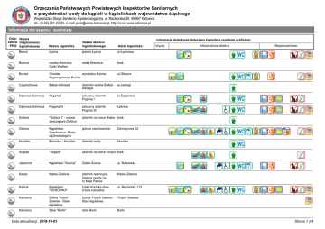Orzeczenia Państwowych Powiatowych Inspektorów Sanitarnych o przydatności wody do kąpieli w kąpieliskach województwa śląskiego Wojewódzka Stacja Sanitarno–Epidemiologiczna, ul. Raciborska 39, 40-957 Katowice, tel.: (0-32) 351-23-00, e-mail: [email protected], http://www.wsse.katowice.pl Informacja dot sezonu: zamknięty Orze- Nazwa czenie miejscowości PPIS kąpieliskowej Informacje dodatkowe dotyczące kąpieliska (symbole graficzne) Nazwa kąpieliska Nazwa akwenu kąpieliskowego Adres kąpieliska Bieruń Łysina jezioro Łysina ul.Łysinowa Brenna rzeaka Brennica, Górki Wielkie rzeka Brennica brak Buków Ośrodek wyrobisko Buków Wypoczynkowy Buków ul.Główna Częstochowa Bałtyk-Adriatyk zbiorniki wodne BałtykAdriatyk ul.Jadwigi Dąbrowa Górnicza Pogoria I sztuczny zbiornik Pogoria I ul.śeglarska Dąbrowa Górnicza Pogoria III sztuczny zbiornik Pogoria III Łęknice Dzibice "Dzibice I" - nazwa zwyczajowa Dzibice zbiornik na rzece Białce brak Gliwice Kąpielisko Czechowice -PlaŜa ogólnodostępna jezioro czechowickie Ziemięcicka 62 Hucisko Boronów - Hucisko zbiornik wody Hucisko Irządze "Irządze" zbiornik na rzece Krztyni brak Jaworzno Kąpielisko "Sosina" Zalew Sosina ul. Bukowska Kalety Kalety-Zielona zbiornik retencyjny Zielona oparty na rz.Mała Panew Kalety-Zielona Kamyk Kąpielisko "BORÓWKA" rzeka Kocinka staw, źródła naturalne ul. Reymonta 113 Katowice Dolina Trzech Stawów - Staw kąpielowy Dolina Trzech stawów Staw kąpielowy Trzech Stawów Katowice Staw "Borki" staw Borki Borki Data aktualizacji: 2010-10-01 WyróŜ. Infrastruktura obiektu Bezpieczeństwo Strona 1 z 4 Orzeczenia Państwowych Powiatowych Inspektorów Sanitarnych o przydatności wody do kąpieli w kąpieliskach województwa śląskiego Wojewódzka Stacja Sanitarno–Epidemiologiczna, ul. Raciborska 39, 40-957 Katowice, tel.: (0-32) 351-23-00, e-mail: [email protected], http://www.wsse.katowice.pl Informacja dot sezonu: zamknięty Orze- Nazwa czenie miejscowości PPIS kąpieliskowej Informacje dodatkowe dotyczące kąpieliska (symbole graficzne) Nazwa kąpieliska Nazwa akwenu kąpieliskowego Adres kąpieliska Katowice Staw "Morawa" staw Morawa Sosnowiecka Kłobuck Zalew "ZAKRZEW" rzeka Biała Oksza Kłobuck Koniecpol Koniecpol rzeka Pilica ul.Armii Krajowej Konopiska Pająk rzeka Konopka ul.Sportowa Kostkowice "Dzibice IV" - nazwa zwyczajowa Kostkowice zbiornik na rzece Białce brak Kuźnia Raciborska Wodnik wyrobisko Wodnik Brzozowa 37 Lubliniec Kokotek staw Posmyk Kokotek Łazy "Łazy" zbiornik na rzece Mitrędze brak Międzybrodzie śywieckie Jezioro jezioro Międzybrodzkie Międzybrodzkie na wysokości Restauracji Nad Wodą Miedzybrodzie śywieckie ul.Energetyków Mysłowice Staw "Hubertus" Szabelnia Nieboczowy Ośrodek Szkoleniowo wyrobisko Nieboczowy Rekreacyjno Wypoczynkowy ,,RAJ" Nowe Chechło Nakło-Chechło zbiornik pochodzenia Leśna sztucznego,bezodpływo wy Nakło-Chechło Ochaby Małe rzeka Wisła, Ochaby rzeka Wisła brak Olza Ośrodek Wypoczynkowy Olza wyrobisko Olza ul.Kolejowa Data aktualizacji: 2010-10-01 staw Hubertus WyróŜ. Infrastruktura obiektu Bezpieczeństwo ul.Rzeczna 1 Strona 2 z 4 Orzeczenia Państwowych Powiatowych Inspektorów Sanitarnych o przydatności wody do kąpieli w kąpieliskach województwa śląskiego Wojewódzka Stacja Sanitarno–Epidemiologiczna, ul. Raciborska 39, 40-957 Katowice, tel.: (0-32) 351-23-00, e-mail: [email protected], http://www.wsse.katowice.pl Informacja dot sezonu: zamknięty Orze- Nazwa czenie miejscowości PPIS kąpieliskowej Informacje dodatkowe dotyczące kąpieliska (symbole graficzne) Nazwa kąpieliska Nazwa akwenu kąpieliskowego Adres kąpieliska Olza przy polu biwakowym brak nazwy ul. Wiejska Pewel Mała Rzeka Koszarawa Pewel Mała - śywiec rzeka Koszarawa Pewel Mała - śywiec Pilica "Pilica" zbiornik na rzece Pilicy brak Pławniowice Kąpielisko Pławniowice-PlaŜa przy duŜym zbiorniku wodnym jezioro pławniowickie PlaŜowa Pławniowice Kąpielisko Pławniowice-PlaŜa przy małym zbiorniku wodnym jezioro pławniowickie brak Ponik Staw Ponik rzeka Wiercica ul.Wczasowa Porąbka rzeka Soła I rzeka Soła brak Porąbka rzeka Soła II rzeka Soła brak Potępa Odmuchów zbiornik retencyjny Odmuchów oparty na rz.Liganzja Odmuchów Przeczyce Przeczyce zbiornik zaporowy Przeczyce Parkowa Pszczyna Łąka jezioro Łąka ul.P.Skargi Rogoźnik Rogoźnik I sztuczny zbiornik Rogoźnik I brak Rogoźnik Rogoźnik II sztuczny zbiornik Rogoźnik II brak Data aktualizacji: 2010-10-01 WyróŜ. Infrastruktura obiektu Bezpieczeństwo Strona 3 z 4 Orzeczenia Państwowych Powiatowych Inspektorów Sanitarnych o przydatności wody do kąpieli w kąpieliskach województwa śląskiego Wojewódzka Stacja Sanitarno–Epidemiologiczna, ul. Raciborska 39, 40-957 Katowice, tel.: (0-32) 351-23-00, e-mail: [email protected], http://www.wsse.katowice.pl Informacja dot sezonu: zamknięty Orze- Nazwa czenie miejscowości PPIS kąpieliskowej Nazwa kąpieliska Nazwa akwenu kąpieliskowego Informacje dodatkowe dotyczące kąpieliska (symbole graficzne) Adres kąpieliska Siamoszyce Kąpielisko przy ośrodku wypoczynkowym "Ciechan Zdrój" w Siamoszycach zbiornik na rzece Krztyni brak Sosnowiec Stawiki staw Stawiki Kresowa Suszec Gwaruś jezioro Gwaruś ul.Baranowicka Szczyrk rzeka śylica rzeka śylica ul. Beskidzka Tarnowskie Góry Pniowiec zbiornik pochodzenia sztucznego Pniowiec Pniowiec Tychy Paprocany jezioro Paprocany ul.Parkowa Ustroń rzeka Wisła, Ustroń rzeka Wisła brak Węgierska Górka Rzeka Soła na wysokości Jazu w Węgierskiej Górce rzeka Soła 3-go Maja Wisła rzeka Wisła, Wisła rzeka Wisła brak Wodzisław Śląski Balaton staw Balaton ul.Bracka Zarzecze Jezioro śywieckie w jezioro śywieckie Zarzeczum ul. Plazowa PlaŜowa Zarzecze Jezioro śywieckie na jezioro śywieckie wysokości Obozu ZHP w Zarzeczu Harcerska Zebrzydowice Staw "Młyńszczok" brak śywiec Jezioro śywieckie na jezioro śywieckie wysokości pensjonatu MEGA Data 