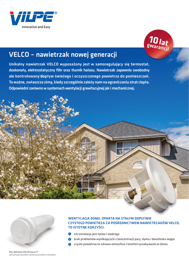 10 VELCO – nawietrzak nowej generacji gwaralnat cji Unikalny nawietrzak VELCO wyposażony jest w samoregulujący się termostat, doskonały, elektrostatyczny filtr oraz tłumik hałasu. Nawietrzak zapewnia swobodny ale kontrolowany dopływ świeżego i oczyszczonego powietrza do pomieszczeń. To ważne, zwłaszcza zimą, kiedy szczególnie zależy nam na ograniczaniu strat ciepła. Odpowiedni zarówno w systemach wentylacji grawitacyjnej jak i mechanicznej. Wentylacja domu, oparta na stałym dopływie czystego powietrza za pośrednictwem nawietrzaków VELCO, to istotne korzyści: ich instalacja jest łatwa i niedroga brak problemów wynikających z koncentracji pary, dymu i dwutlenku węgla czyste powietrze to zdrowa atmosfera i komfort przebywania w domu Filtr dokładny VELCO klasy F7 zatrzymuje wszelkie zanieczyszczenia z zewnątrz. Zalety nawietrzaka VELCO: • Otwarta konstrukcja gwarantuje swobodny przepływ powietrza. • Doskonała filtracja (klasa filtra F7). - każde włókno filtra zawiera stały, elektrostatyczny ładunek, które zwiększają wydajność wychwytywania cząstek - skutecznie zatrzymuje cząstki kurzu i pyłków roślin (powodujące duszności i kaszel), molekuły zapachu, ale także najbardziej niebezpieczne dla zdrowia, mikrocząstki mineralne (w rozmiarze 0,0025 mm przedostające się do krwioobiegu) - posiada wbudowany tłumik hałasu* • Niezawodny w różnych warunkach atmosferycznych. • Łatwy w użyciu. • Wywietrznik wyposażony jest w samoregulujący termostat, który steruje przepływem powietrza w zależności od temperatury zewnętrznej. Termostat w pełni otwiera zawór przy temperaturze +10°C i zamyka go w temperaturze temperaturze poniżej -5°C. • Prosta konstrukcja umożliwia szybką wymianę filtra (jeśli to konieczne). • Łatwy montaż zarówno w istniejącym budynku, jak i w nowobudowanym. • Posiada 10-letnią gwarancję. • Nie wymaga żadnych instalacji elektrycznych. zimne powietrze ciepłe powietrze sypialnia salon sypialnia sypialnia łazienka wc kuchnia * występuje w rozmiarze Ø 100 Wskazówki montażowe: 1. Należy instalować jeden wywietrznik na powierzchnię nie większą niż 20-30 m² (dotyczy rozmiaru ø 100 i w każdym pokojów mieszkalnych (w sypialniach i salonie). Z pozostałych pomieszczeń (kuchnia, toalety, łazienki, garderoba...) zanieczyszczone powietrze jest usuwane przez kanały wentylacyjne. 2. Zalecana miejsce instalacji wywietrznika to ściana naprzeciwko drzwi wejściowych, na wysokość od 220 cm (min.) od podłogi wzwyż. 1. Pamiętaj o wymianie filtra przynajmniej raz w roku wówczas gdy jego powierzchnia jest wyraźnie zabrudzona. Filtr oznaczony jest symbolem FILTRETE VS-100. 2. Używaj krążka wyciszającego tylko w przypadku bezwzględnej konieczności (np. jeśli ściana z wentylem jest tuż przy ulicy) ponieważ użycie krążka zmniejsza przepływ powietrza. WENTYLACJA PODPIWNICZENIA: Wentyl Velco można stosować w połączeniu z przewodem wentylacyjnym Ross (ø 125 i 160), służącym do wentylacji dolnych kondygnacji budynku. Zawór termostatyczny przyda się szczególnie tam gdzie pomieszczenia te pełnią funkcję użytkową. Wówczas, w zależności od potrzeb (np. budynek znajduje się blisko ulicy, a w piwnicy mamy dodatkowy pokój, salon gier, pralnię) montujemy go z filtrem i tłumikiem lub bez. + przewód wentylacyjny Ross (Ø 125 i 160) wentyl Velco wentylacyja dolnych kondygnacji budynku Dostępne rozmiary Ø: 80 mm, 100 mm, 125 mm i 160 mm Dostępne kolory: termostat (wewnątrz budynku): biały, brązowy, czarny kratka zewnętrzna: biały, beżowy, jasny szary, szary, czerwony zestawy produktów nazwa Kolor Zestaw nawiewnik ścienny VELCO Ø 80 Kod szt./ karton dostępność cena detaliczna (PLN) netto 11110 1 Zamówienie 320,00 zł 8841711 1 Zamówienie 30,00 zł Kod szt./ karton dostępność cena detaliczna (PLN) netto 11120 1 Magazyn 355,00 zł 8941712 1 Magazyn 32,00 zł Kod szt./ karton dostępność cena detaliczna (PLN) netto 11130 1 Magazyn 455,00 zł 8841706 1 Magazyn 34,00 zł Kod szt./ karton dostępność cena detaliczna (PLN) netto 11140 1 Magazyn 485,00 zł 8841714 1 Magazyn 34,00 zł Zestaw zawiera: - termostat VT-80 , średnica 80 mm - filtr VS-80 - rura ścienna teleskopowa 43 cm - kratka ścienna zewnętrzna 150 x 150 mm Filtr VS-80 W przypadku konieczności wymiany filtra, możliwość nabycia samego filtra nazwa Kolor Zestaw nawiewnik ścienny VELCO Ø 100 Zestaw zawiera: - termostat VT-100 , średnica 100 mm - filtr VS-100 - tłumik dźwięku - rura ścienna 50 cm - kratka ścienna zewnętrzna 150 x 150 mm Filtr VS-100 W przypadku konieczności wymiany filtra, możliwość nabycia samego filtra nazwa Kolor Zestaw nawiewnik ścienny VELCO Ø 125 Zestaw zawiera: - termostat VT-125 , średnica 125 mm - filtr VS-125 - rura ścienna 50 cm - kratka ścienna zewnętrzna 240 x 240 mm Filtr VS-125 W przypadku konieczności wymiany filtra, możliwość nabycia samego filtra nazwa Kolor Zestaw nawiewnik ścienny VELCO Ø 160 Zestaw zawiera: - termostat VT-160 , średnica 160 mm - filtr VS-160 - rura ścienna teleskopowa 43 cm - kratka ścienna zewnętrzna 240 x 240 mm Filtr VS-160 W przypadku konieczności wymiany filtra, możliwość nabycia samego filtra SK TUOTE POLAND SP. Z O.O. Biuro: +48 71 740 26 23; [email protected] Pietrzykowice, ul. Fabryczna 20d, 55-080 Kąty Wrocławskie, Polska
