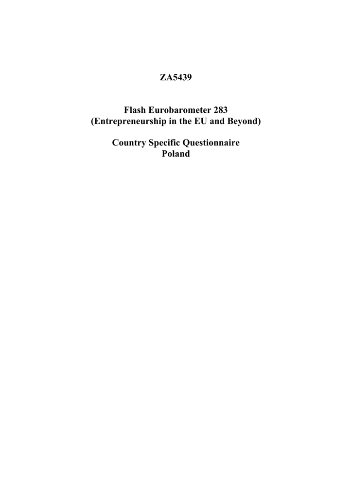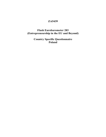 ZA5439 Flash Eurobarometer 283 (Entrepreneurship in the EU and Beyond) Country Specific Questionnaire Poland FLASH 283 ENTREPRENEURSHIP D1. PŁEĆ [NIE PYTAJ ZAZNACZYĆ WŁAŚCIWĄ ODPOWIEDŹ] ‐ Mężczyzna ............................................................................................ 1 ‐ Kobieta ................................................................................................. 2 D2. Ile ma Pan(i) lat? ‐ [_][_]................................................... ODMOWA/BRAK ODPOWIEDZI ‐ [lat] .................................................................................................. 99 D3. Ile miał(a) Pan(i) lat, kiedy ukończył(a) Pan(i) swoją edukację w trybie dziennym? [ZAPYTAĆ O WIEK, W KTÓRYM ZOSTAŁA UKOŃCZONA EDUKACJA] ‐ [_][_]................................................................................................ lat ‐ [ODMOWA/BRAK ODPOWIEDZI]....................................................... 99 ‐ [NIGDY NIE ODBYŁ(A) KSZTAŁCENIA W TRYBIE DZIENNYM] ............. 01 ‐ [JEST W TRAKCIE KSZTAŁCENIA SIĘ W TRYBIE DZIENNYM] ............... 00 D4. Jeśli chodzi o Pana(i) obecny zawód, proszę powiedzieć, czy pracuje Pan(i) na własny rachunek, jest Pana(i) zatrudniony(a), czy też nie prowadzi Pan(i) działalności zawodowej? [ODCZYTAĆ STWIERDZENIA Z LEWEJ NASTĘPNIE POPROSIĆ O SPRECYZOWANIE (“TO ZNACZY”) TYLKO JEDNA ODPOWIEDŹ] Samozatrudniający(a) się Æ i.e. : ‐ rolnik, leśnik, rybak ............................................................................ 11 ‐ właściciel sklepu, rzemieślnik ............................................................. 12 ‐ specjalista wolnego zawodu (prawnik, lekarz, księgowy, architekt,...) ..................................................................................... 13 ‐ Właściciel ‐ szef firmy ......................................................................... 14 ‐ inny .................................................................................................... 15 Zatrudniony(a) w firmie Æ i.e. : Pracownik umysłowy 1 ‐ Zatrudnieni na etacie specjaliści (zatrudnieni lekarze, prawnicy, architekci, księgowi) ....................................................... 21 ‐ Zarząd, główni dyrektorzy, wyższa kadra kierownicza ....................... 22 ‐ Kierownicy .......................................................................................... 23 ‐ Średnia kadra kierownicza ................................................................. 24 ‐ Urzędnik państwowy .......................................................................... 25 ‐ Pracownik biurowy ............................................................................. 26 ‐ inny .................................................................................................... 27 Pracownik fizyczny ‐ kierownik/brygardzista ...................................................................... 31 ‐ Wykwalifikowany pracownik fizyczny ................................................ 32 ‐ pracownik fizyczny niewykwalifikowany ............................................ 33 ‐ inny……………. ...................................................................................... 34 Nie prowadzi działalności zawodowej Æ i.e. : ‐ Osoba zajmująca się domem ............................................................. 41 ‐ student(ka) (w trybie dziennym) ........................................................ 42 ‐ emeryt(ka)/rencist(k)a ...................................................................... 43 ‐ poszukujący(a) pracy .......................................................................... 44 ‐ inny .................................................................................................... 45 ‐ Odmowa/brak odpowiedzi ................................................................ 99 D6. Czy powiedział(a)by Pan(i), że mieszka na...? ‐ obszar wielkomiejski ........................................................................... 1 ‐ inne miasto/ośrodek miejski ................................................................ 2 ‐ obszar wiejski ................................................................................... ... 3 ‐ [Odmowa] ........................................................................................... 9 D7. Proszę powiedzieć jaka jest ‐ lub jaka była ‐ sytuacja zawodowa Pana(i) ojca? Czy pracuje lub pracował na własny rachunek, jest lub był pracownikiem umysłowym w sektorze prywatnym, jest lub był pracownikiem fizycznym w sektorze prywatnym, jest lub był urzędnikiem administracji państwowej lub samorządowej, czy też w ogóle nie pracował? [ODCZYTAĆ – TYLKO JEDNA ODPOWIEDŹ] ‐ pracuje na własny rachunek ................................................................ 1 ‐ pracownik umysłowy w sektorze prywatnym ...................................... 2 ‐ pracownik fizyczny w sektorze prywatnym ......................................... 3 2 ‐ urzędnik państwowy ............................................................................ 4 ‐ nie pracuje/nie pracował zawodowo ................................................... 5 ‐ Inne ...................................................................................................... 6 ‐ [nie wie/brak odpwiedzi] .................................................................... 9 D8. Proszę powiedzieć jaki jest ‐ lub jaki był ‐ zawód Pana(i) matki? Czy pracuje lub pracowała na własny rachunek, jest lub była pracownikiem umysłowym w sektorze prywatnym, jest lub była pracownikiem fizycznym w sektorze prywatnym, jest lub była urzędnikiem administracji państwowej lub samorządowej, czy też w ogóle nie pracowała? [ODCZYTAĆ – TYLKO JEDNA ODPOWIEDŹ] ‐ pracuje na własny rachunek ...........................................................